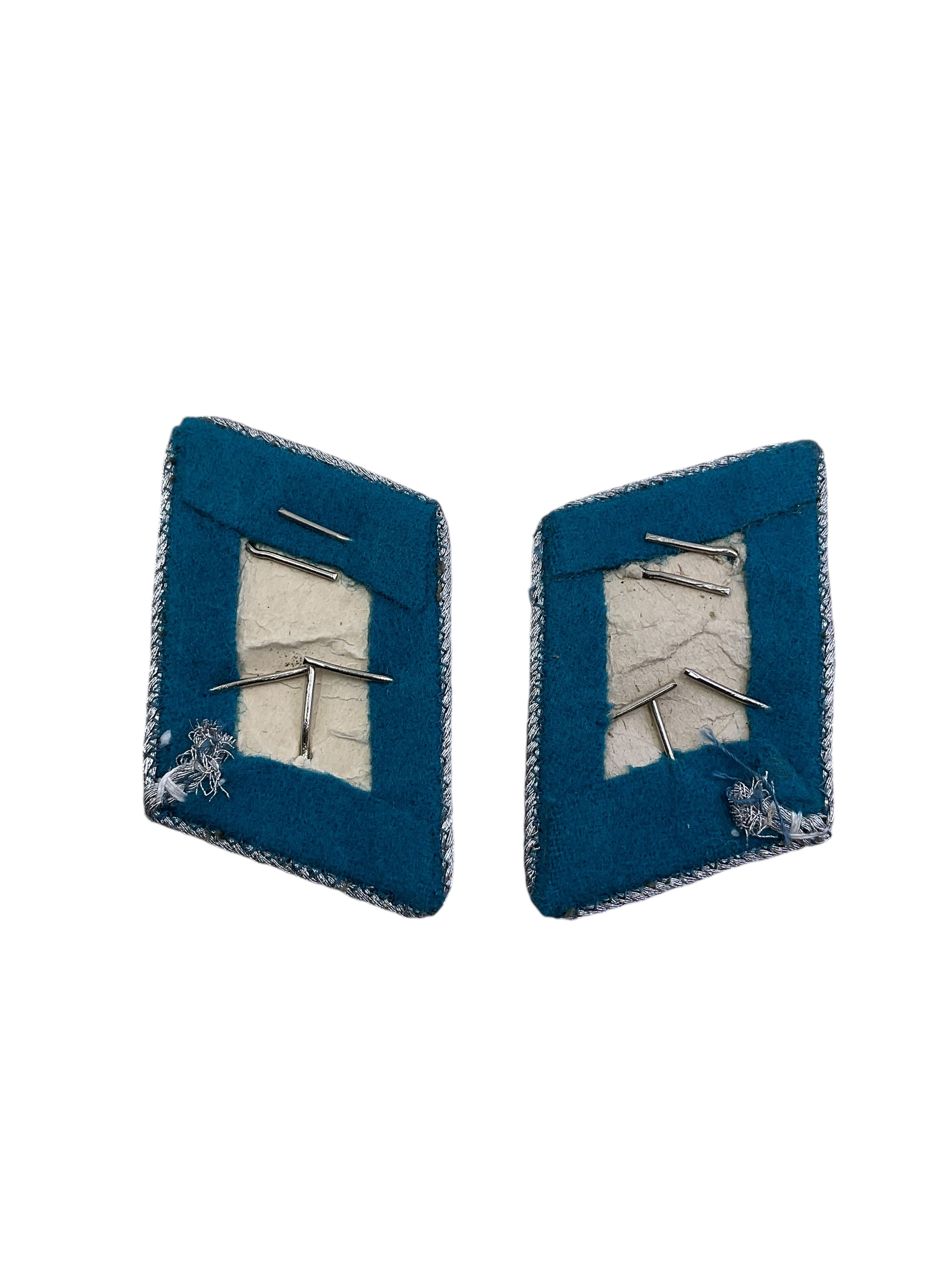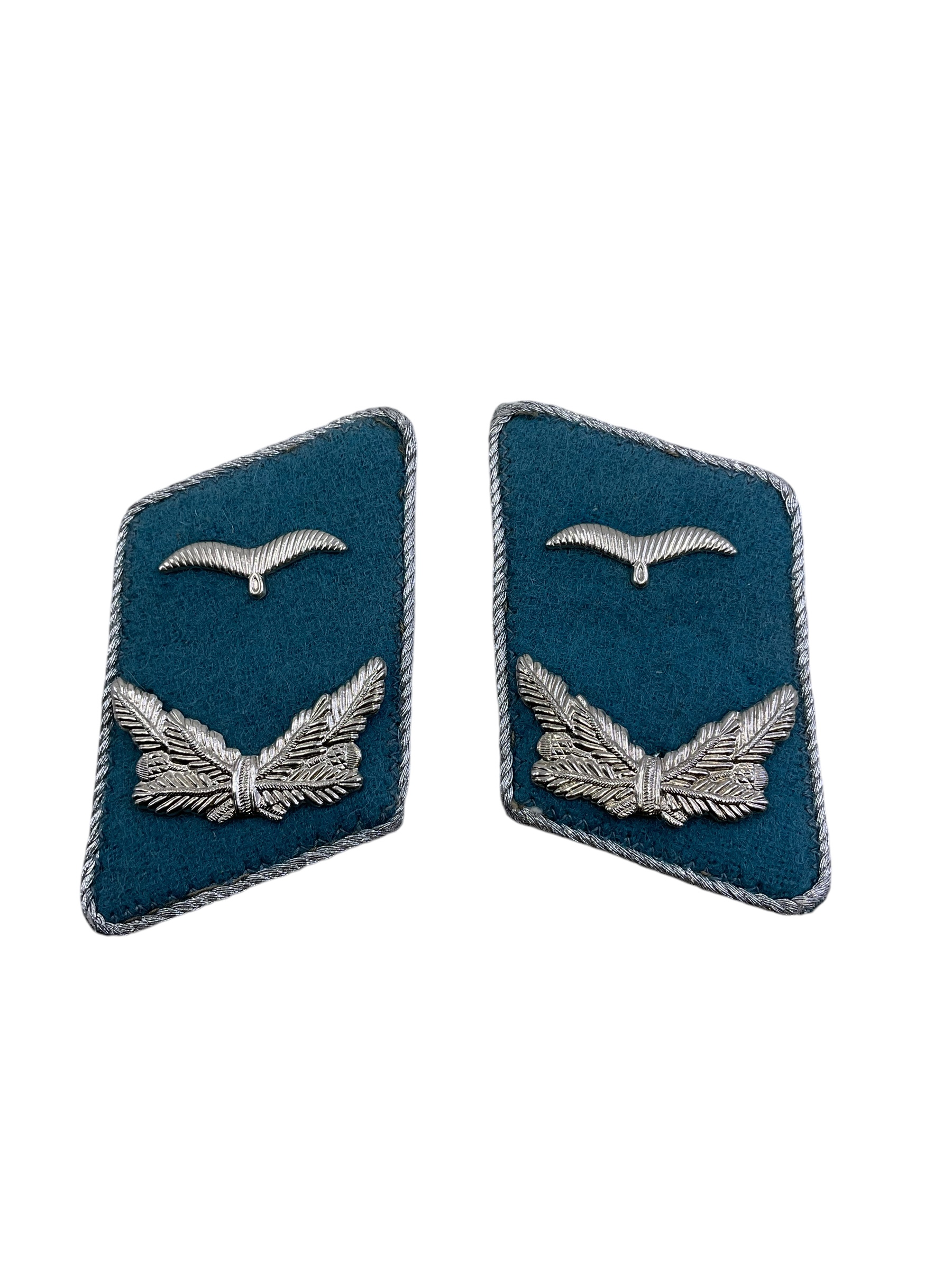 The ‘East German Air Force Collars Insignia Pair’ is a set of two collar insignias that were worn by officers of the East German Air Force. These insignias, dating back to the Cold War era, are meticulously crafted pieces that reflect the military aesthetics of the time. They feature the emblematic design of the East German Air Force – a stylized representation of an aircraft in flight. Each insignia is made of high-quality metal, with intricate detailing that highlights its historical significance. The collars insignia pair is not only a relic of a bygone era, but also an important piece of military memorabilia for collectors and history enthusiasts. These insignias serve as a testament to the rich and complex history of East Germany during the Cold War period.