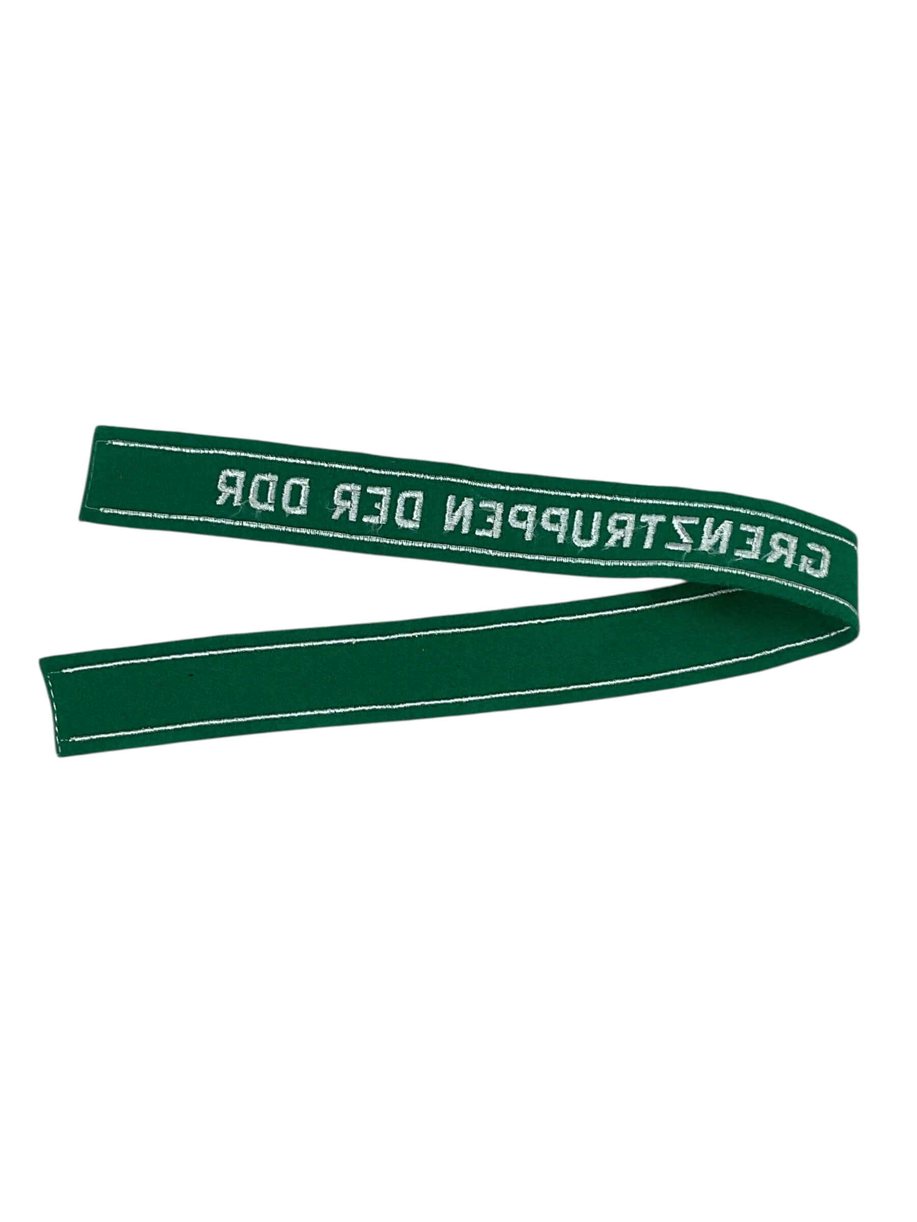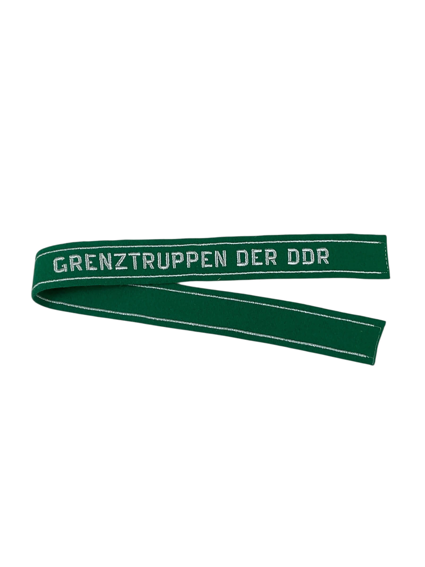 The East German Army Grenztruppen Der DDR Cuff Title is a uniform insignia originating from the Grenztruppen der DDR, or Border Troops of the German Democratic Republic. These forces were responsible for securing East Germany’s borders from 1946 to 1990. The cuff title is typically constructed from dark green or black woven fabric, featuring embroidered or woven white or silver lettering stating “Grenztruppen der DDR.” Worn on the lower sleeve of the uniform, the cuff title served to identify members of the East German Border Troops and distinguish them from other branches of the National People’s Army. Its design followed strict military specifications, reflecting the formal uniform traditions of the era. This item represents a piece of Cold War-era military history, illustrating the organizational structure and distinctive insignia employed by the East German armed forces during their period of active operation.