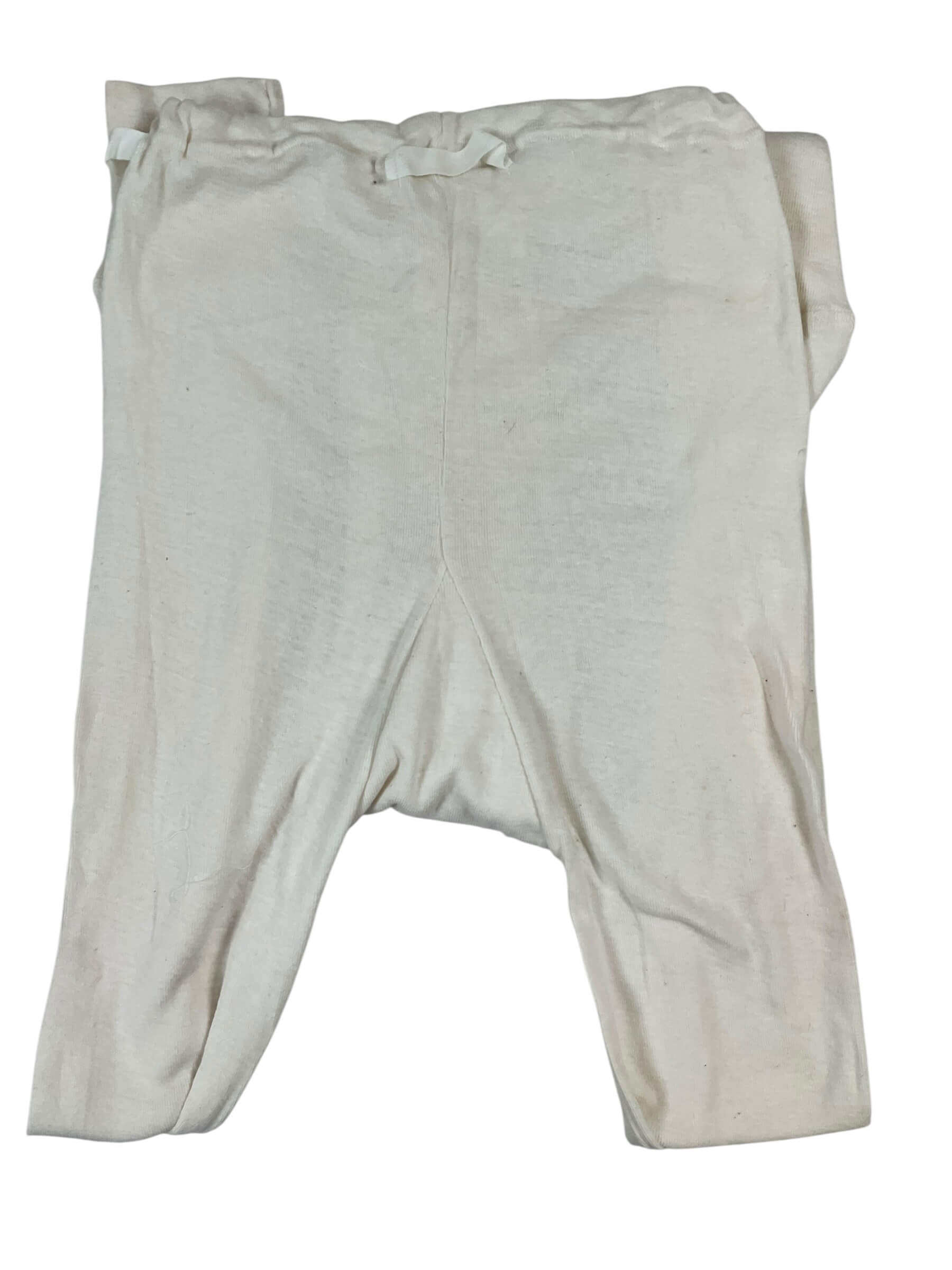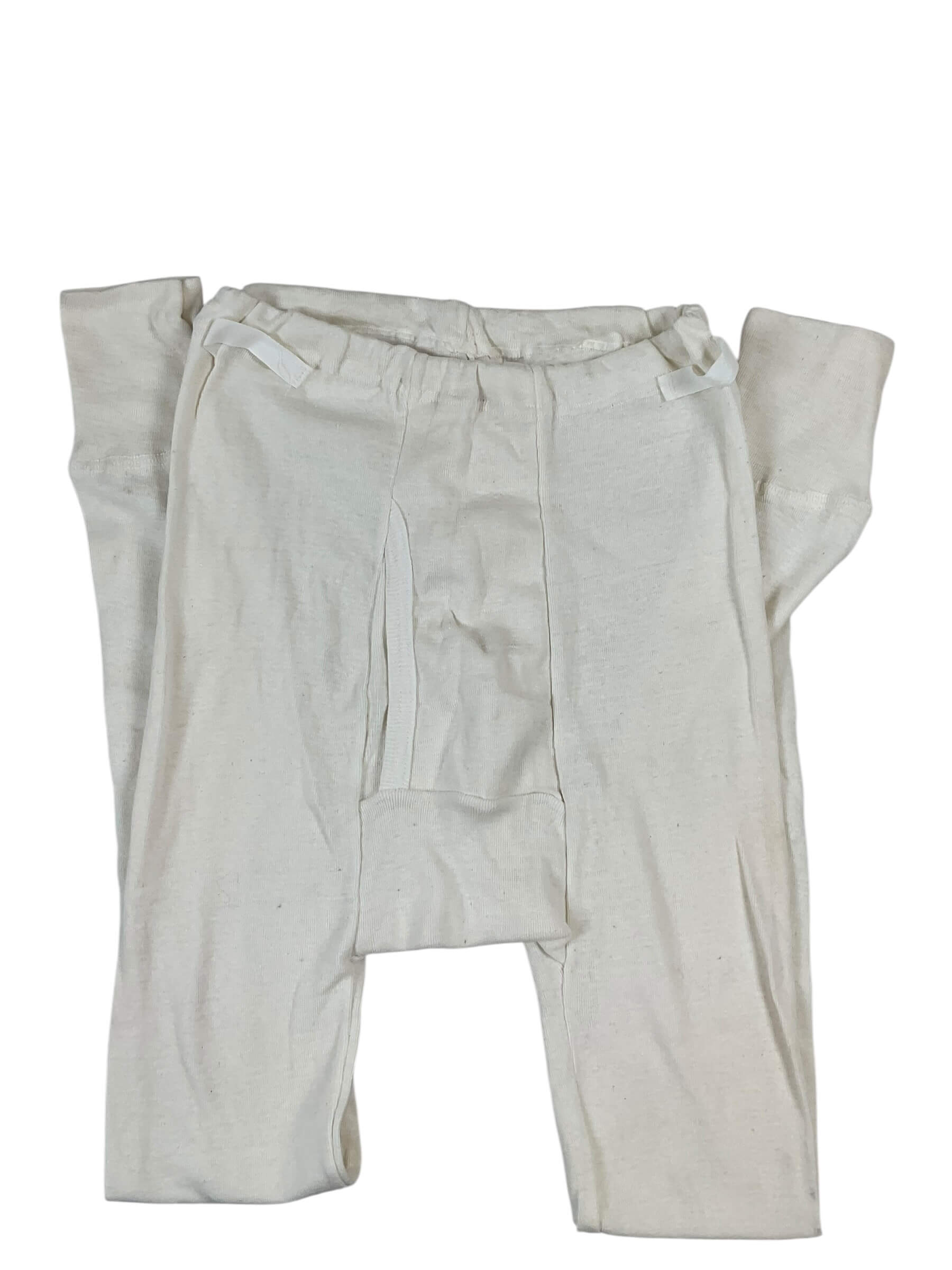 The East German Army Long John Bottoms are cold-weather undergarments issued to personnel of the Nationale Volksarmee (NVA), the armed forces of the former German Democratic Republic. Manufactured predominantly during the latter half of the 20th century, these bottoms are designed to be worn under standard-issue field uniforms to provide an insulating base layer in cold climates. The garment is typically constructed from a cotton or cotton-blend fabric, chosen for its softness, breathability, and ease of care. Features commonly include an elasticated waistband, ribbed ankle cuffs, and a contoured fit to retain body warmth while allowing freedom of movement. The color is usually off-white or light grey, consistent with standard-issue East German military textiles of the period. These long john bottoms represent standard field gear for East German military personnel and reflect the utilitarian design principles characteristic of Eastern Bloc military clothing during the Cold War era.