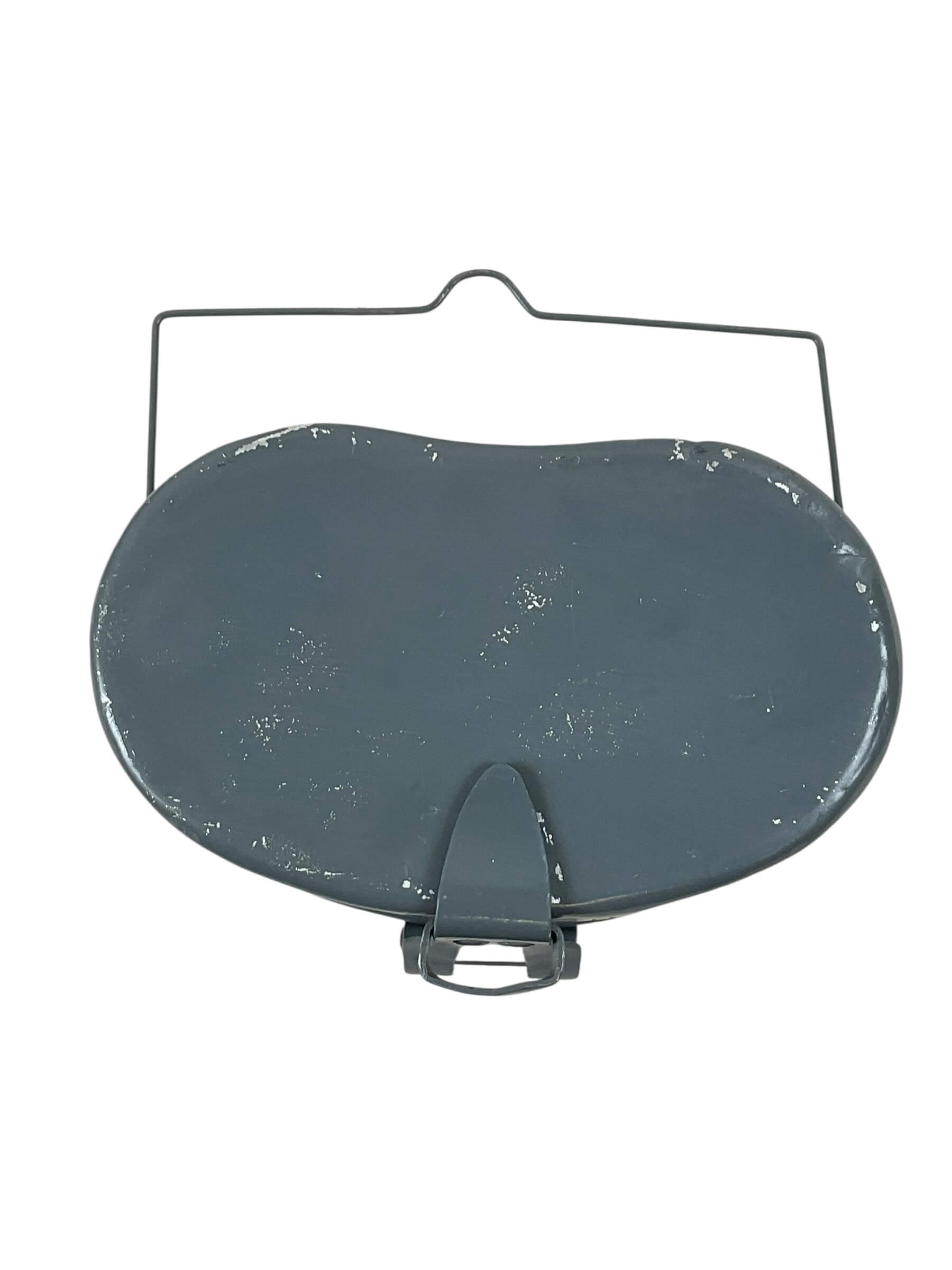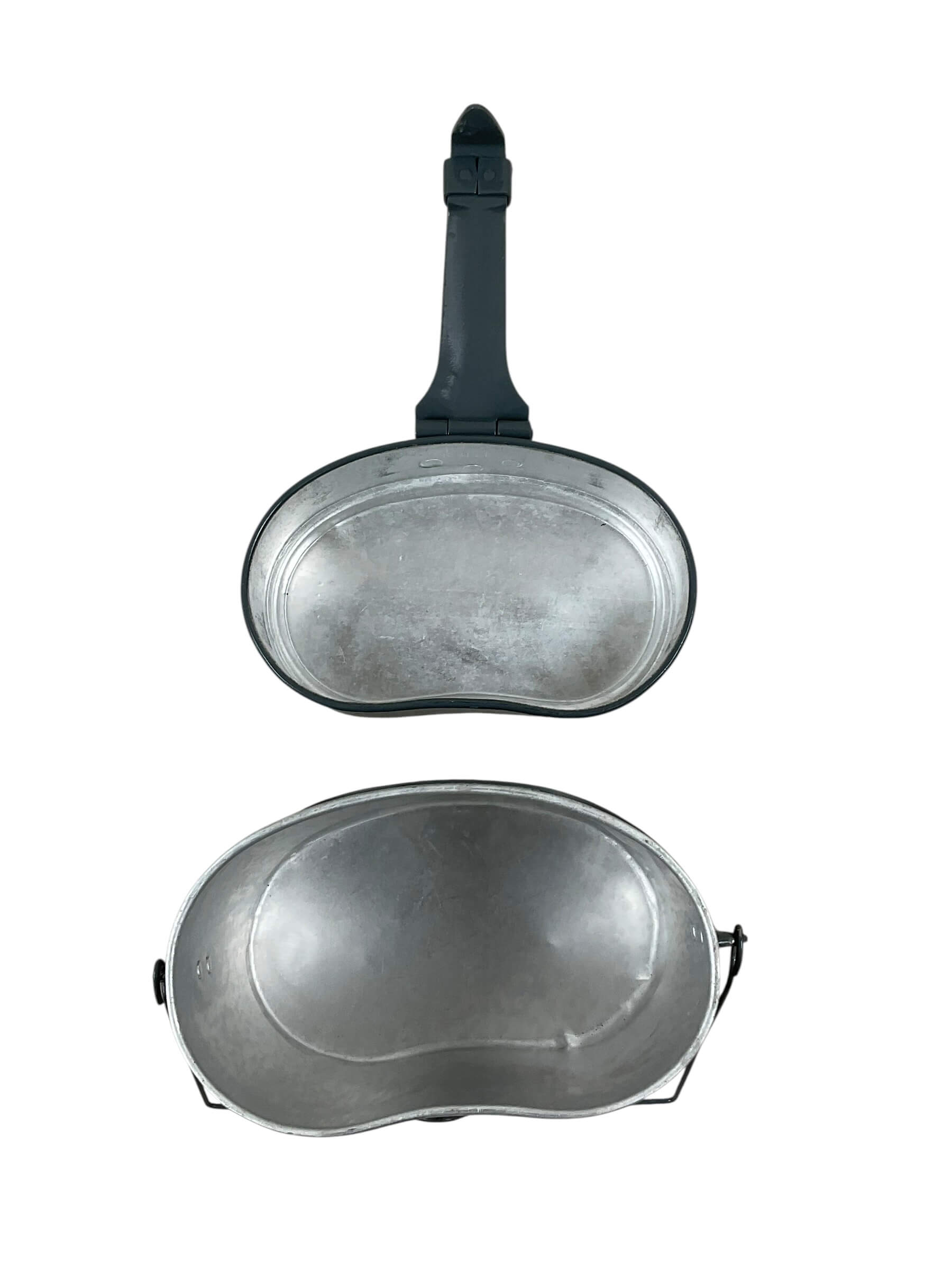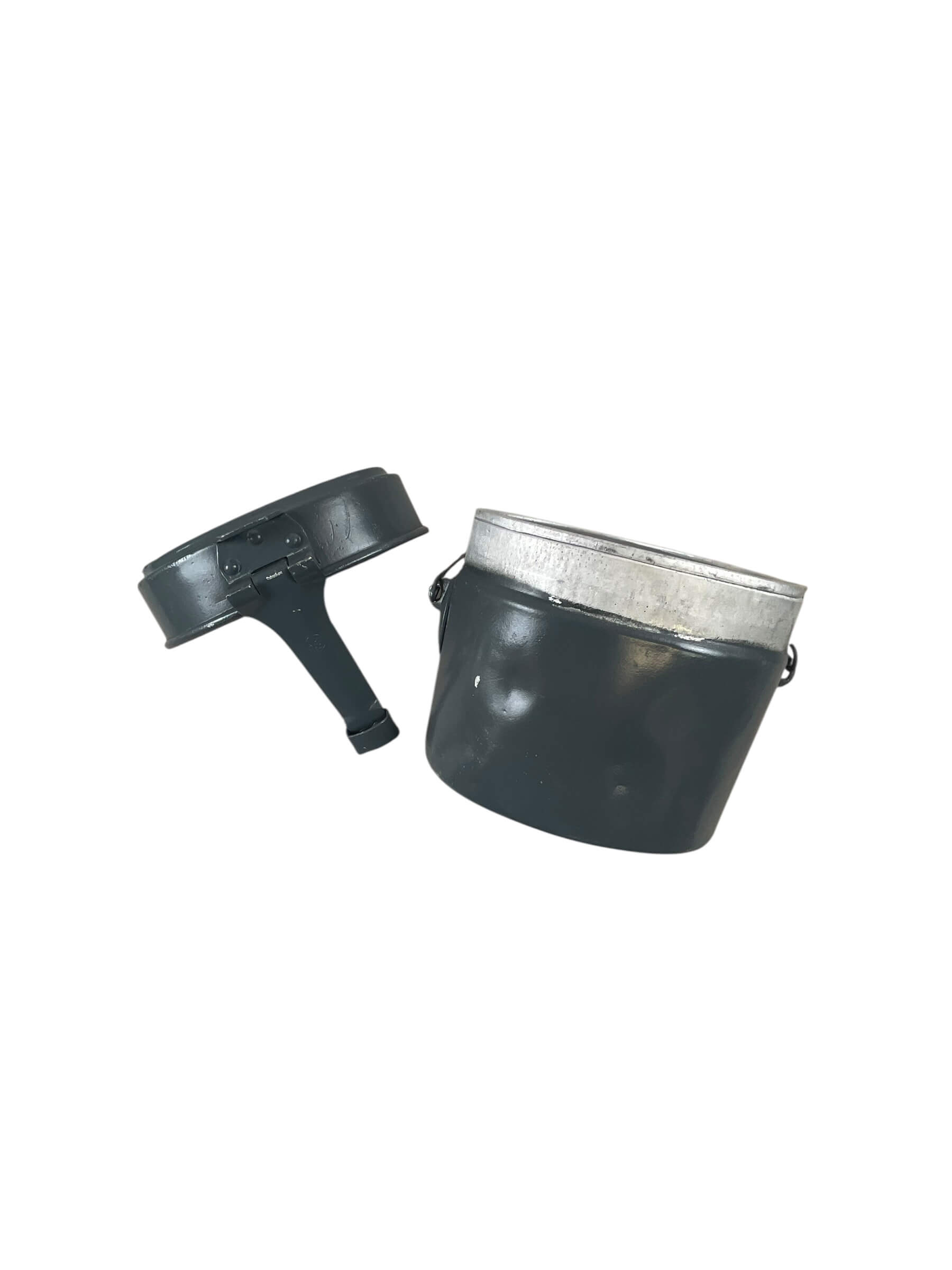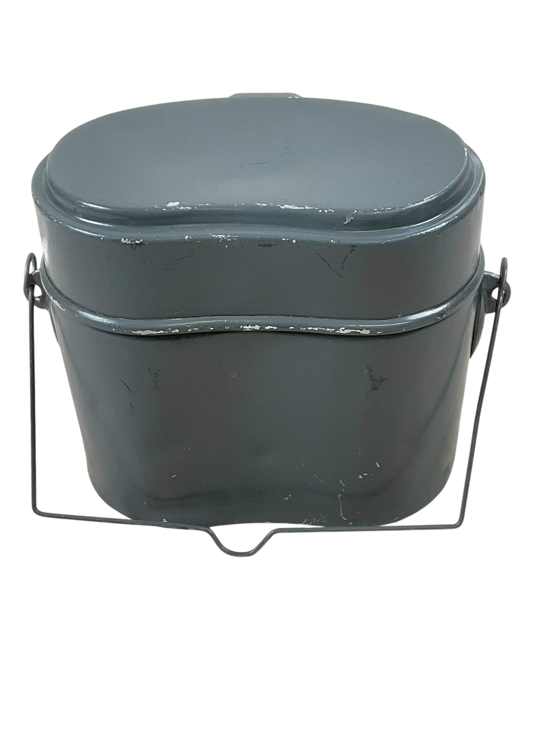 The East German Army Mess Tin is a utilitarian field item originally issued to soldiers of the Nationale Volksarmee (NVA), the armed forces of the former German Democratic Republic. Constructed primarily from lightweight aluminum, this mess tin comprises two main nesting components—a main pot and a shallow lid that can also function as a plate or frying pan. Designed for versatility and ease of transport, it features a folding handle that secures the components together for compact storage in a field pack. The mess tin was typically used for preparing, serving, and consuming meals while in the field. Its design draws on the traditional German military field gear but incorporates modifications specific to East German standards during the Cold War era. Markings on the tin often include manufacturing stamps and contract numbers unique to NVA-issued equipment. The mess tin is representative of standardized personal field gear in Warsaw Pact militaries.
