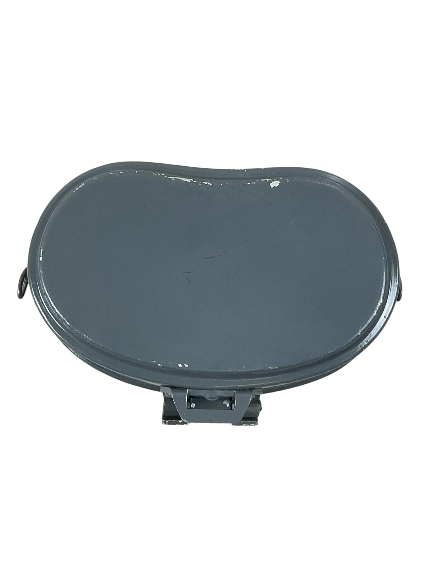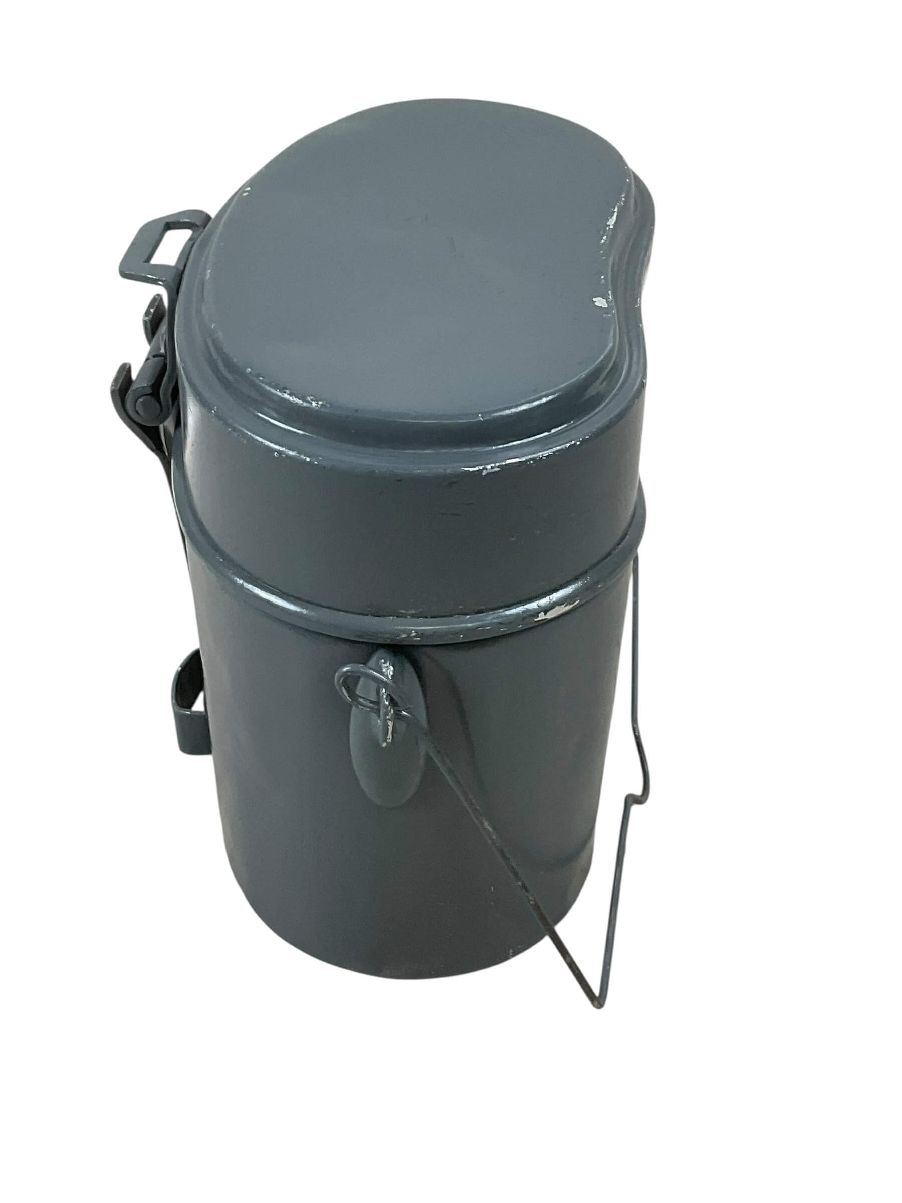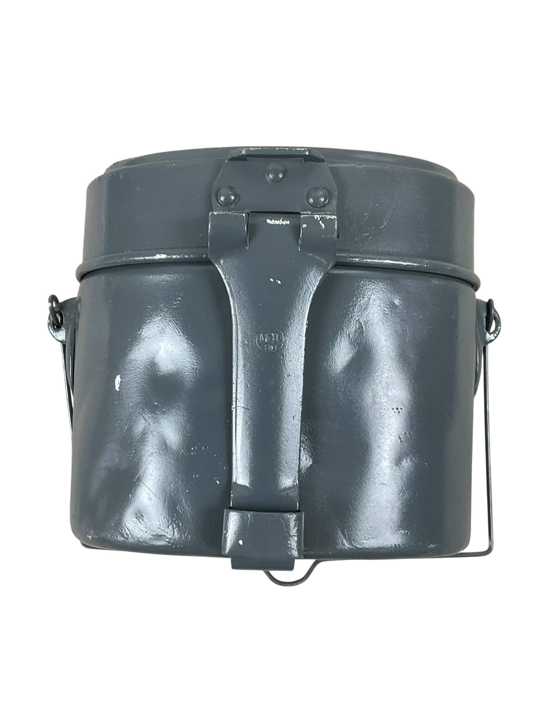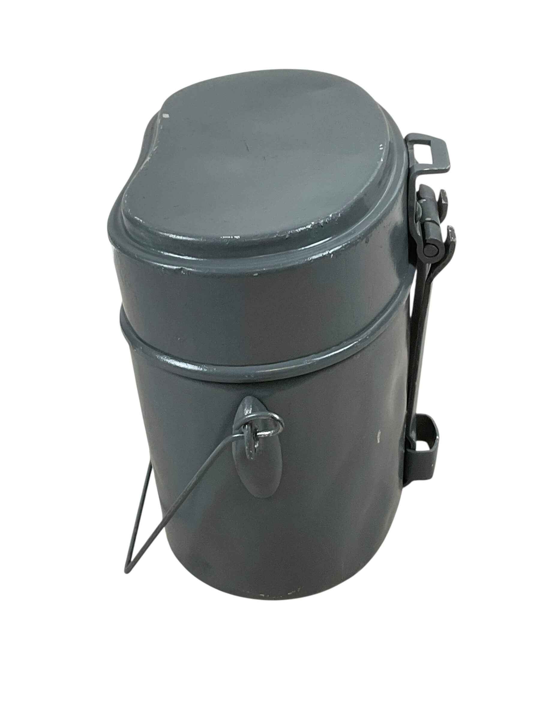 The East German Army Mess Tin is a utilitarian field item originally issued to soldiers of the Nationale Volksarmee (NVA), the armed forces of the former German Democratic Republic. Constructed primarily from lightweight aluminum, this mess tin comprises two main nesting components—a main pot and a shallow lid that can also function as a plate or frying pan. Designed for versatility and ease of transport, it features a folding handle that secures the components together for compact storage in a field pack. The mess tin was typically used for preparing, serving, and consuming meals while in the field. Its design draws on the traditional German military field gear but incorporates modifications specific to East German standards during the Cold War era. Markings on the tin often include manufacturing stamps and contract numbers unique to NVA-issued equipment. The mess tin is representative of standardized personal field gear in Warsaw Pact militaries.