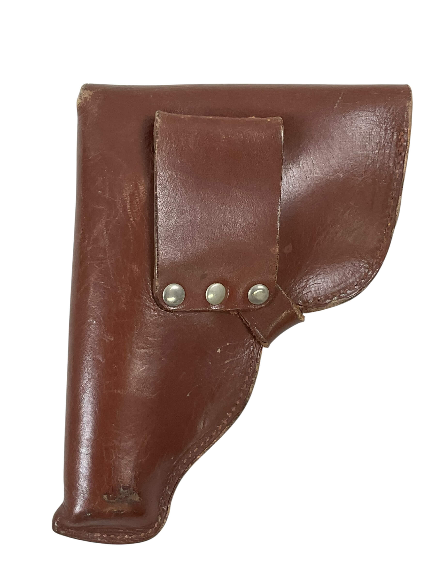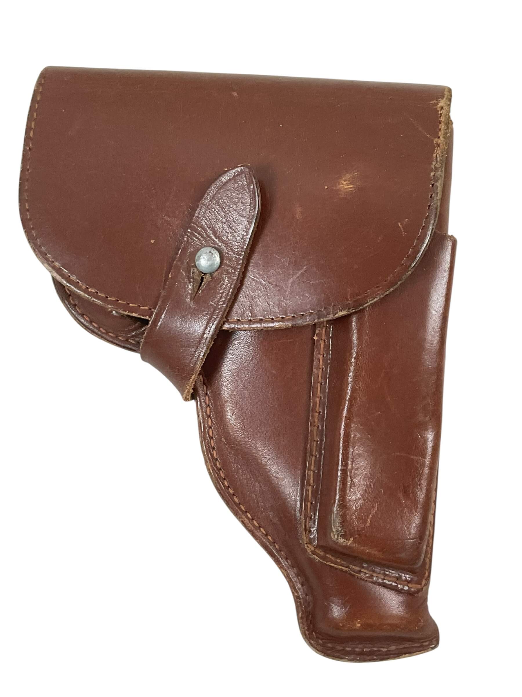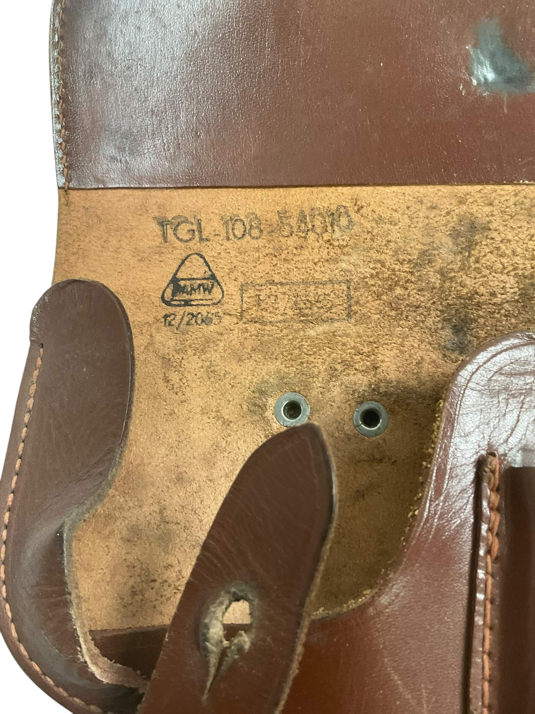 The East German Army Officer’s Brown Leather Tokarev Holster is a military-issue sidearm holster produced for the Nationale Volksarmee (NVA) of the former German Democratic Republic. Designed to accommodate the Soviet-designed Tokarev TT-33 pistol, this holster is constructed from brown leather and features reinforced stitching for durability. The flap-over design secures the pistol with a strap and metal stud closure, providing protection from dirt and moisture. Additional features may include a side pouch for carrying a spare magazine and belt loops for attachment to a standard officer’s service belt. Used primarily during the Cold War era, these holsters reflect the influence of Soviet military equipment on East German forces. The utilitarian design and quality of materials are typical of Eastern Bloc militaria from the mid-to-late 20th century. This holster is of interest for its connection to Cold War military history and its representation of standard-issue gear issued to East German officers.