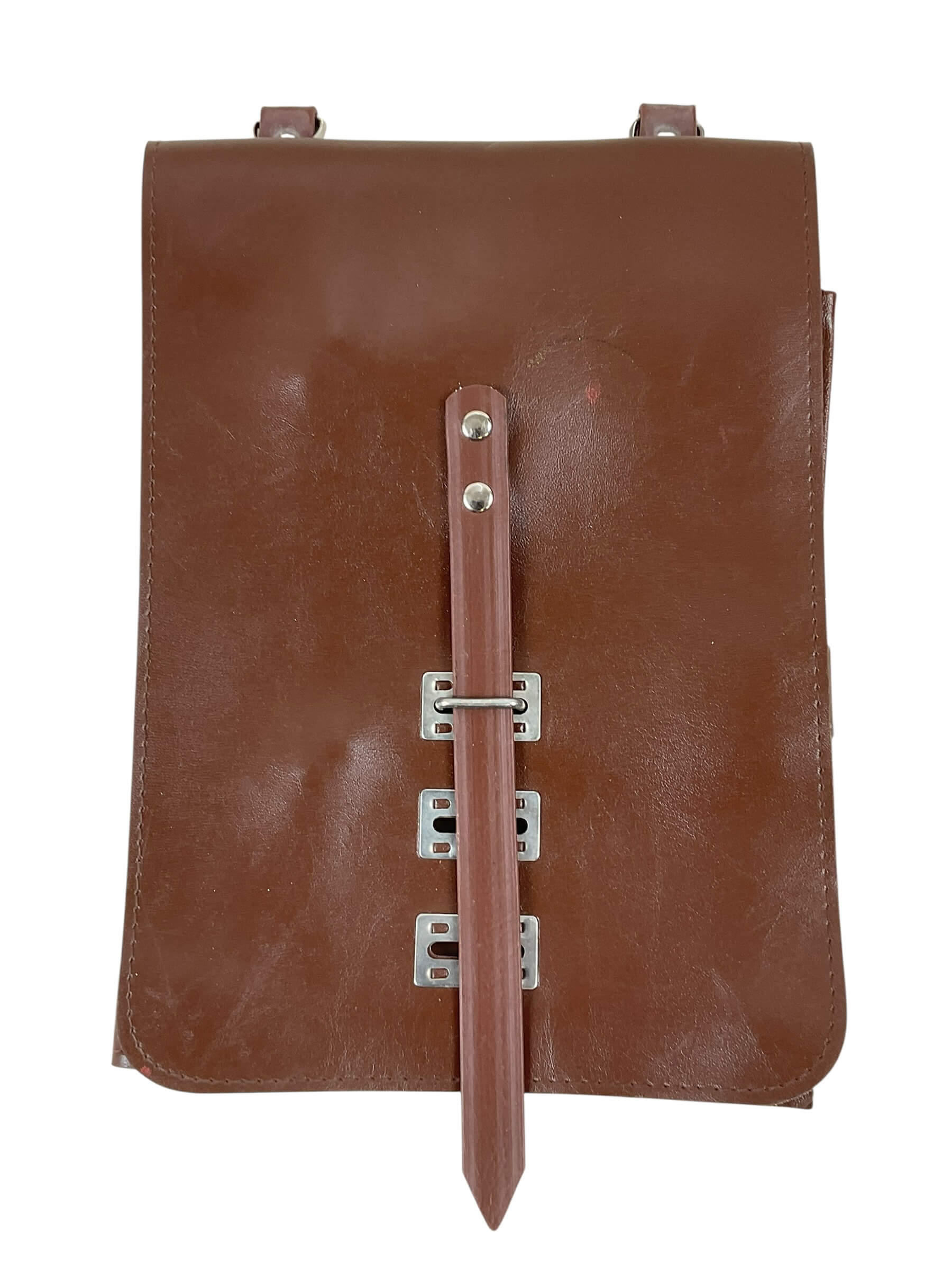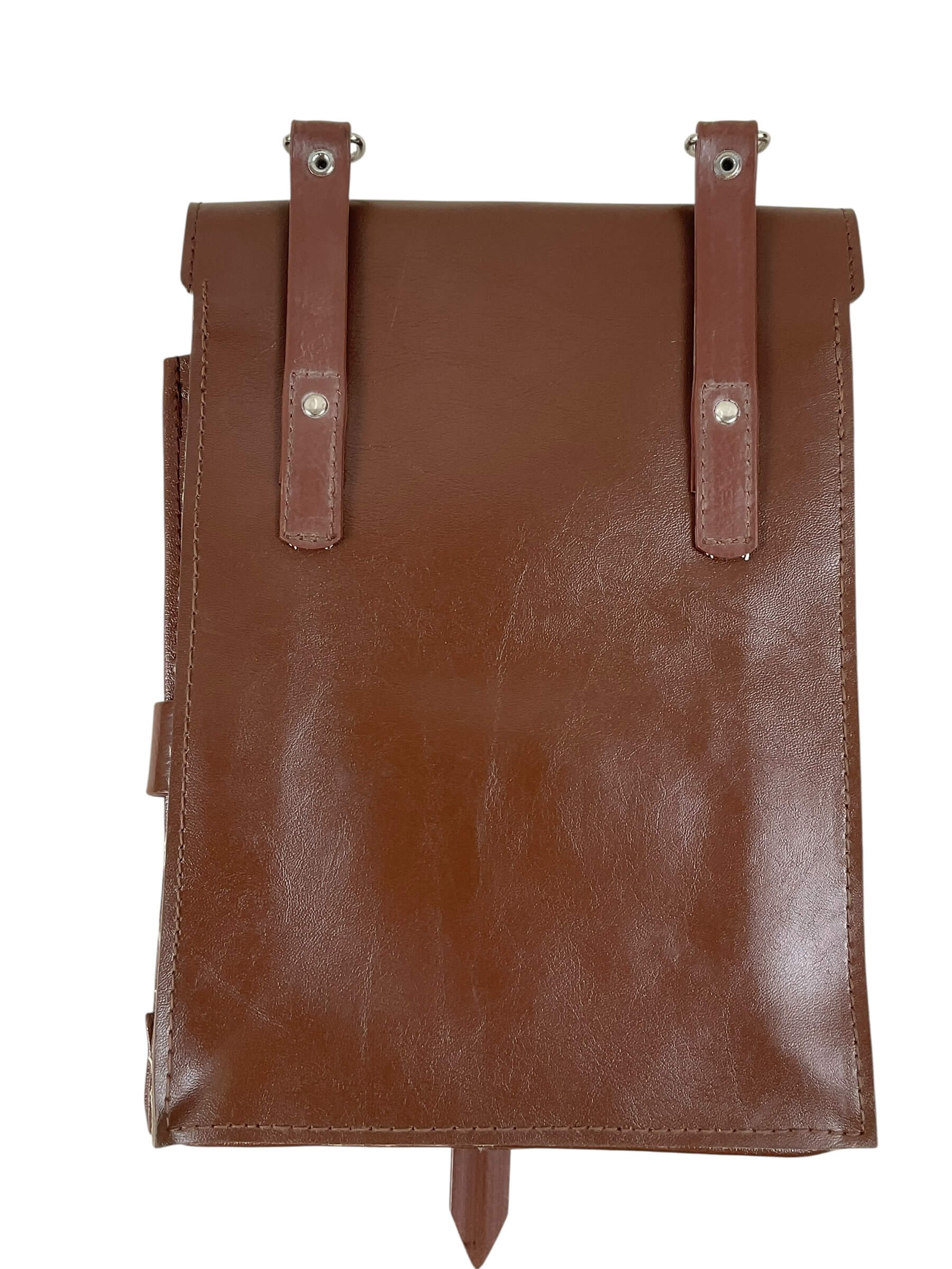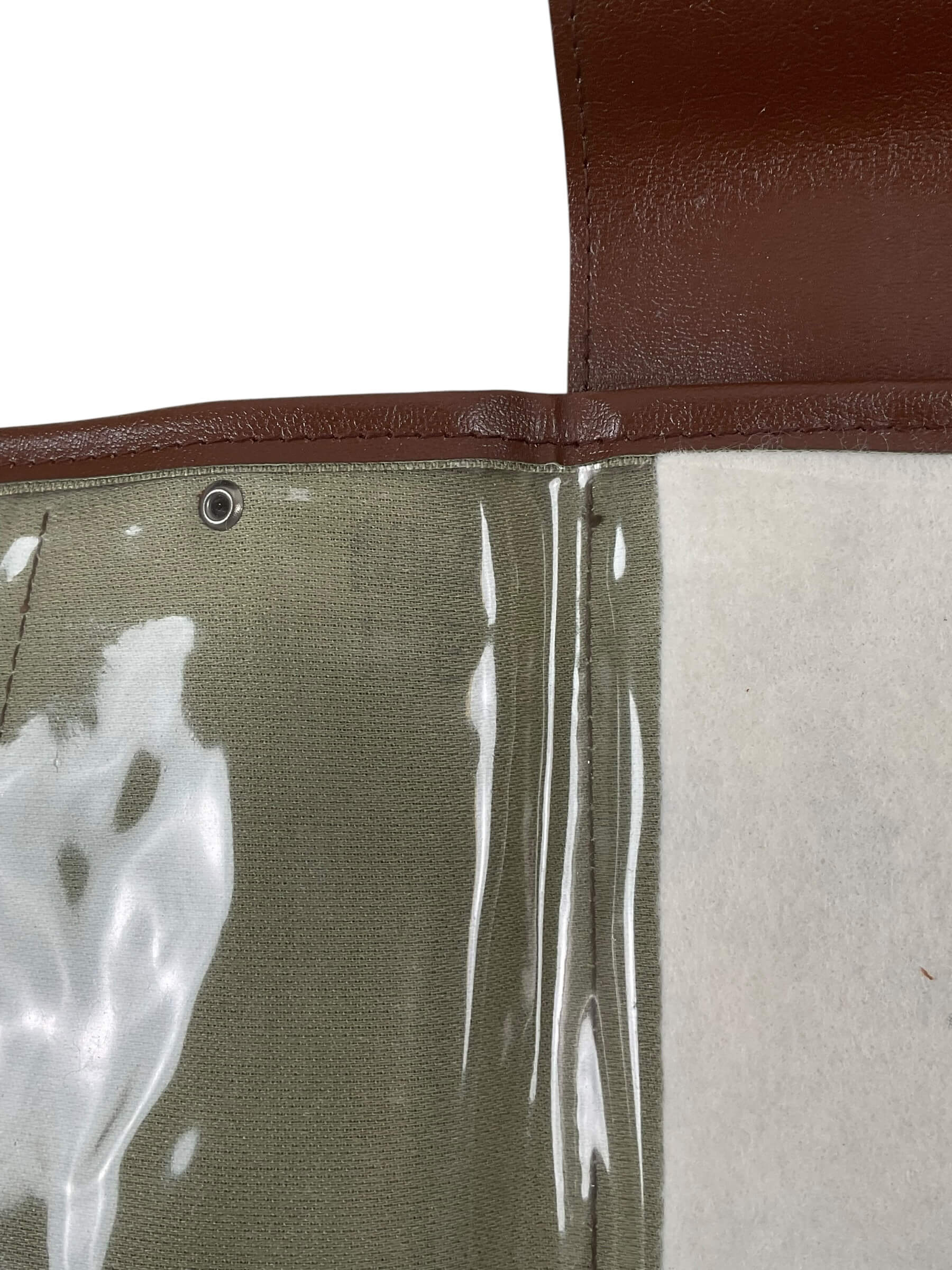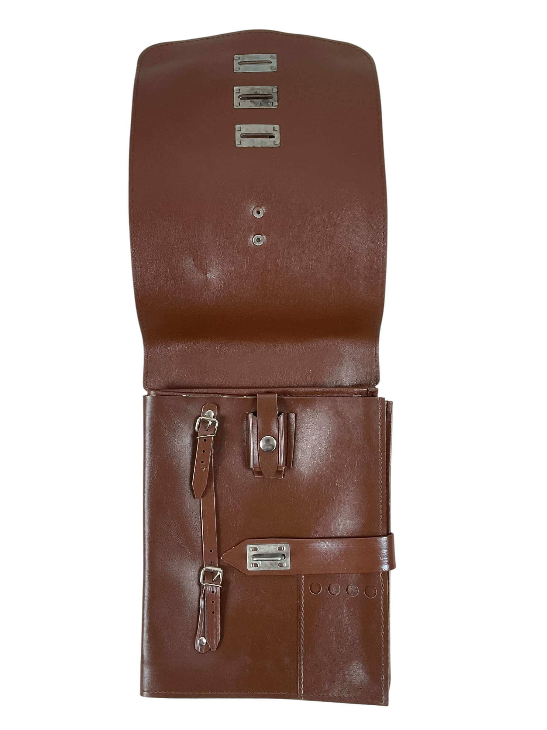 The East German Army Officer’s Map Case is a standard-issue field accessory used by officers of the Nationale Volksarmee (NVA) of the former German Democratic Republic. Manufactured primarily from durable, water-resistant leatherette or vinyl, the map case is designed to protect documents, maps, and writing instruments during field operations. The case typically features a fold-over flap with snap or buckle closure for secure storage. Inside, it is equipped with multiple compartments, slots for pencils or pens, and transparent sleeves to facilitate the organization and reading of navigational materials. Commonly black or dark brown in color, this map case includes an adjustable shoulder strap for ease of carry. The item reflects the utilitarian design approach of East German military equipment and was widely used from the 1960s until the disbandment of the NVA in 1990. This map case represents a practical piece of military field gear characteristic of the Cold War era.