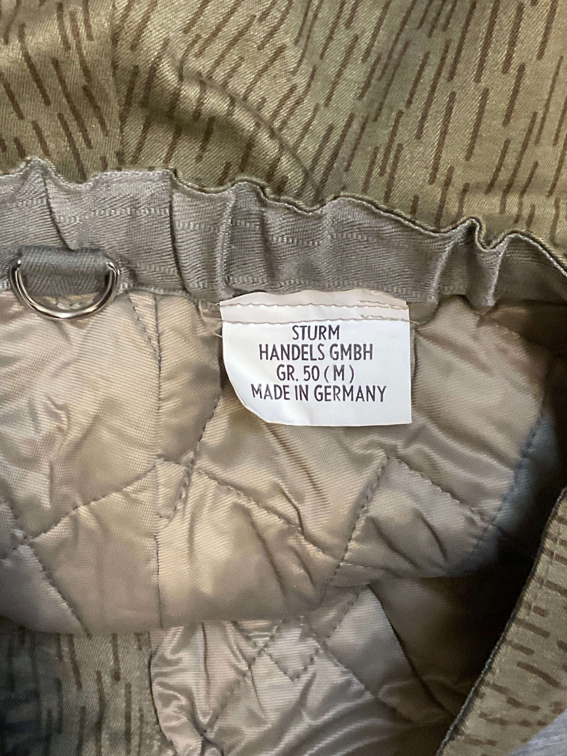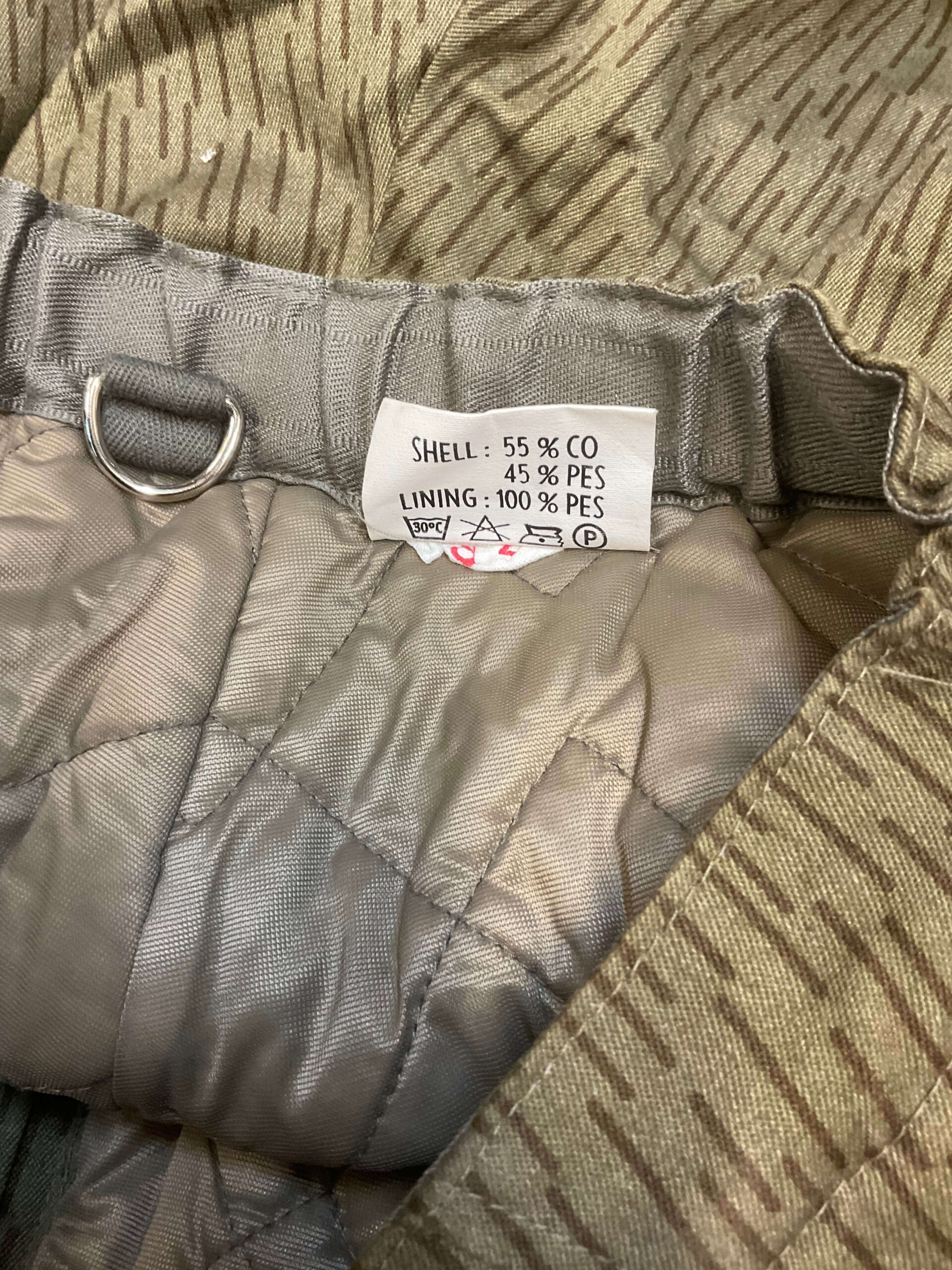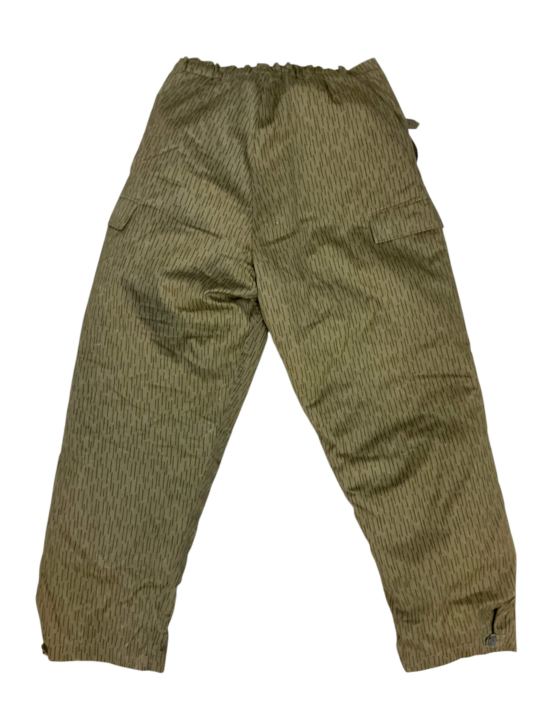The East German Army Rain Pattern Insulated Trousers in size Medium are an example of military cold-weather gear issued to the National People’s Army (NVA) of the former German Democratic Republic. These trousers feature the distinctive Strichtarn, or “rain pattern,” camouflage, characterized by vertical streaks designed to provide concealment in forested and grassy environments. Constructed with an insulated lining, the trousers offer additional warmth during cold conditions, making them suitable for prolonged outdoor activities. Design elements include adjustable waist tabs, button or snap closures, and reinforced stitching at key stress points for enhanced durability. Practical features commonly found in this model are suspender attachment points, side pockets, and integrated leg openings to accommodate boots. Issued predominantly during the latter half of the 20th century, such trousers formed part of the standard field uniform for East German military personnel. This example is available in medium size, corresponding to average adult measurements in East German military sizing systems.