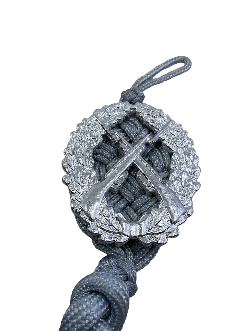 The “East German Army Shooting Lanyard Silver” is a distinguished military decoration that highlights marksmanship excellence. Originating from the former East Germany, this silver lanyard was awarded to soldiers who demonstrated superior shooting skills during training or competitions. The lanyard is typically crafted from a robust, braided silver cord and often features a detailed insignia or emblem, symbolizing the soldier’s prowess and dedication. These lanyards were worn on military uniforms, signifying the bearer’s exceptional precision and discipline with firearms. Beyond its function as an award, the Shooting Lanyard holds historical significance, offering a glimpse into the practices and traditions of the East German military. Collectors and historians value these lanyards not only for their aesthetic appeal but also for their cultural and historical importance, preserving a piece of the military heritage of East Germany.
