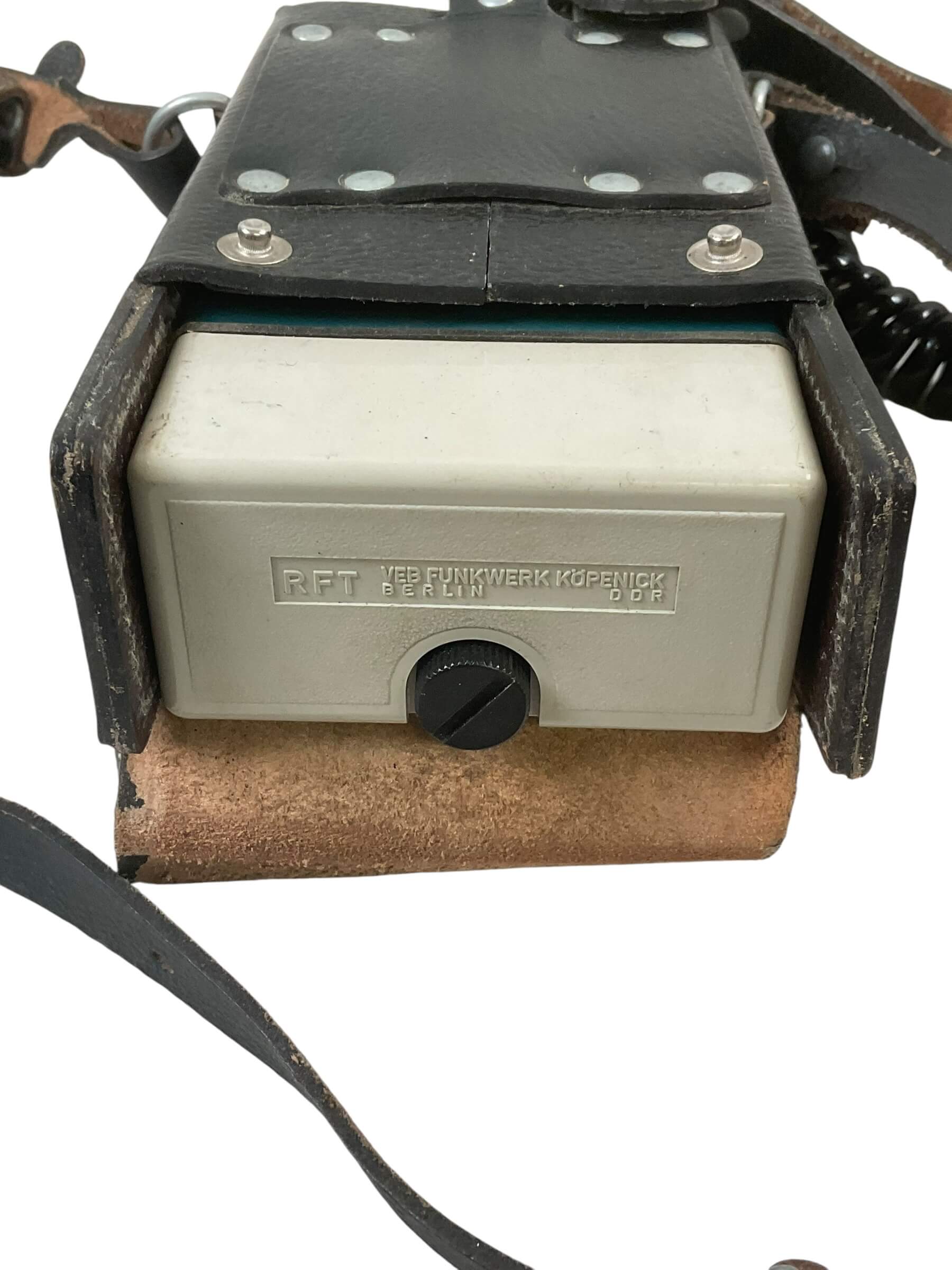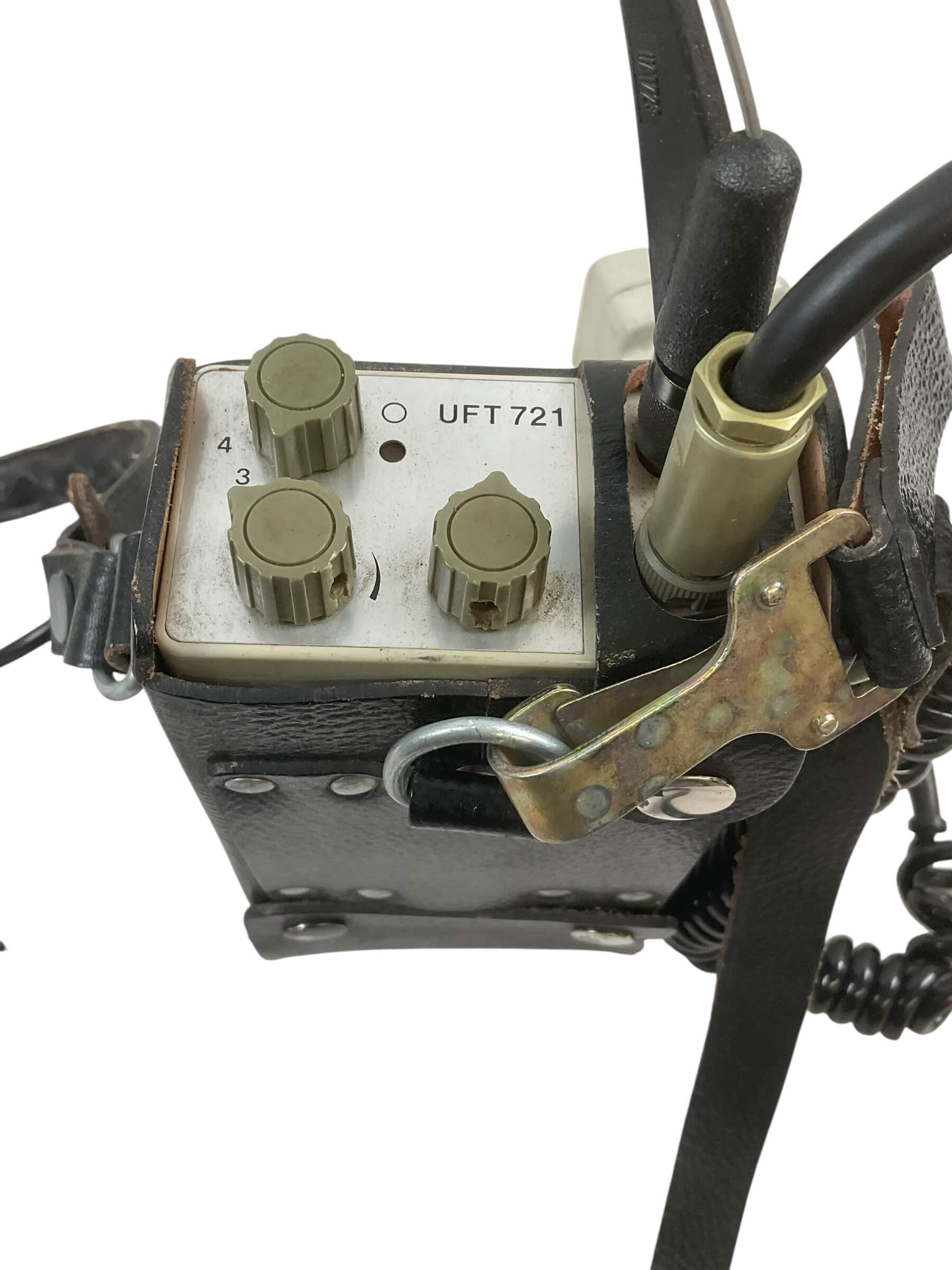 The East German Army UFT 721 Border Guard Radio is a portable communication device issued to border guard units during the late Cold War period in the German Democratic Republic (GDR). Manufactured primarily in the 1980s, the UFT 721 served as a field radio for military and paramilitary personnel, facilitating secure voice communication along national borders. The device is characterized by a robust metal casing designed to endure demanding field conditions. It operates within VHF frequencies, with typical usage involving both fixed and backpack configurations. The radio features a rotary dial for channel selection, a built-in microphone, and an external antenna connection for extended range. Power is supplied by a rechargeable battery pack. The UFT 721 illustrates the technological solutions adopted by the East German military to address border security and internal communication needs during a period of significant political and military tension in Europe. This item is of particular interest to collectors of Cold War-era military equipment.