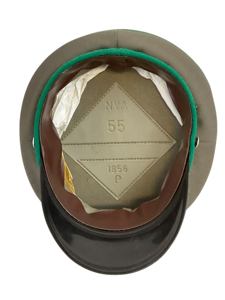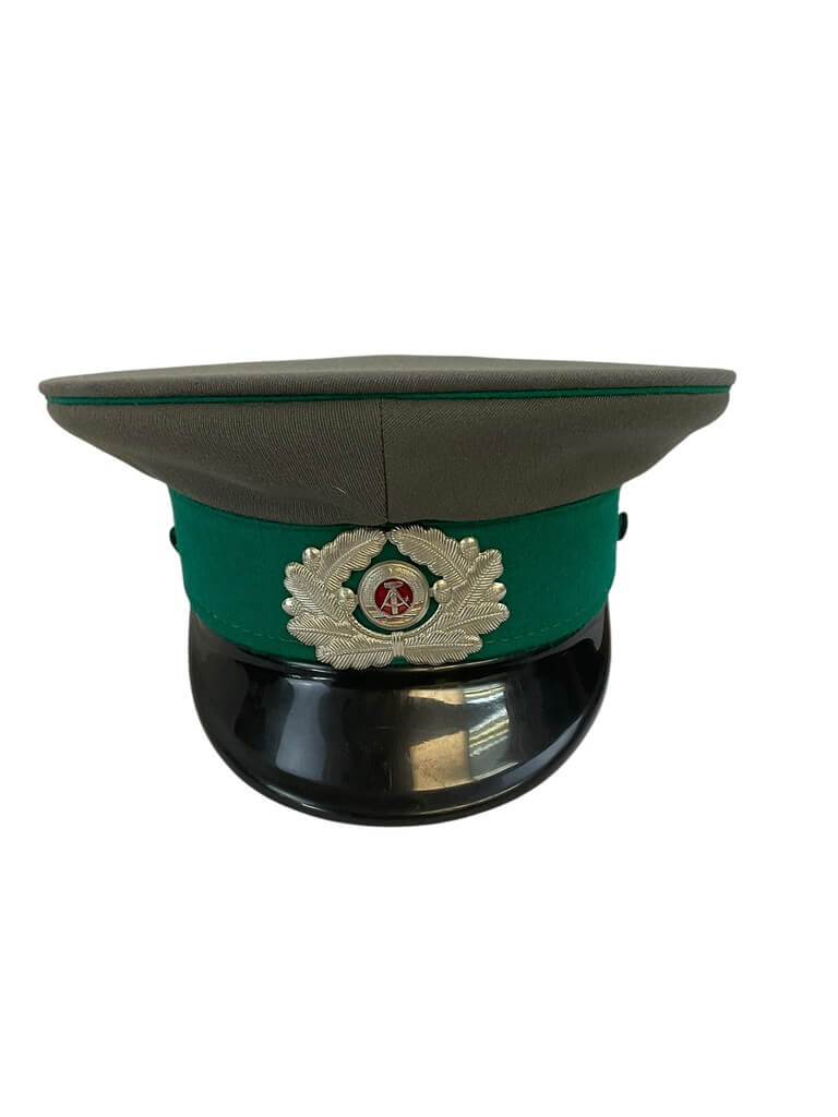This item is an authentic East German Border Guard Peak Cap Hat, notable for its missing chin strap. This distinctive military cap, also known as a “Schirmmütze,” was worn by border guards of the German Democratic Republic during the Cold War era. Its design features a high front peak, a greenish-grey wool body, and a black vinyl visor. The cap is missing its chin strap, an original component that provided stability and secure fit for the wearer. It also bears the East German National Emblem, a hammer and compass encircled by a rye wreath, on the front. Despite the missing chin strap, this cap remains a significant collectible item, resonating with historical and cultural significance. Its condition reflects its age and use but also adds a certain character and authenticity. It is a must-have piece for military memorabilia collectors, history enthusiasts, or anyone interested in the Cold War era.
