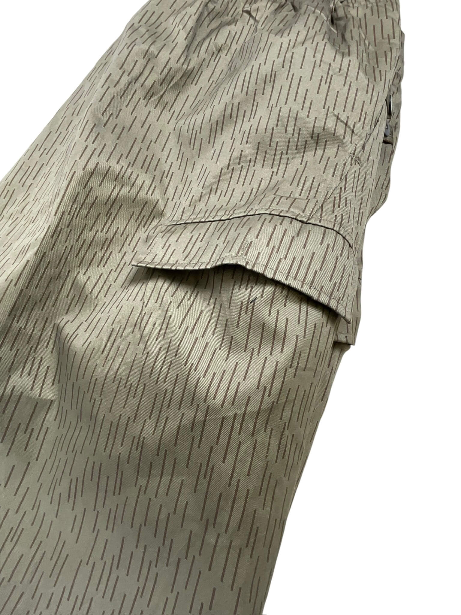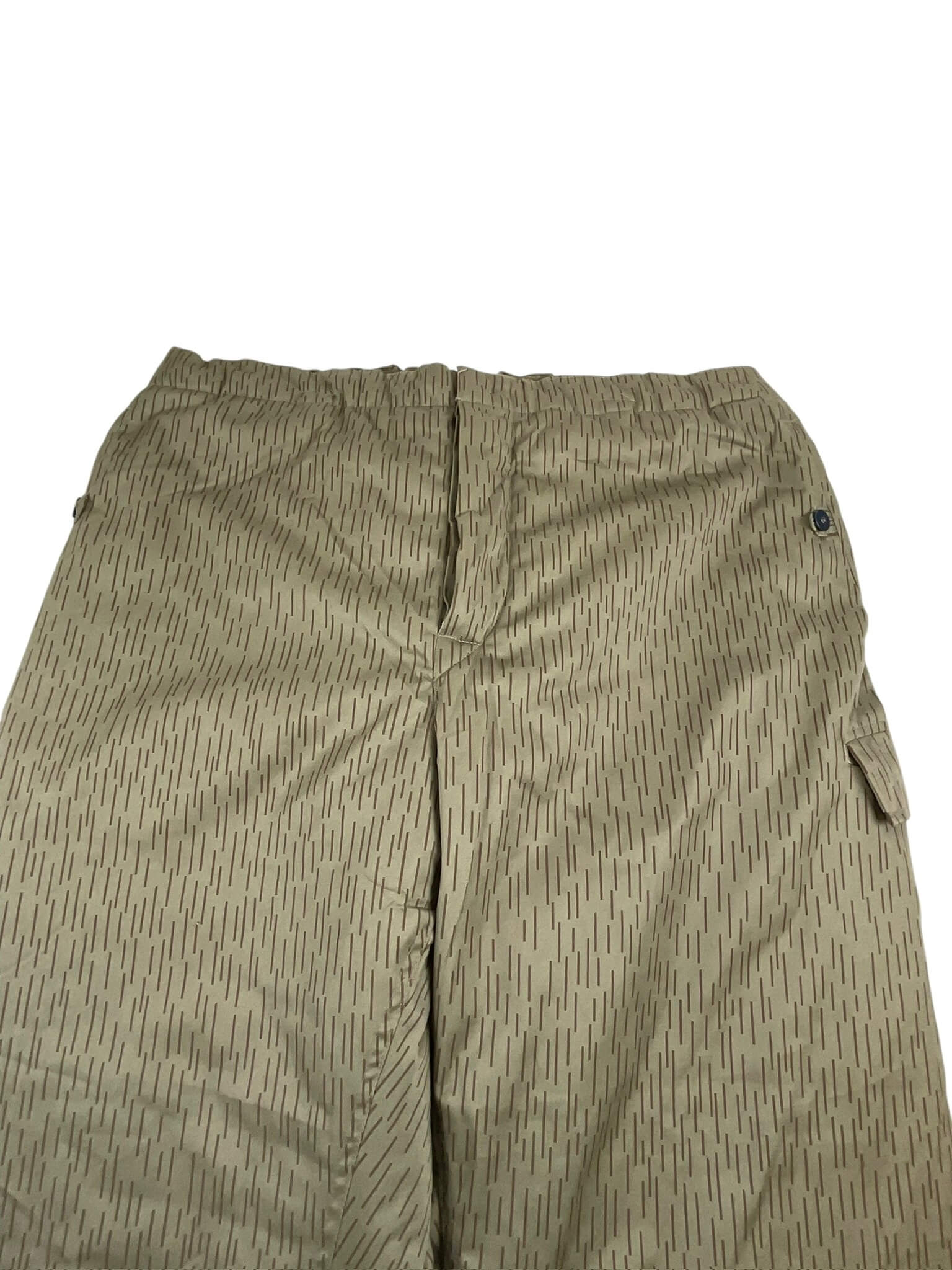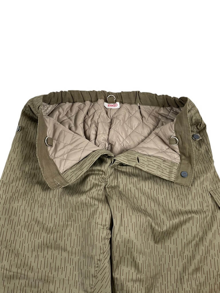 ‘East German Water Pattern Winter Trousers Pants Size 60’ are original military surplus trousers with a unique water pattern. Originally designed for the East German military, these trousers are renowned for their excellent quality and durability. They are made from a sturdy, water-resistant material that helps to keep you dry in the rain or snow. The unique water pattern is not just aesthetically appealing but was also used as an effective camouflage in snowy and wet environments. These trousers come in a generous size 60, offering a comfortable and roomy fit. They feature a button fly, adjustable waist, and multiple pockets for practical storage. Designed for winter use, they are lined for extra warmth, making them perfect for outdoor activities in cold weather. These trousers are a genuine piece of historical military apparel, providing a blend of functionality and unique style.