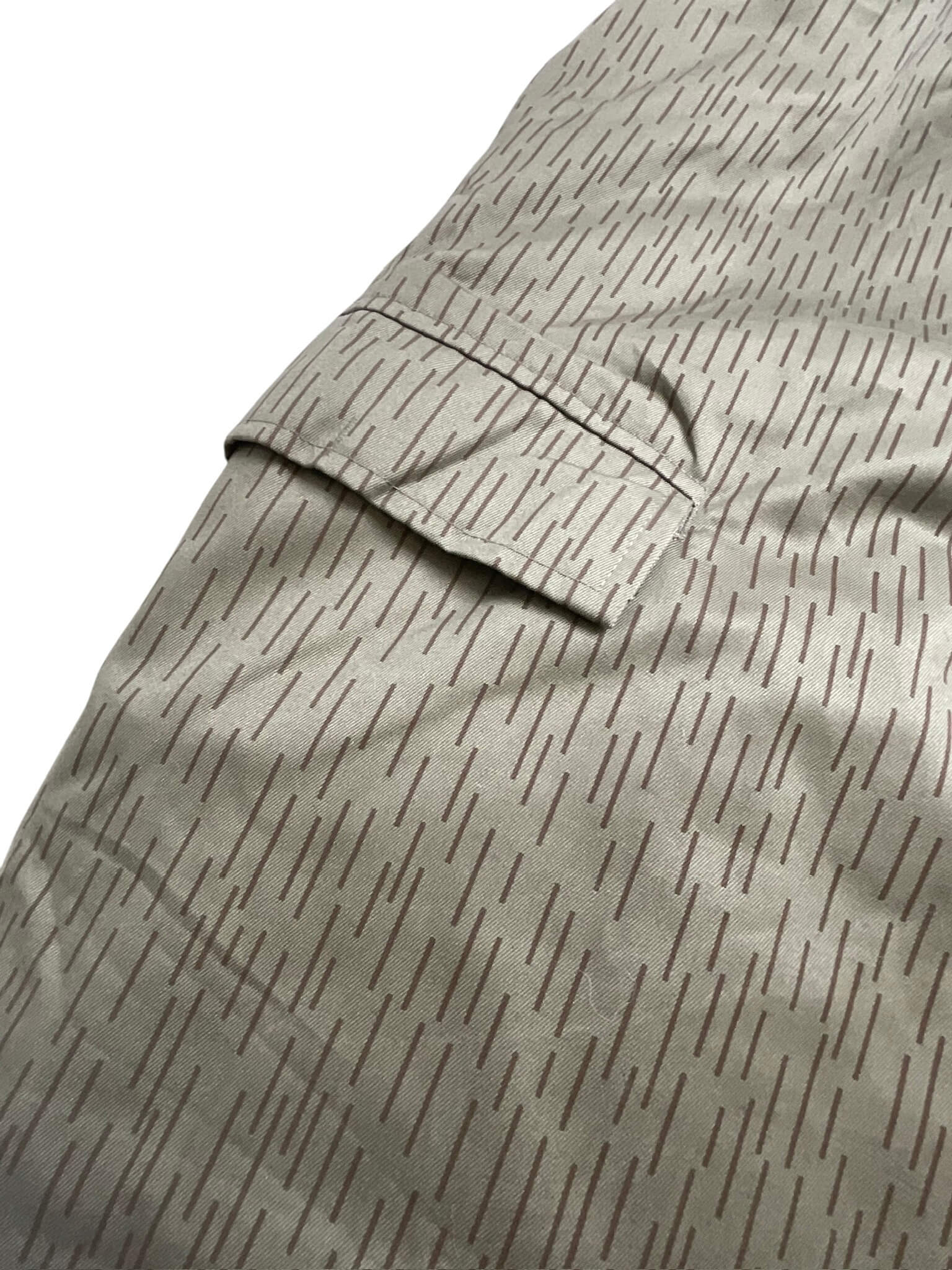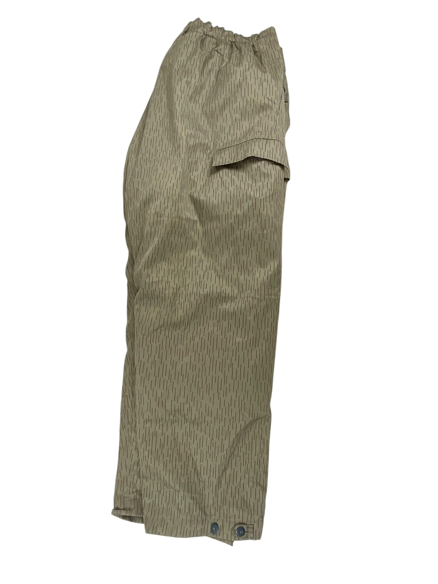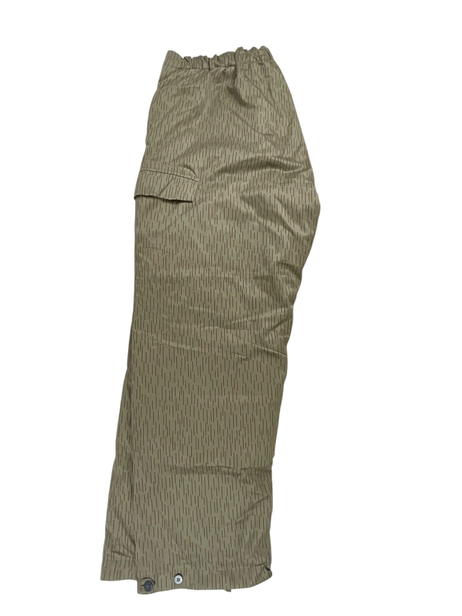 ‘East German Water Pattern Winter Trousers Pants Size 60’ are original military surplus trousers with a unique water pattern. Originally designed for the East German military, these trousers are renowned for their excellent quality and durability. They are made from a sturdy, water-resistant material that helps to keep you dry in the rain or snow. The unique water pattern is not just aesthetically appealing but was also used as an effective camouflage in snowy and wet environments. These trousers come in a generous size 60, offering a comfortable and roomy fit. They feature a button fly, adjustable waist, and multiple pockets for practical storage. Designed for winter use, they are lined for extra warmth, making them perfect for outdoor activities in cold weather. These trousers are a genuine piece of historical military apparel, providing a blend of functionality and unique style.