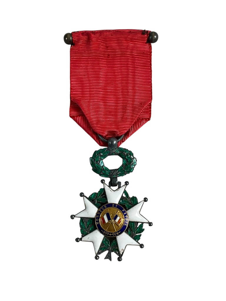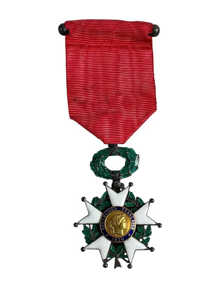 The French 1870 Legion of Honour Medal Full Size is a historical military decoration awarded by the French government. Established by Napoleon Bonaparte in 1802, the Legion of Honour (Légion d’honneur) is the highest order of merit in France, recognizing both military and civil achievements. The 1870 version pertains to the period of the Franco-Prussian War and the early Third Republic. This medal features a five-pointed white enamel star, surmounted by a laurel and oak wreath, and suspended from a red ribbon. The obverse typically bears the effigy of the French Republic, while the reverse includes crossed tricolour flags and the motto “Honneur et Patrie” (Honor and Fatherland). The full-size format would have been worn on formal military dress. The 1870 Legion of Honour medal is a significant piece for collectors interested in French military history and nineteenth-century European decorations.