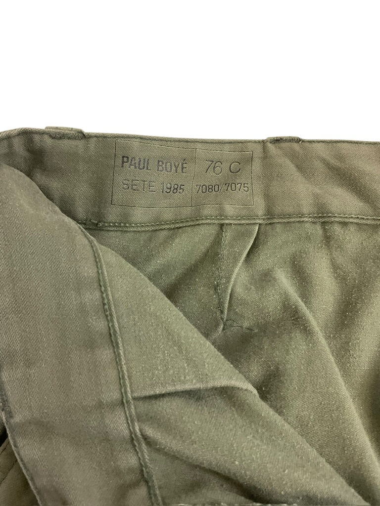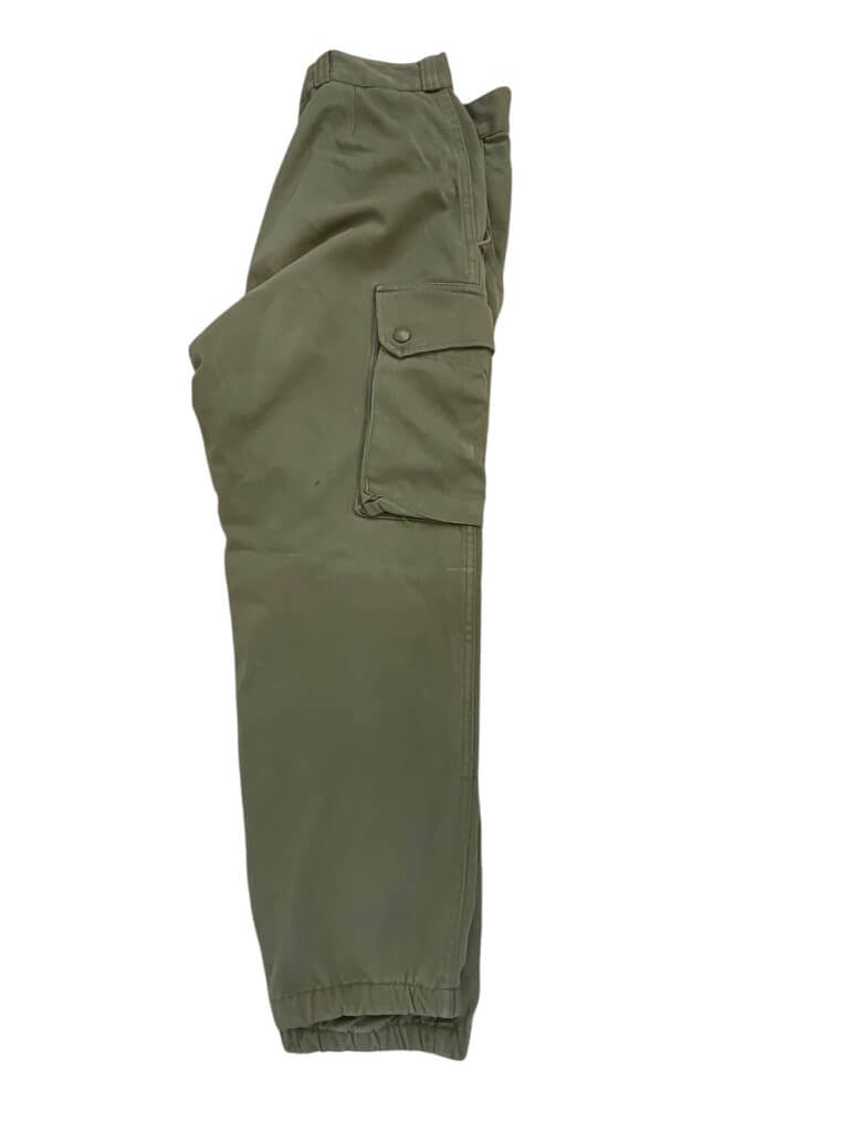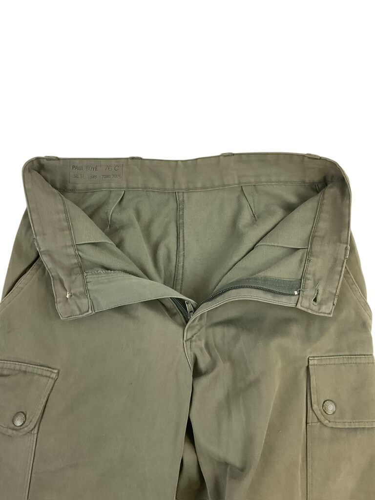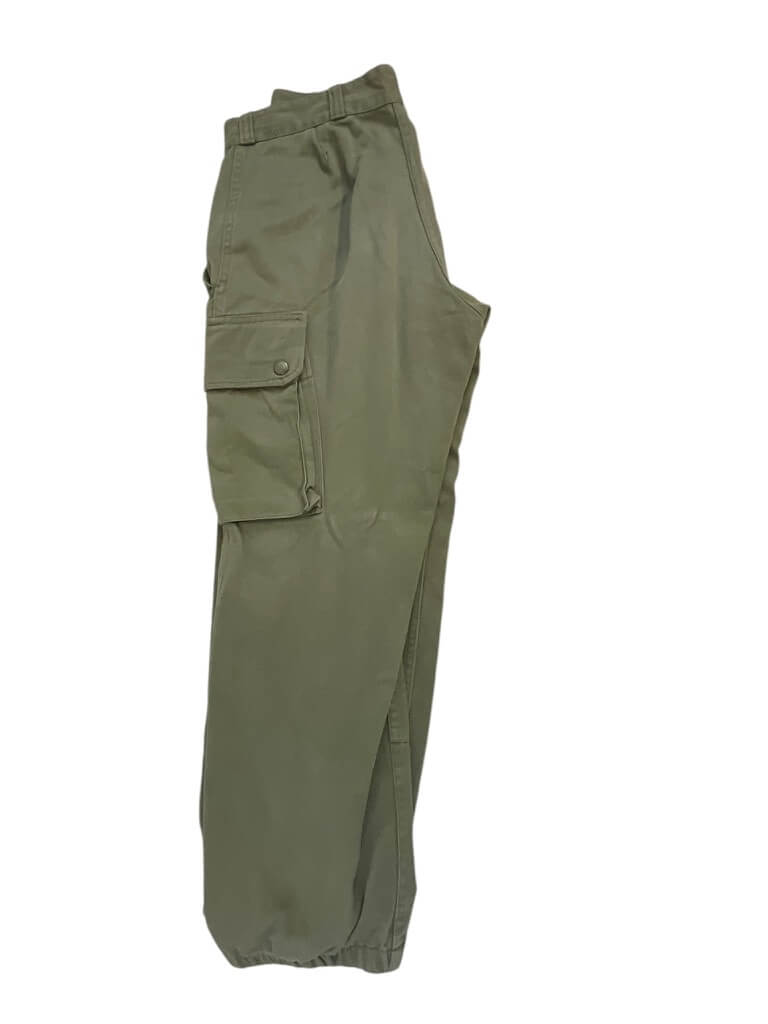 The French Army OD Green Corporals Combat Shirt (Size 96C) and Pants (Size 76C) are original uniform components used by the French military. The shirt is constructed from durable olive drab (OD) cotton-blend fabric and features reinforced elbows, button front closure, and chest pockets typical of French combat attire from late 20th century service. The size 96C shirt is designed for individuals with a chest circumference of approximately 96 cm and a standard body length. The accompanying combat pants, size 76C, are similarly manufactured from sturdy OD green material. They include buttoned fly, belt loops, side and back pockets, and reinforced knee areas for added durability. Size 76C corresponds to a waist circumference of approximately 76 cm with regular leg length. This set represents standard-issue uniform items for French corporals and reflects the typical design and materials of the period. These garments are collected for their historical and military significance.