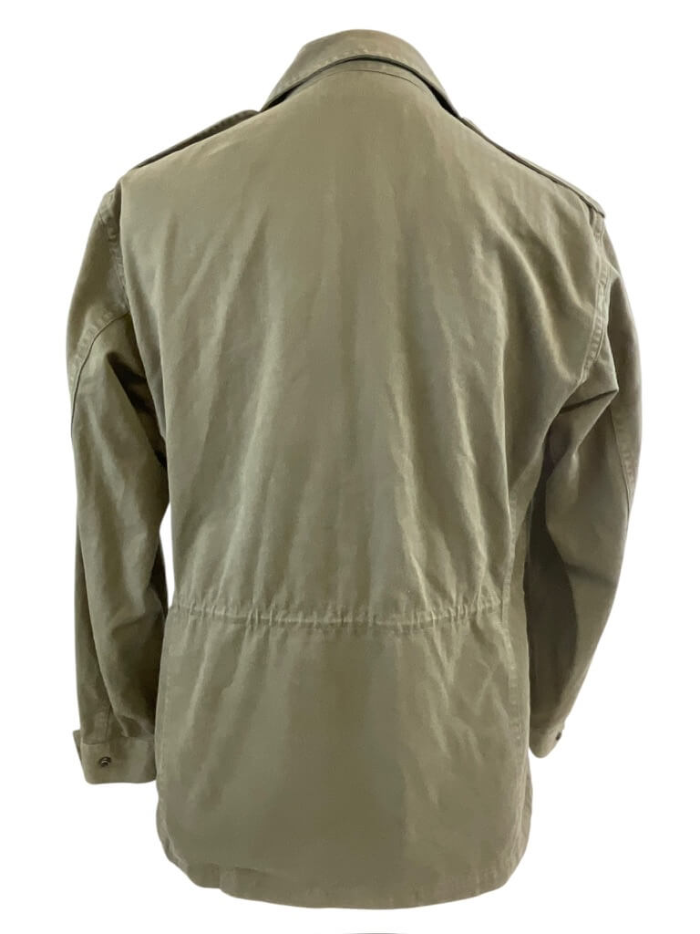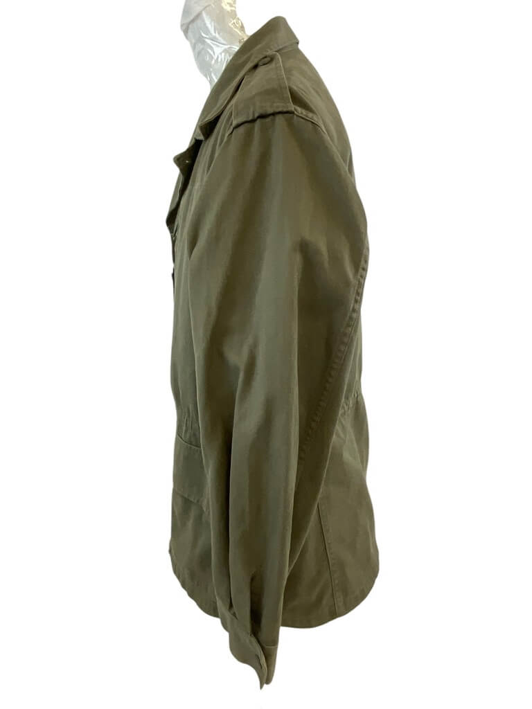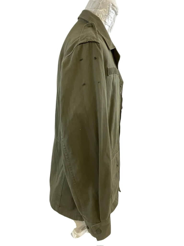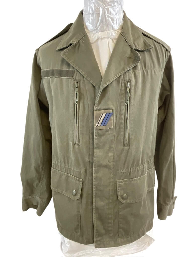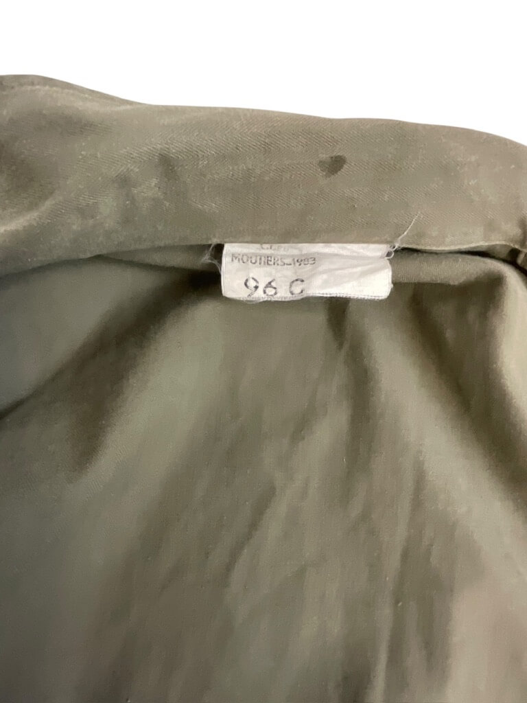 The French Army OD Green Corporals Combat Shirt (Size 96C) and Pants (Size 76C) are original uniform components used by the French military. The shirt is constructed from durable olive drab (OD) cotton-blend fabric and features reinforced elbows, button front closure, and chest pockets typical of French combat attire from late 20th century service. The size 96C shirt is designed for individuals with a chest circumference of approximately 96 cm and a standard body length. The accompanying combat pants, size 76C, are similarly manufactured from sturdy OD green material. They include buttoned fly, belt loops, side and back pockets, and reinforced knee areas for added durability. Size 76C corresponds to a waist circumference of approximately 76 cm with regular leg length. This set represents standard-issue uniform items for French corporals and reflects the typical design and materials of the period. These garments are collected for their historical and military significance.