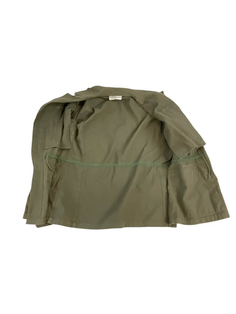 The French Army OD Green Corporals Combat Shirt (Size 96C) and Pants (Size 76C) set consists of authentic, original-issue French military uniform components. The combat shirt is constructed from durable olive drab (OD) cotton or cotton-blend fabric, commonly used by French ground forces for field operations. It features front button closure, two chest pockets with buttoned flaps