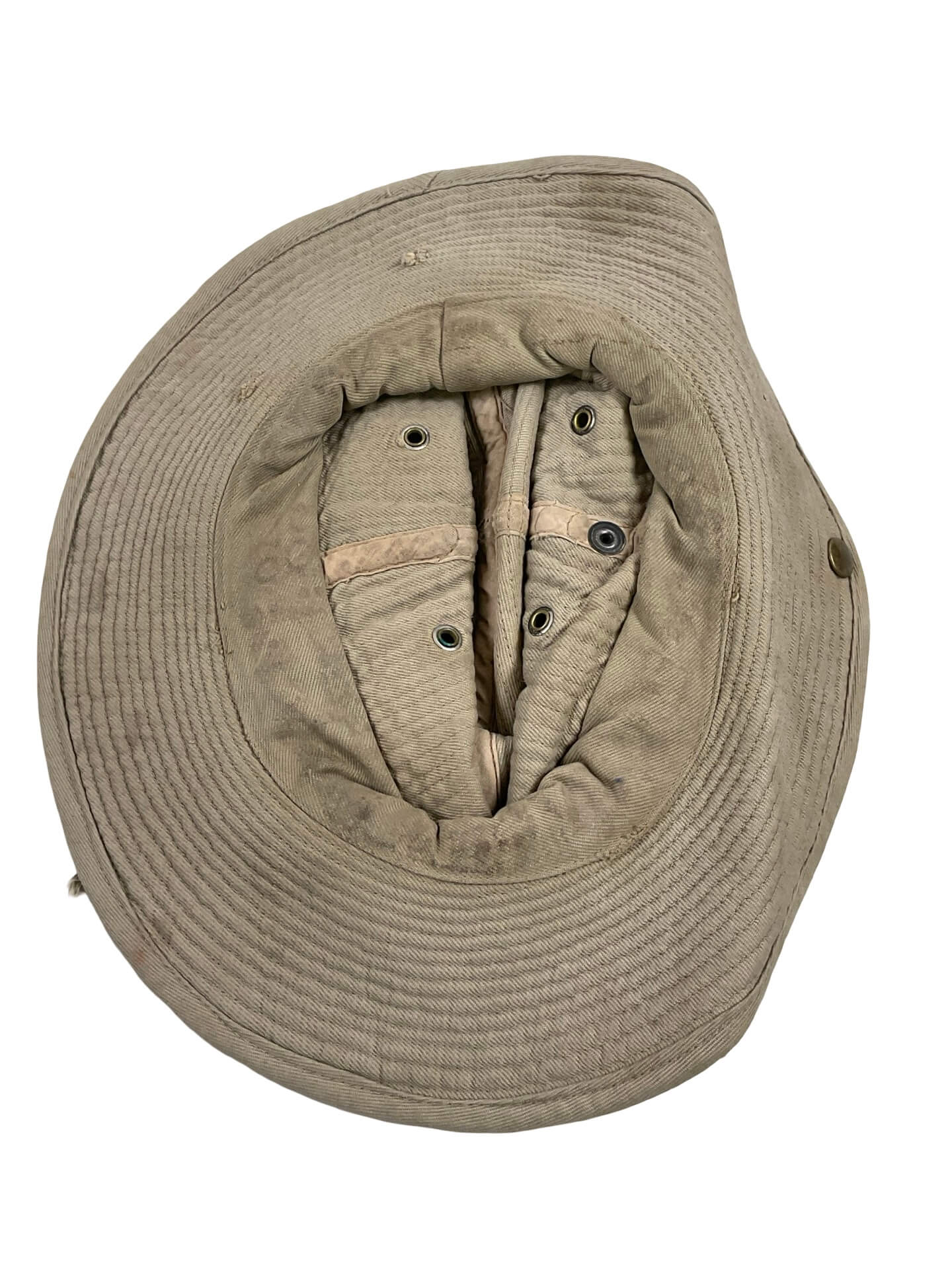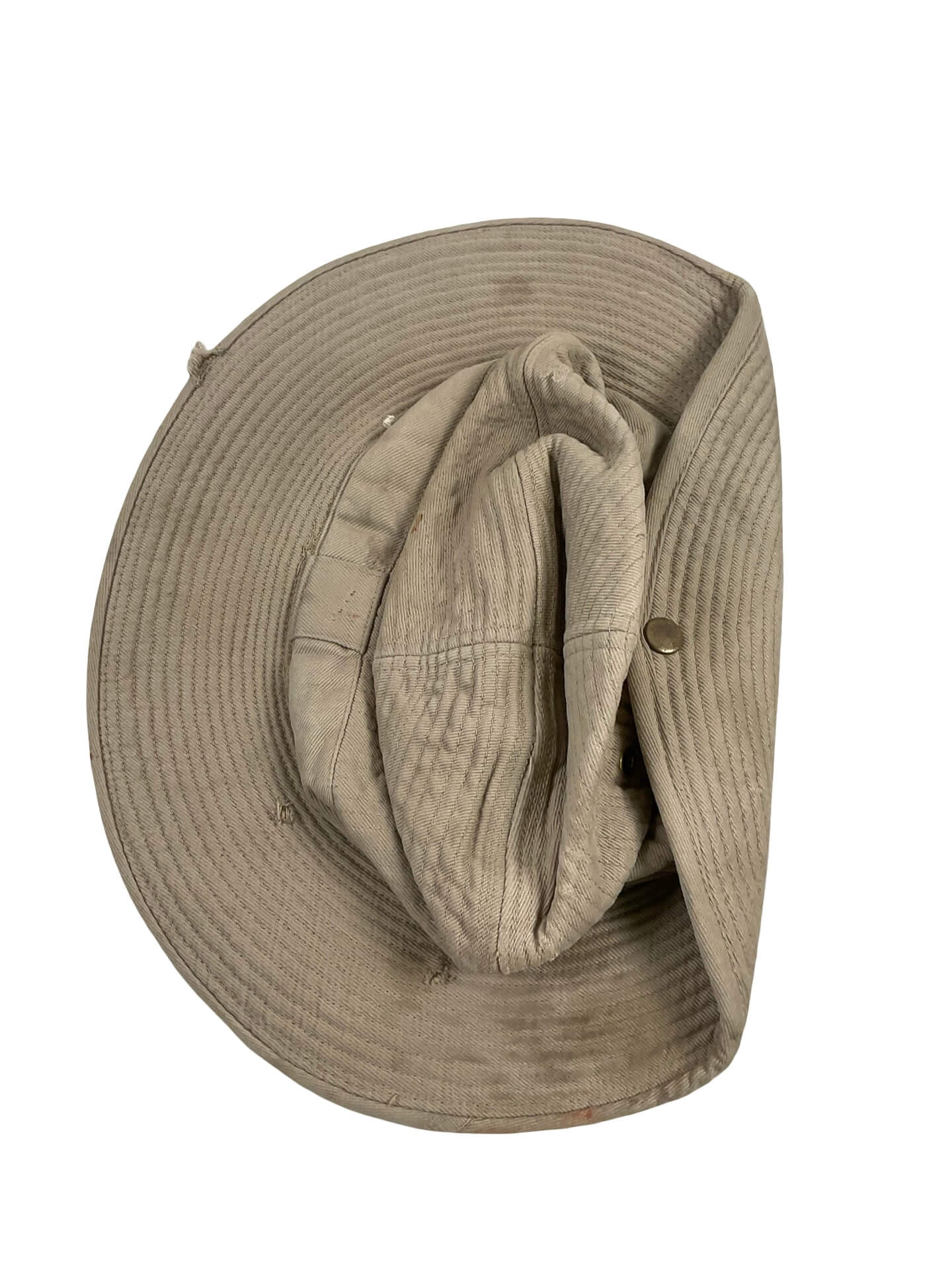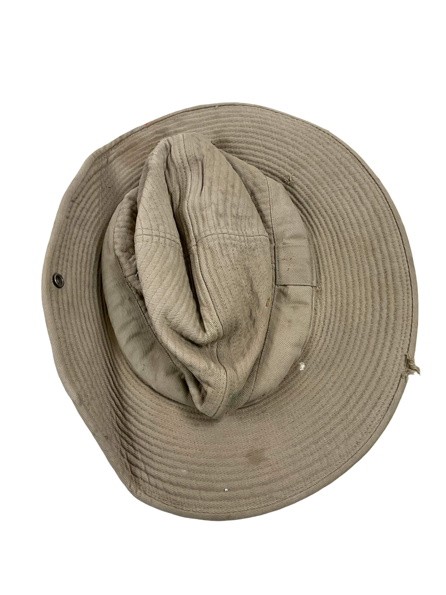 The French Army Vietnam Indochina Bush Hat (Small Size) is an original military headgear issued during the First Indochina War (1946–1954). Designed to provide effective protection from sun and rain in tropical environments, this bush hat features a lightweight and breathable cotton construction. The design typically includes a wide, downward-sloping brim and reinforced stitching for durability in field conditions. Ventilation eyelets are present to allow for air circulation, making the hat suitable for extended use in hot climates. The small size is intended for smaller head circumferences, conforming to standard French military sizing of the period. This hat was standard issue for French troops operating in Indochina and represents a distinctive example of mid-20th-century military adaptation to colonial warfare environments. The hat often shows signs of wear consistent with age and use, and may bear faded markings or stamps from original military supply. It serves as a representative artifact of French military history in Southeast Asi