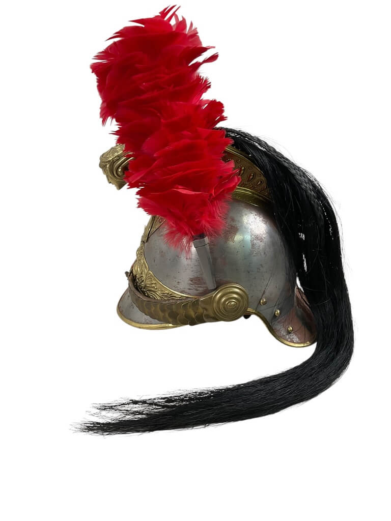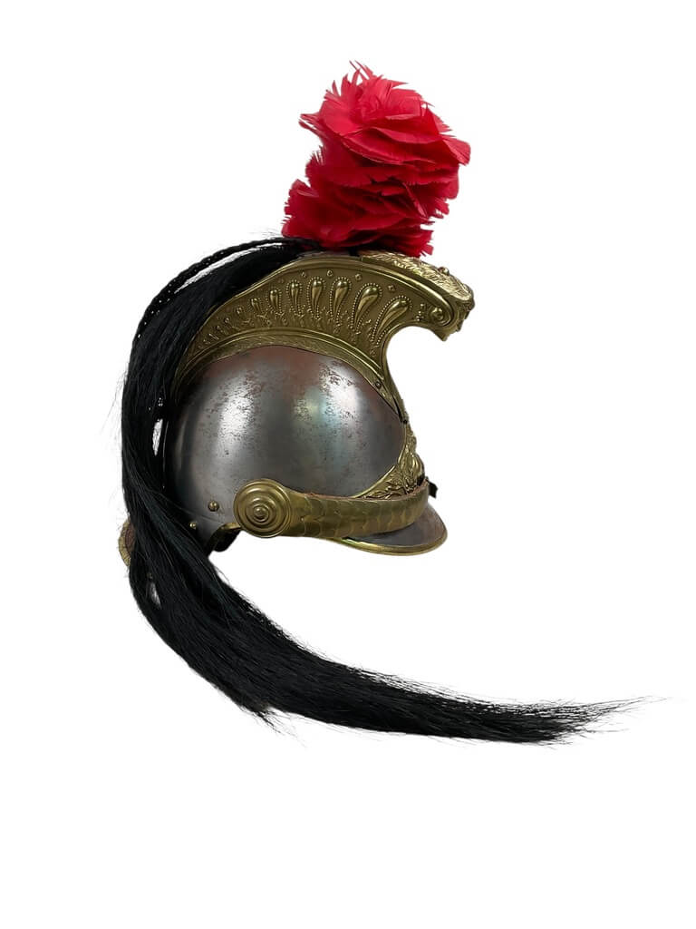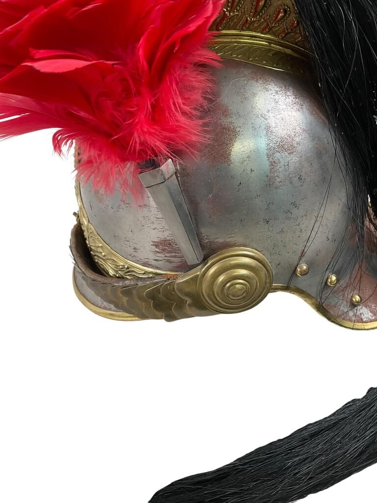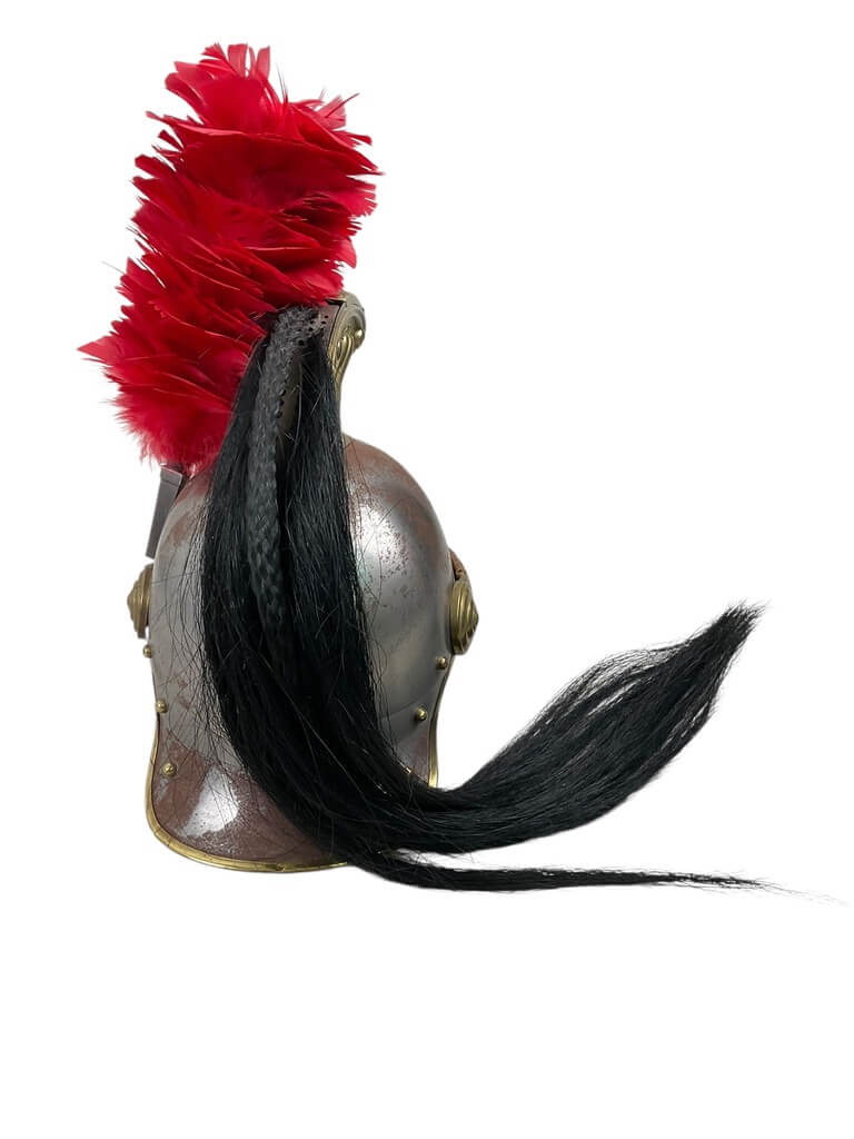 The French Cavalry Helmet Size 57 is a replica of traditional headgear worn by the French military’s cavalry units. This object displays characteristic features of French cavalry helmets, such as the iconic eagle-topped crest, large brass ornamentation, and a robust leather chin strap. The helmet is produced in size 57, indicating a circumference of 57 centimetres, suitable for a head size approximately between 22-23 inches, a common size for adult males. The helmet is typically constructed from durable materials such as steel and brass, ensuring longevity and resistance to damage. Its design elements reflect historical forms and decorations, making it an object of interest for collectors, history enthusiasts or reenactment participants. It is crucial to note this helmet is a representation of its historical counterpart and not suitable for contemporary military use. Overall, the French Cavalry Helmet Size 57 offers a faithful representation of French military history.