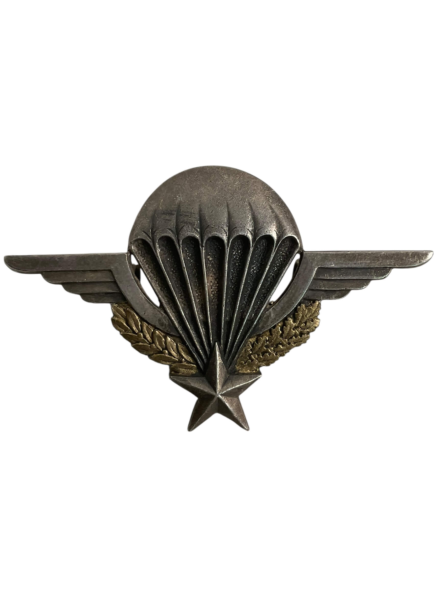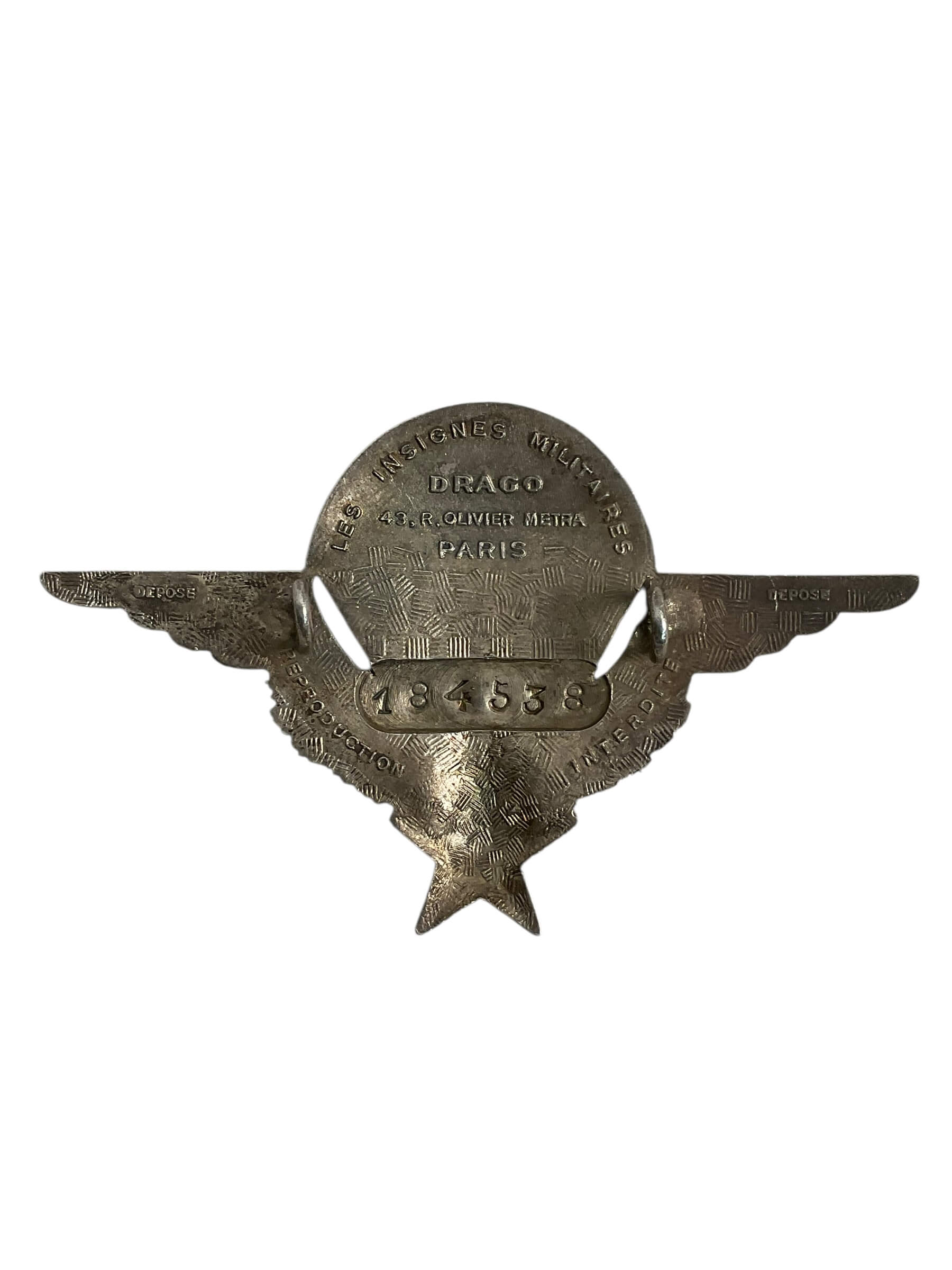 The French Indochina Numbered Airborne Parachute Wing is a military insignia issued to qualified paratroopers serving in French Indochina during the mid-20th century. This wing represents the airborne forces active in the region, primarily during the First Indochina War (1946–1954). The design typically features a spread-winged parachute with a central figure—often a stylized parachutist—accompanied by a distinctive serial number on the front, individualizing each badge to its original recipient. Constructed from metal alloys, the insignia was intended for wear on the uniform over the left breast pocket, signifying completion of airborne training and active service in parachute units. The numbering system assists in tracing the distribution and verification of authentic awards. This wing is an artifact associated with French colonial military history, reflecting both the organizational structure and specialized recognition present within the airborne troops engaged in the conflict in Indochina.