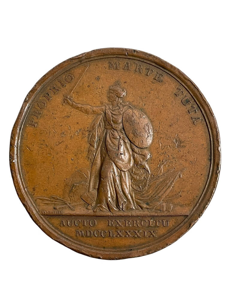 The French Napoleonic Battle of Borodino 1812 Bronze Medallion commemorates the significant confrontation between Napoleon’s Grand Armée and Russian forces during the French invasion of Russia. Crafted from bronze, the medallion typically features motifs or inscriptions referencing the Battle of Borodino, fought on September 7, 1812, near Moscow. This engagement was one of the largest and bloodiest battles of the Napoleonic Wars, resulting in substantial casualties on both sides and marking a pivotal moment in the campaign. Medallions of this type were produced to honor military events and serve as tokens of remembrance for participants, supporters, or as official issue. The item’s design may include the profiles of military leaders, allegorical figures, dates, or specific battle references. Such artifacts provide insight into early 19th-century commemorative practices and reflect the historical significance attributed to major military encounters of the Napoleonic era. The medallion is a representative example of period military memorabilia.