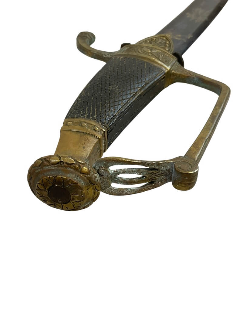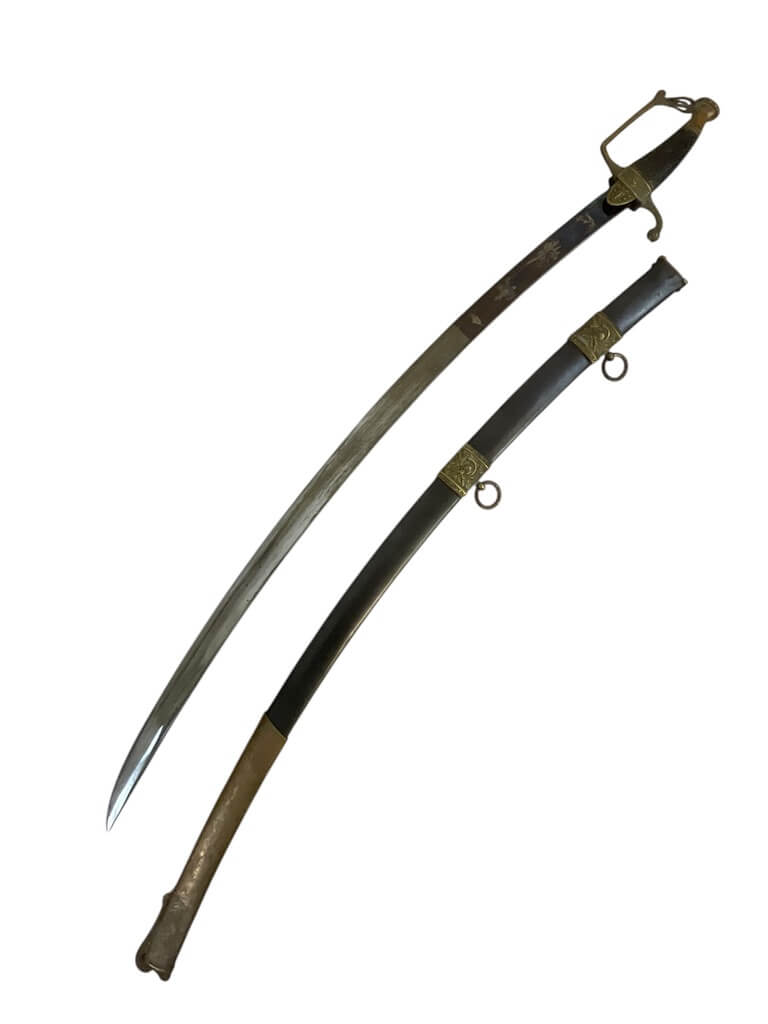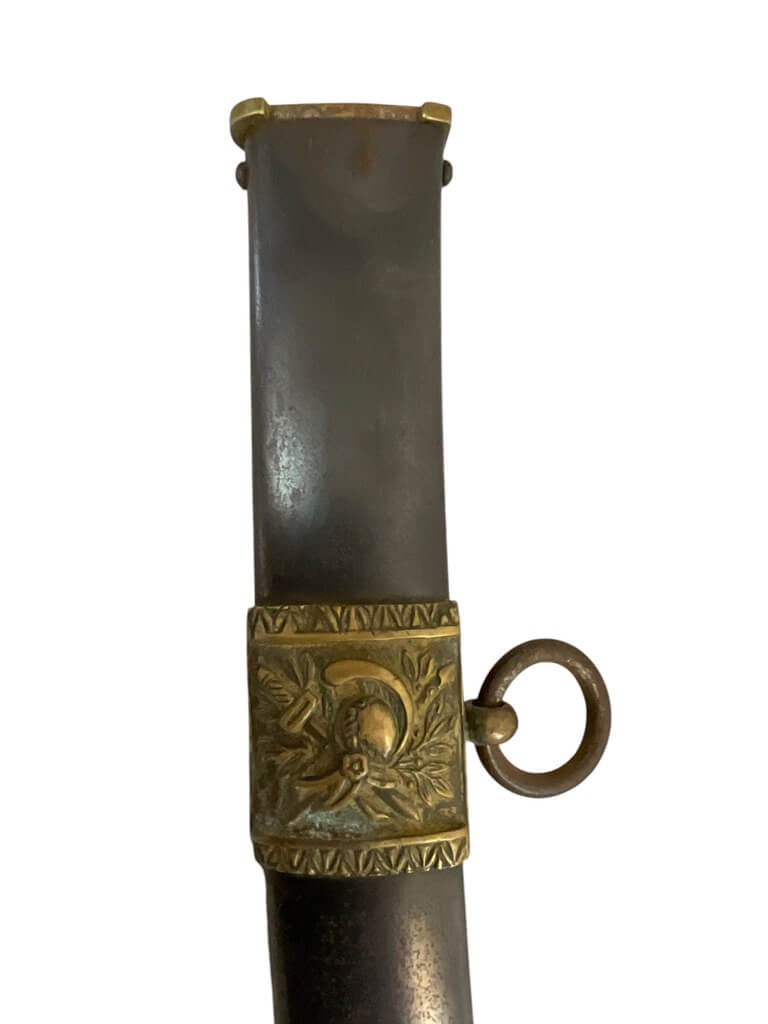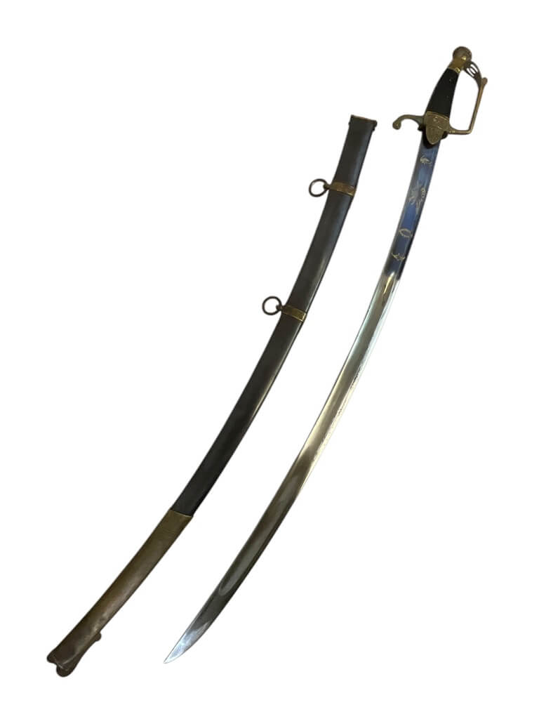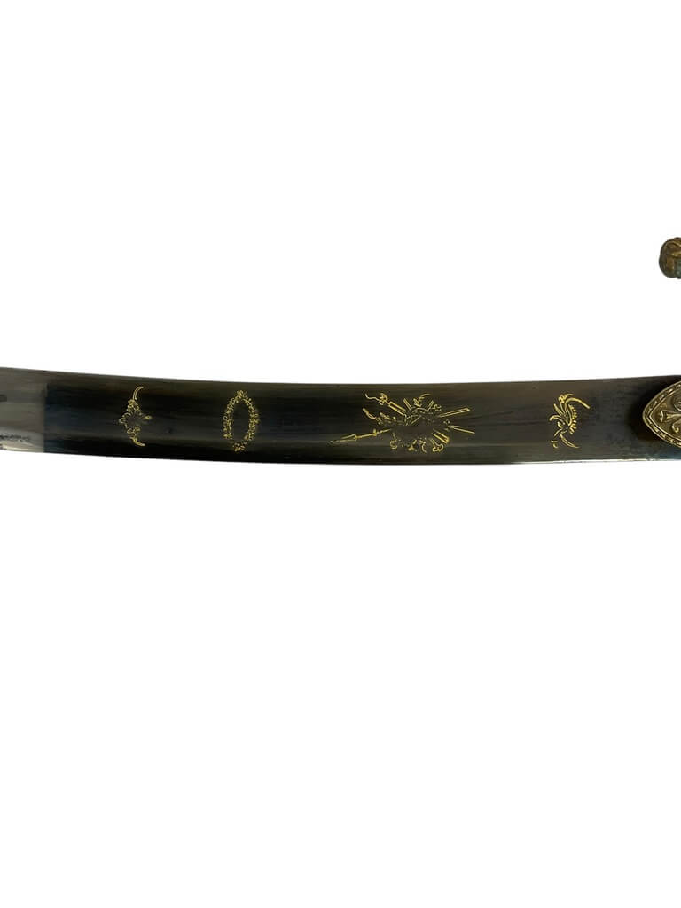 This French Napoleonic Cavalry Officer’s Sword is an exquisite representation of historical weaponry. It showcases a dazzling, blued and gilt blade, offering a striking contrast against its robust steel scabbard. The sword’s blade is emblazoned with intricate gold inlay, a testament to its production during the Napoleonic era. The handle, is ornately decorated, reflecting the military prestige of a French Cavalry officer. The steel scabbard, sturdy and polished, complements the blade, enhancing the sword’s overall elegance. With its combination of form and function, this sword is more than a weapon; it is a piece of history, capturing the glory and grandeur of the Napoleonic age. Whether you’re a collector of antique weapons, a history enthusiast or a fan of unique artifacts, this French Napoleonic Cavalry Officer’s Sword with Steel Scabbard and Blue and Gilt Blade is a must-have.