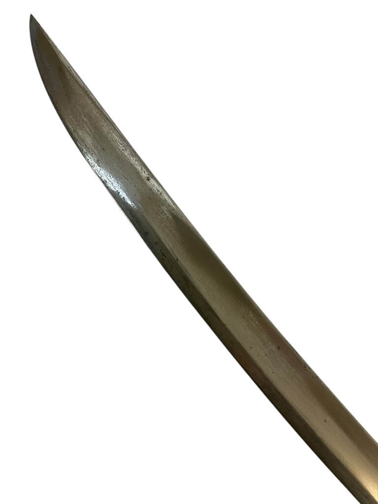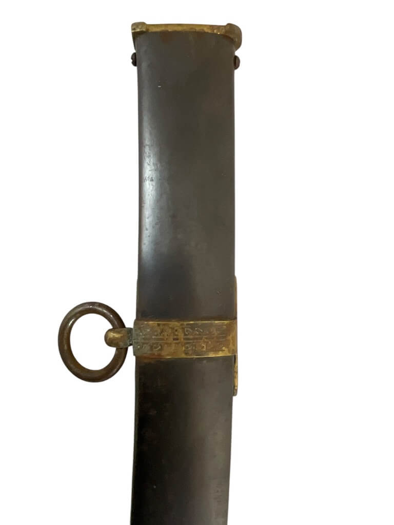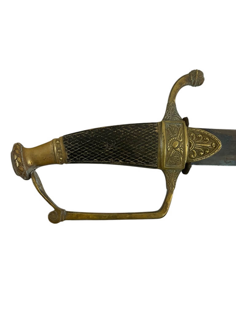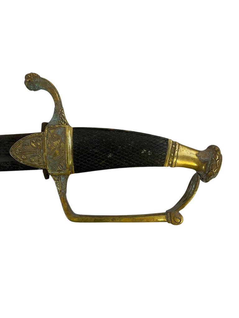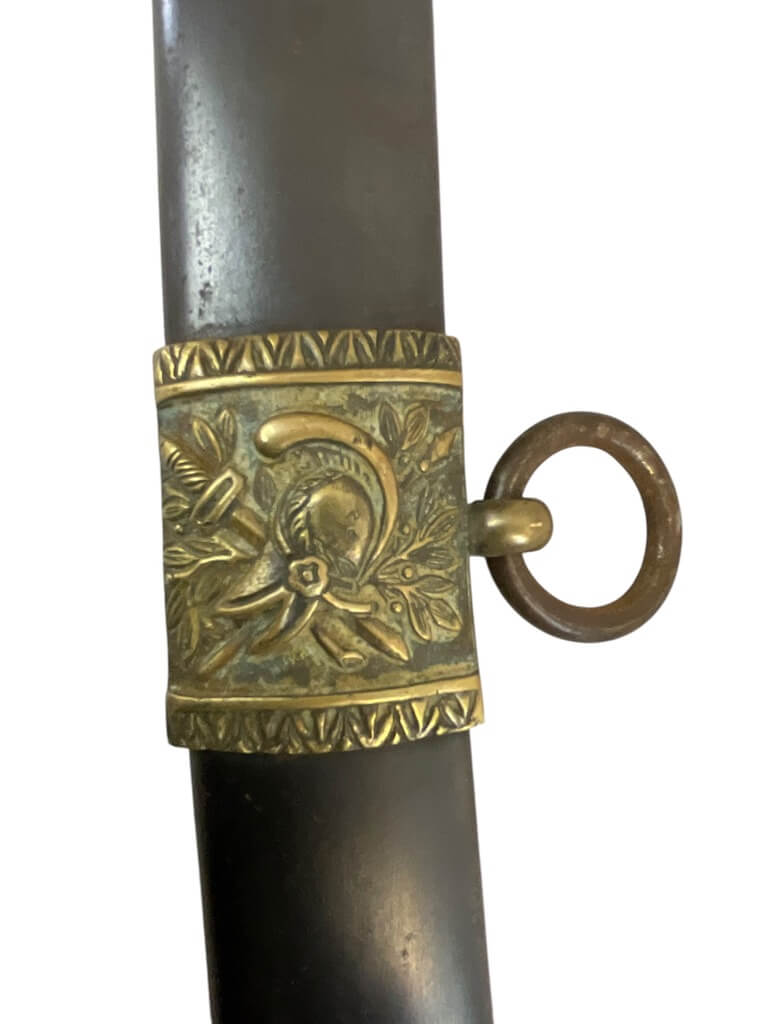 This French Napoleonic Cavalry Officer’s Sword is an exquisite representation of historical weaponry. It showcases a dazzling, blued and gilt blade, offering a striking contrast against its robust steel scabbard. The sword’s blade is emblazoned with intricate gold inlay, a testament to its production during the Napoleonic era. The handle, is ornately decorated, reflecting the military prestige of a French Cavalry officer. The steel scabbard, sturdy and polished, complements the blade, enhancing the sword’s overall elegance. With its combination of form and function, this sword is more than a weapon; it is a piece of history, capturing the glory and grandeur of the Napoleonic age. Whether you’re a collector of antique weapons, a history enthusiast or a fan of unique artifacts, this French Napoleonic Cavalry Officer’s Sword with Steel Scabbard and Blue and Gilt Blade is a must-have.