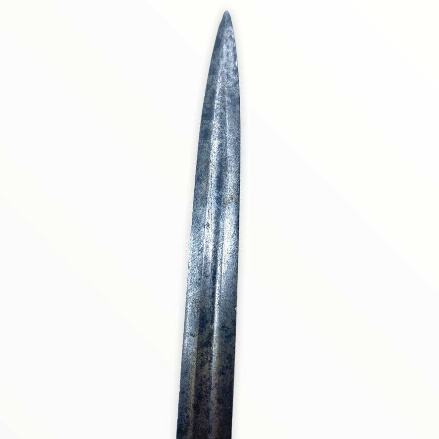 The French Napoleonic Navy Scottish RN Officers Dirk Dagger is a captivating artifact from the early 19th century, showcasing the unique fusion of French naval history and Scottish craftsmanship. Measuring nearly 16 inches in blade length, this dirk exhibits an impeccable handle and a flawlessly preserved structure. A notable feature is the guard, adorned with a Scottish thistle motif, replacing the typical anchor symbol, and adorned with exquisite gilt detailing on both the guard and pommel. While the blade bears intricate etchings, they remain partially obscured due to age-related darkening, preserving their mysterious allure. Despite the lack of identifiable maker marks, this dirk stands as an impressive piece of military history, offering a glimpse into the distinguished service of Scottish Royal Navy officers during the Napoleonic era. This remarkable dirk dagger is perfect for collectors and historians alike, reflecting a rich heritage and exceptional artistry.