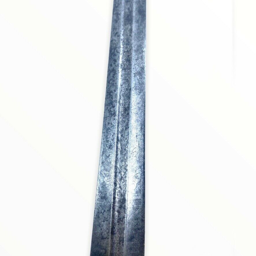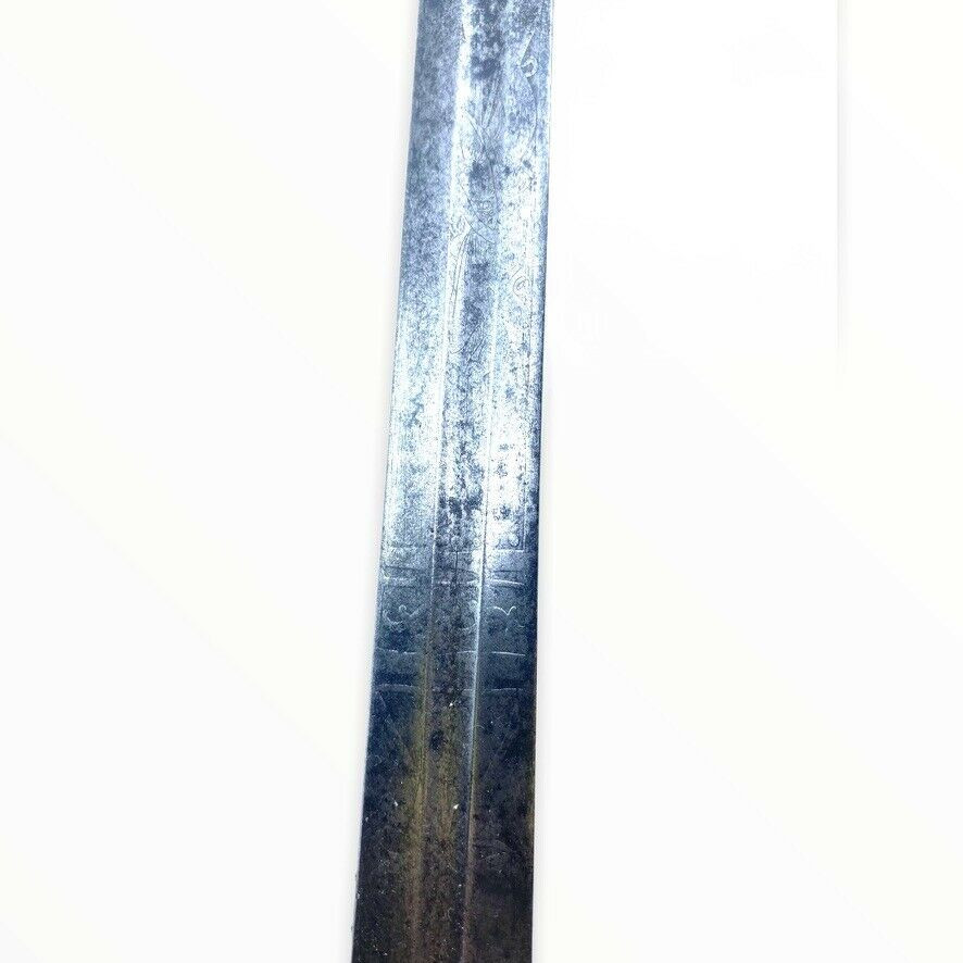 French Napoleonic Navy Scottish RN Officers Dirk Dagger. The blade length is almost 16 inches. The handle has no flaws and is in perfect condition. The guard has a scottish thistle instead of an anchor on it. Nice gilt on the guard and pomel. The blade has etching but because of the darking of the blade it is harder to make out exactly what it says. No maker marks that I can find.