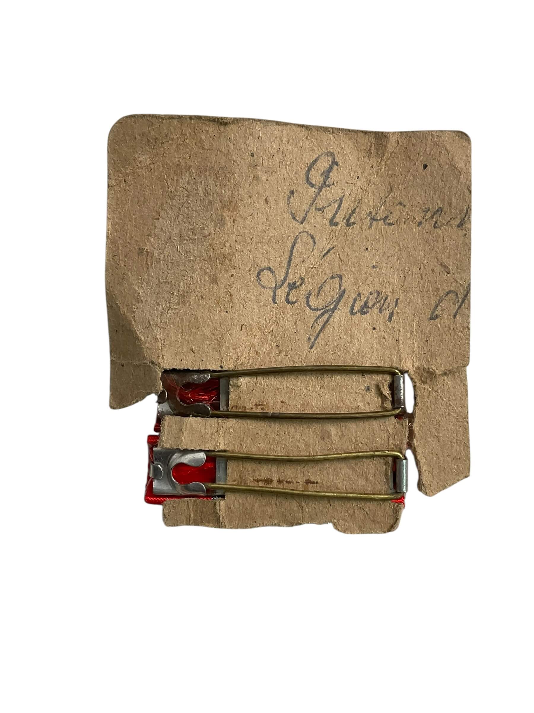 The French Ribbon Bar Medal on Card is a military insignia component used to represent the award of a medal or a decoration in the French armed forces. Ribbon bars serve as a practical alternative to wearing the actual medals in daily uniform wear, accurately displaying the holder’s earned honors. This item consists of a colored woven ribbon mounted on a rectangular bar, secured to an original card backing. The specific colors and pattern on the ribbon denote the particular medal or order it represents, with each variation corresponding to a different French military or civil decoration. Ribbon bars are typically worn above the left breast pocket of the uniform. This piece is of interest to collectors of militaria for its historical context and association with French military history. It can also serve as a reference for identification, uniform reconstruction, or educational purposes related to military awards and decorations.
