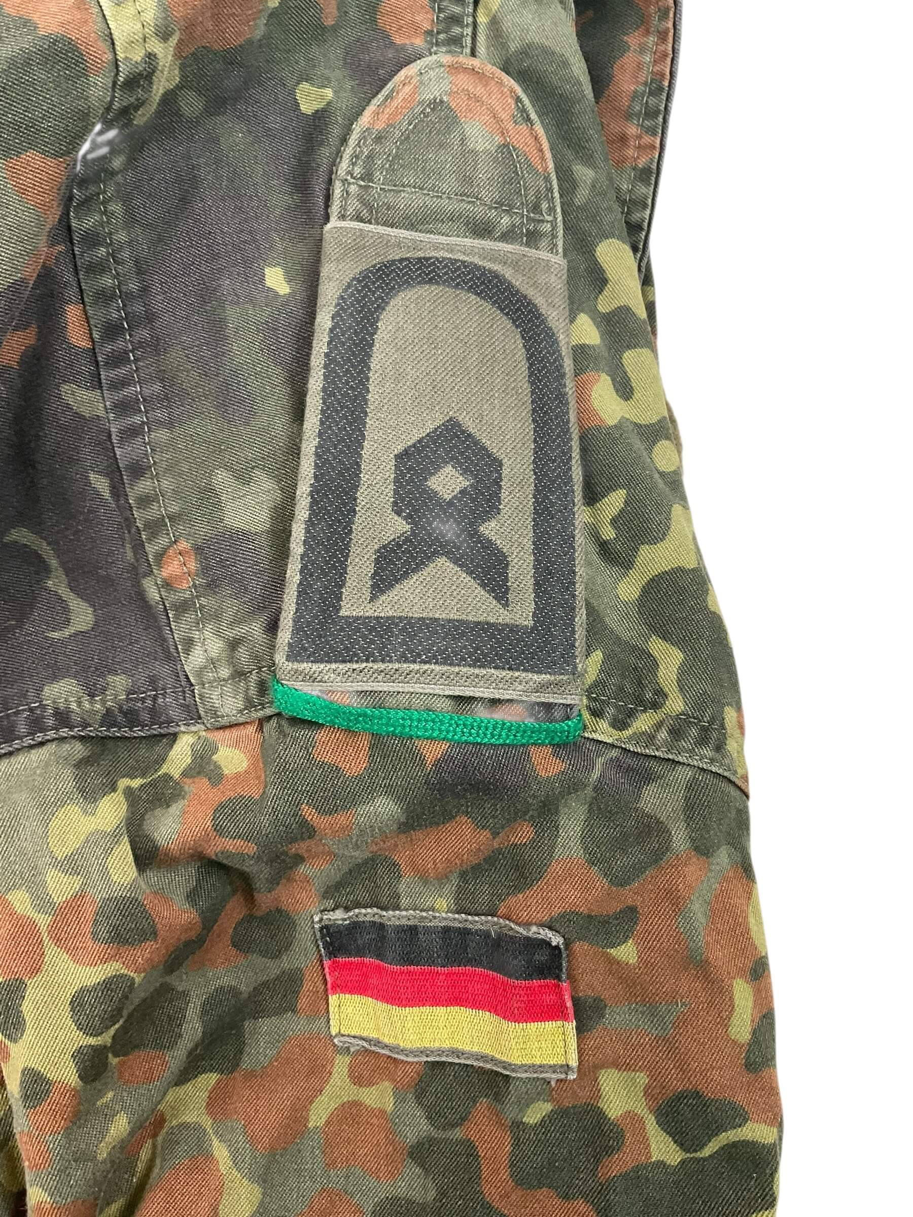 The German Army Flecktarn Camouflage Shirt, size 175-185/115, is an authentic military uniform component used by the Bundeswehr. This shirt features the distinctive Flecktarn camouflage pattern, which consists of irregular green, brown, and black spots designed for effective concealment in temperate woodland environments. Constructed from a robust cotton-blend fabric, the shirt is intended for durability and comfort during field use. Standard design elements include a button front closure, two chest pockets with buttoned flaps, shoulder epaulets, and adjustable button cuffs. The stated size, 175-185/115, corresponds to an approximate wearer height of 175–185 cm and a chest measurement of 115 cm. Flecktarn camouflage was introduced in the late 20th century and remains in use by the German armed forces. Original Flecktarn shirts are often collected or worn by military enthusiasts, reenactors, and individuals interested in military history or surplus gear.