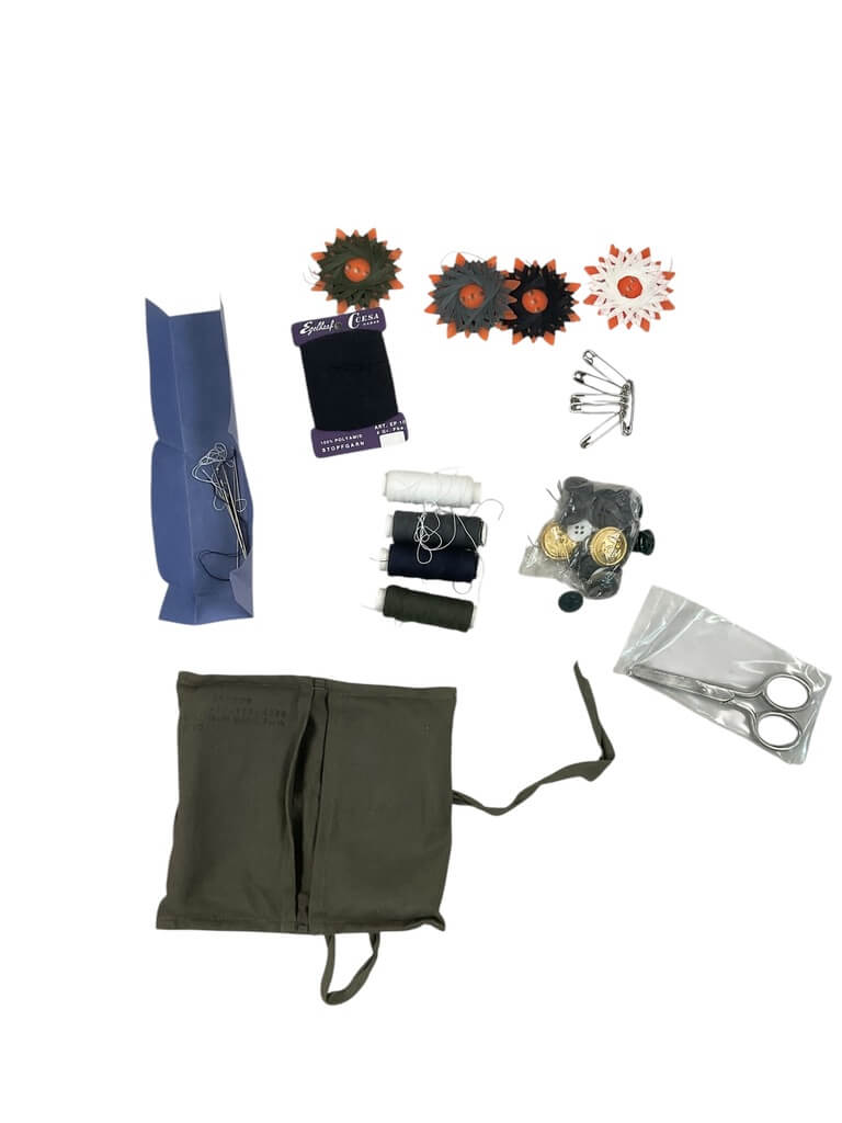 The German Army Sewing Kit with Contents is a practical military accessory, originally used by the German Army. It includes various essential sewing materials like threads, needles, buttons, and safety pins. Housed in a sturdy fabric pouch, this kit is designed for durability and convenience, ideal for mending uniforms or other clothing items.