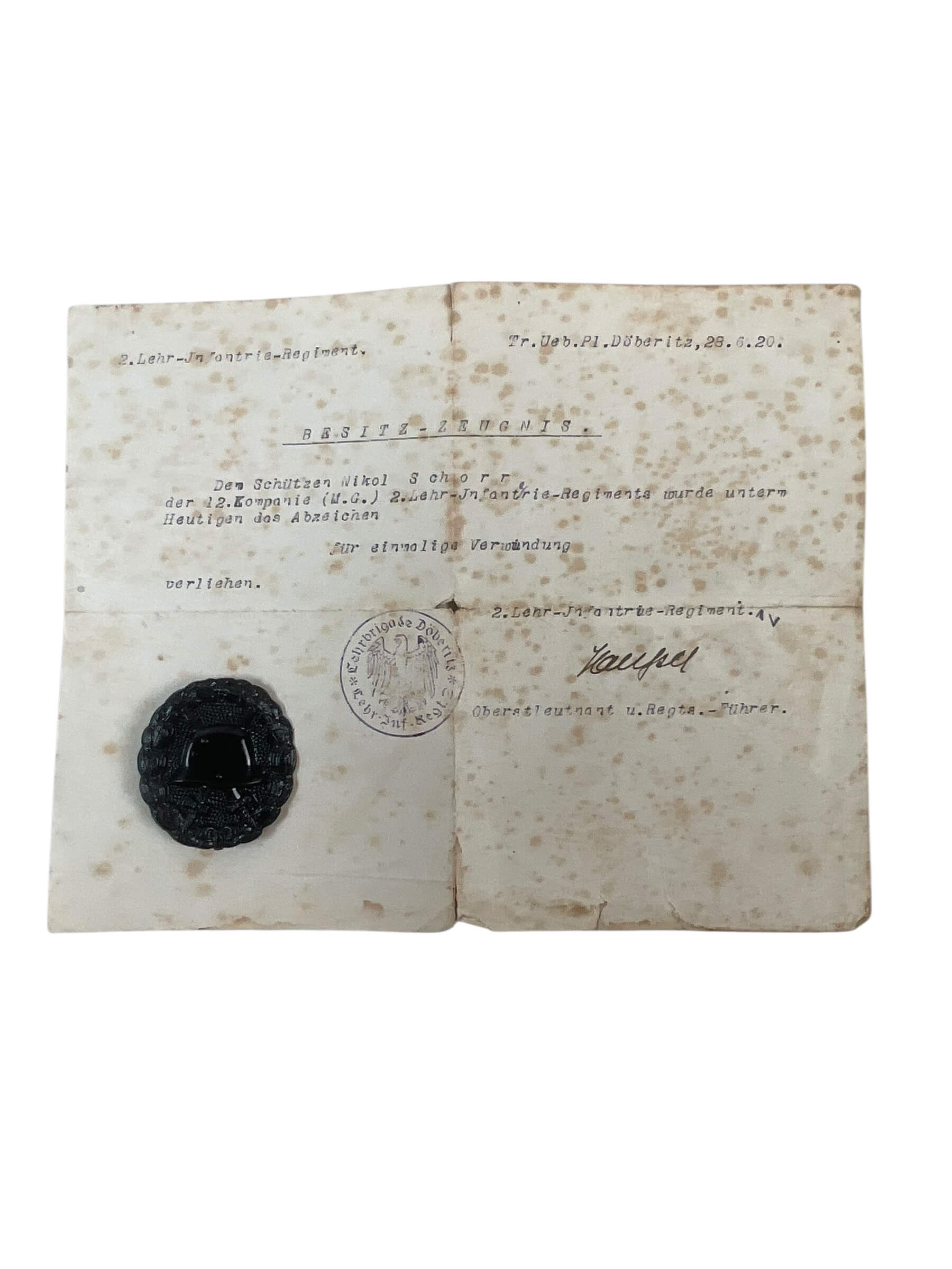 German Freikorps 2nd Lehr Infantry Regiment Black Wound Badge With Document