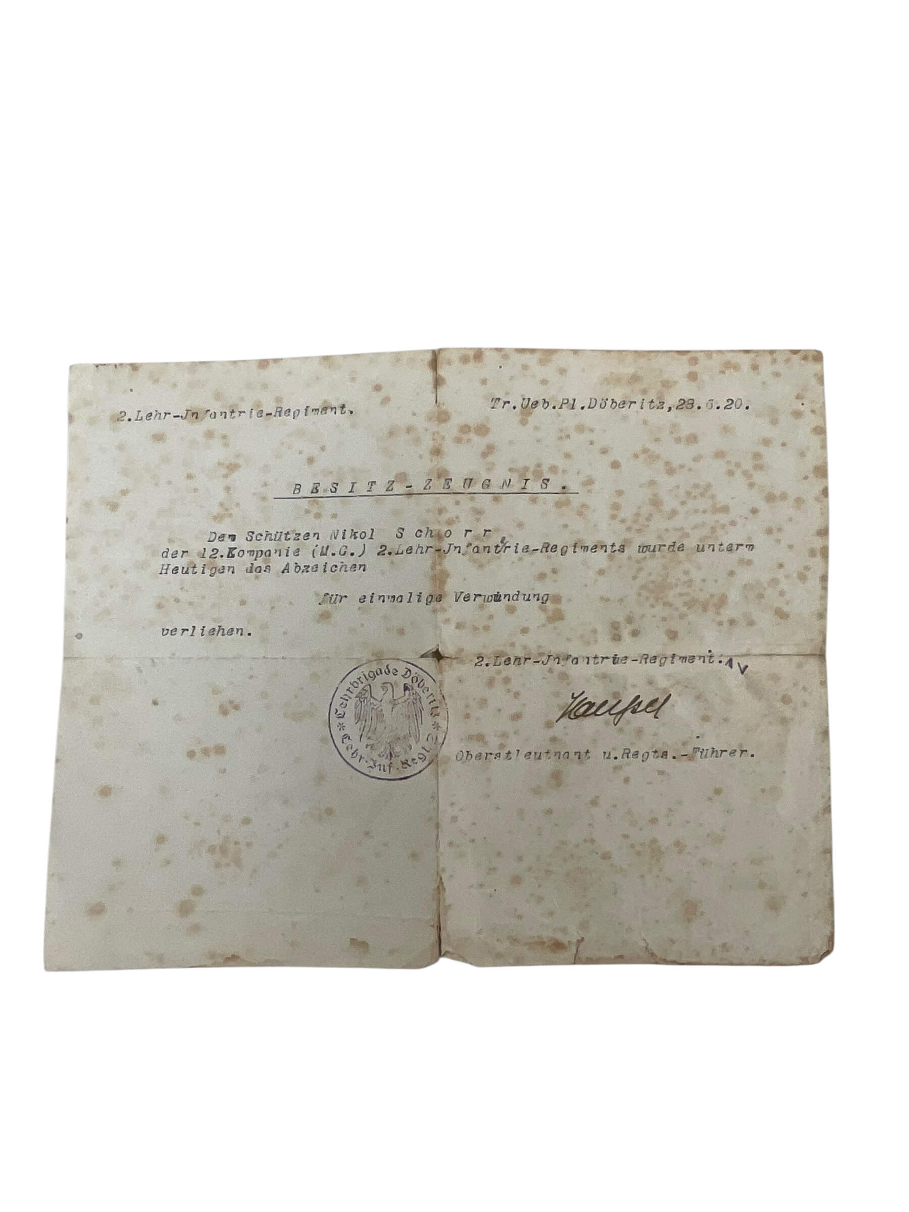 The German Freikorps 2nd Lehr Infantry Regiment Black Wound Badge with Document is an original military decoration awarded during the interwar and early WWII periods. The Black Wound Badge was instituted to recognize soldiers who sustained wounds in combat. This example is attributed specifically to a member of the 2nd Lehr Infantry Regiment, a formation associated with the German Freikorps—volunteer military units that operated in Germany following World War I. The badge is constructed of blackened metal and features the traditional oval form with a Stahlhelm (steel helmet) and crossed swords on its face, surrounded by a laurel wreath. Included with this badge is its original award document, which typically provides the recipient’s details, date of issue, and official authorization. Together, the badge and document represent an important artefact reflecting the transitional German military history of the early 20th century, particularly the activities of Freikorps units during the chaotic post-war years.