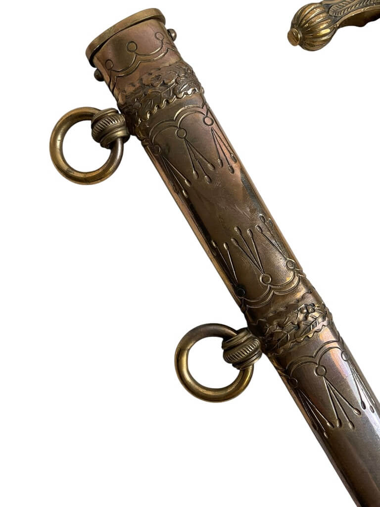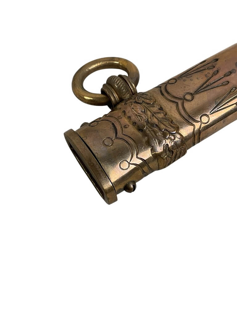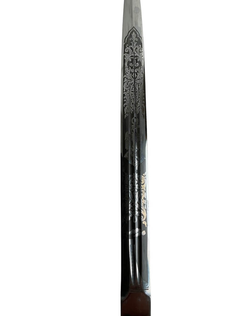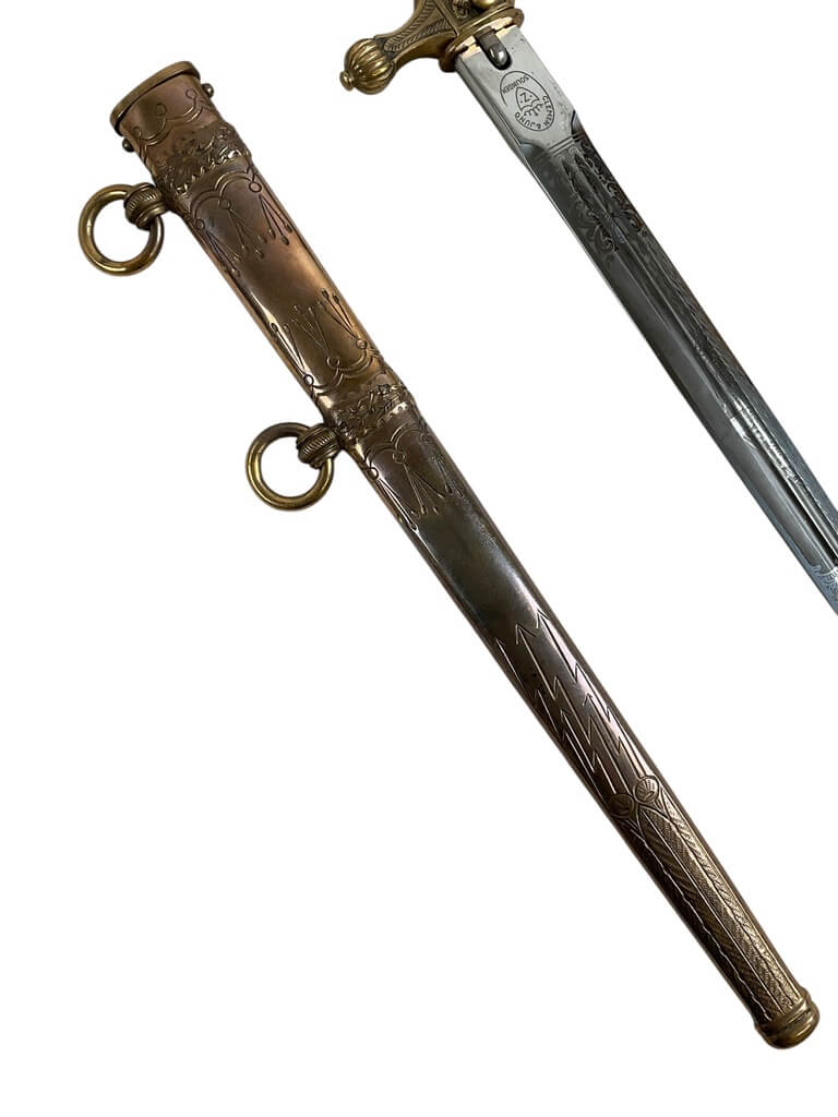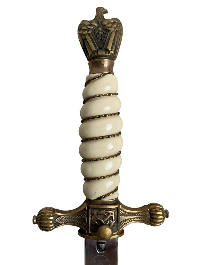 This exquisite German Kriegsmarine Dagger U-Boat Etched Blade is a fine example of historical craftsmanship by the renowned maker, Clemen and Jung. Produced during the World War II era, it embodies the strength and precision of the German navy. The dagger features a beautifully etched blade, showcasing intricate maritime designs that speak volumes of its naval association. The brass handguard and pommel are adorned with the emblematic German eagle and swastika, reflecting the era’s symbolism. The handle is crafted from ivory-coloured celluloid, wrapped in a tight cord for grip. With its original scabbard, this dagger is a true collector’s piece, offering a glimpse into the past. Please note, this is an original piece and not a reproduction. It’s an excellent addition to any military memorabilia collection, offering an authentic taste of German naval history.