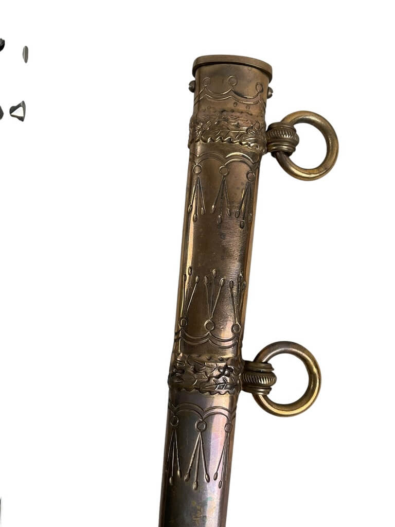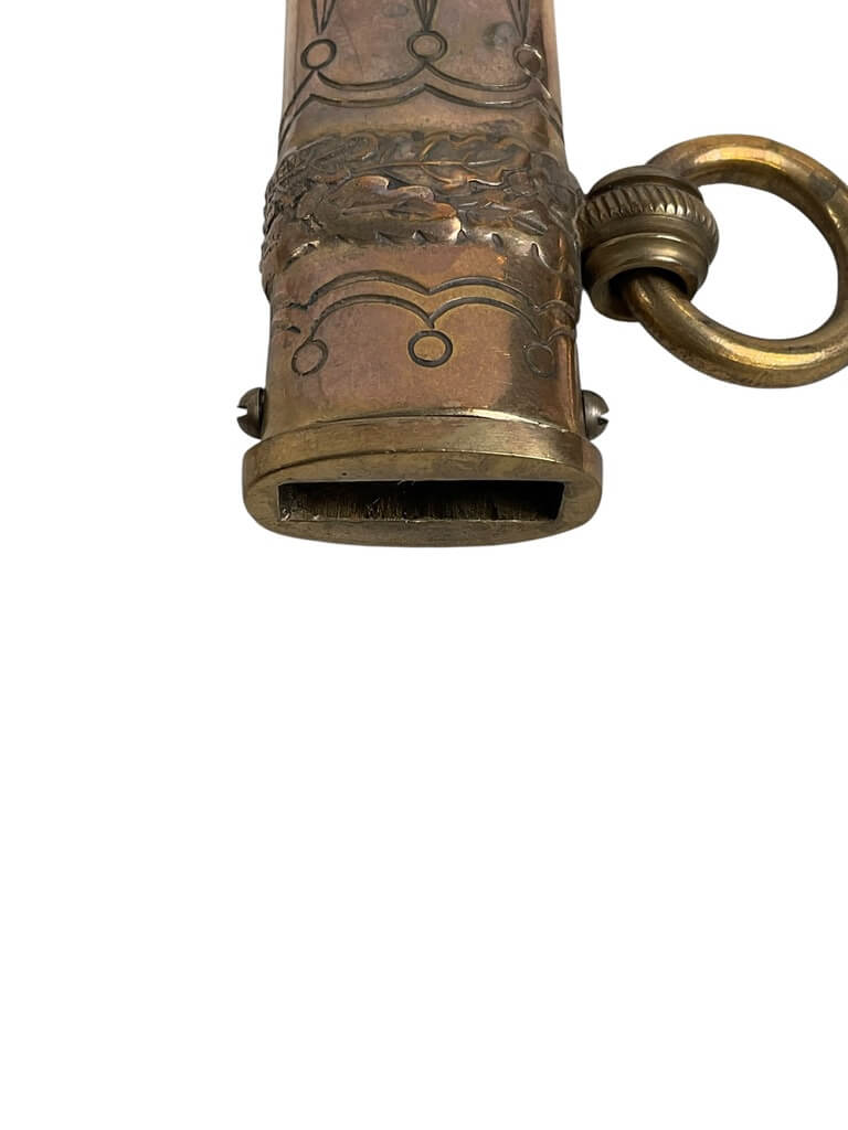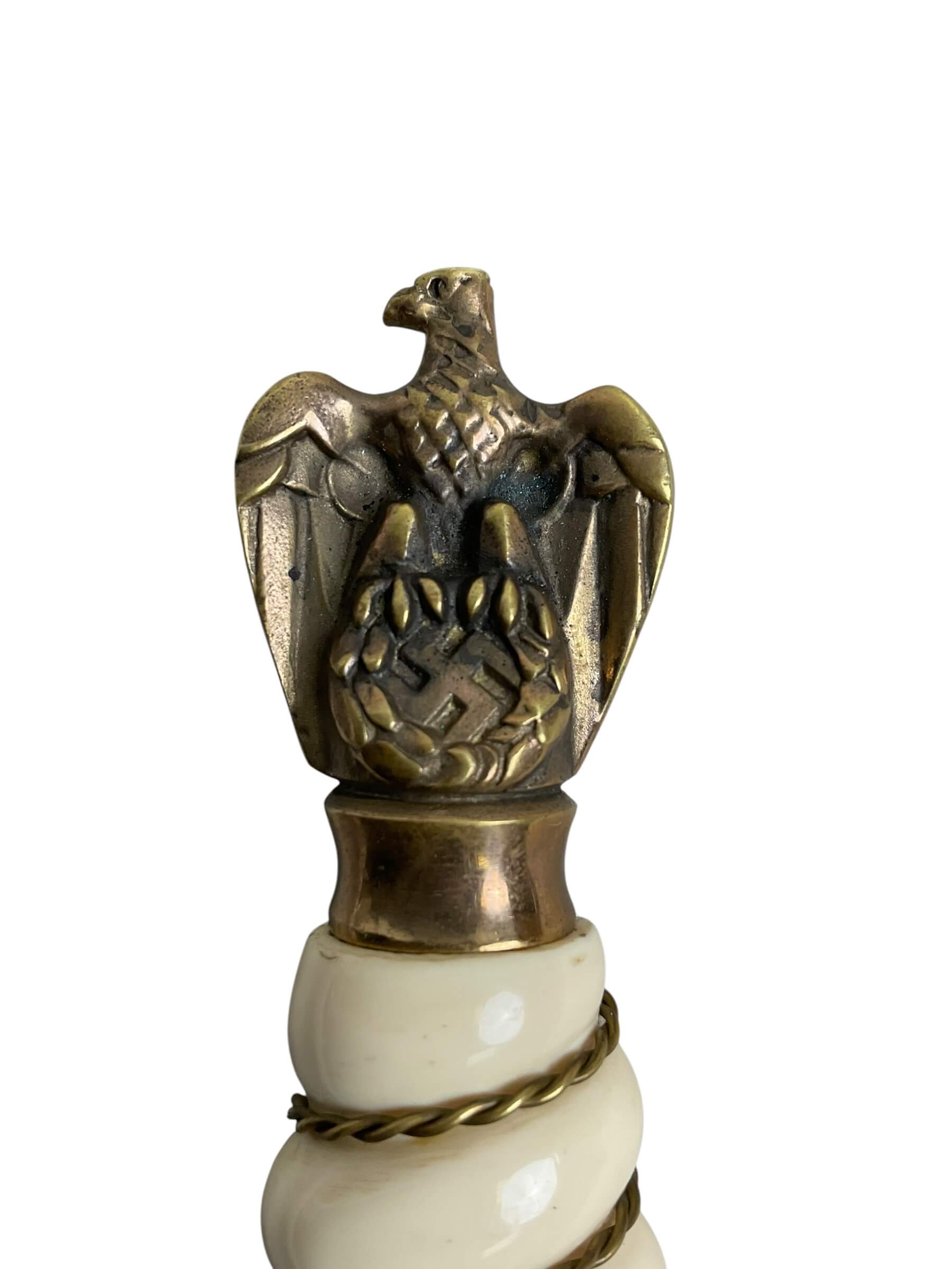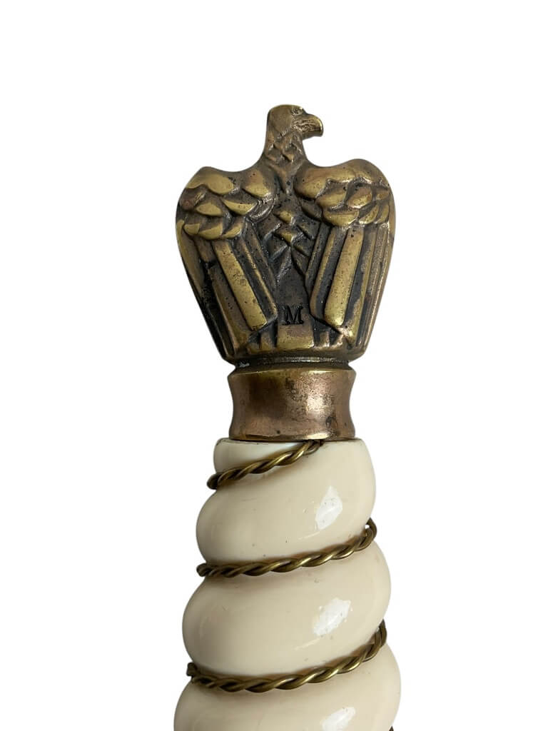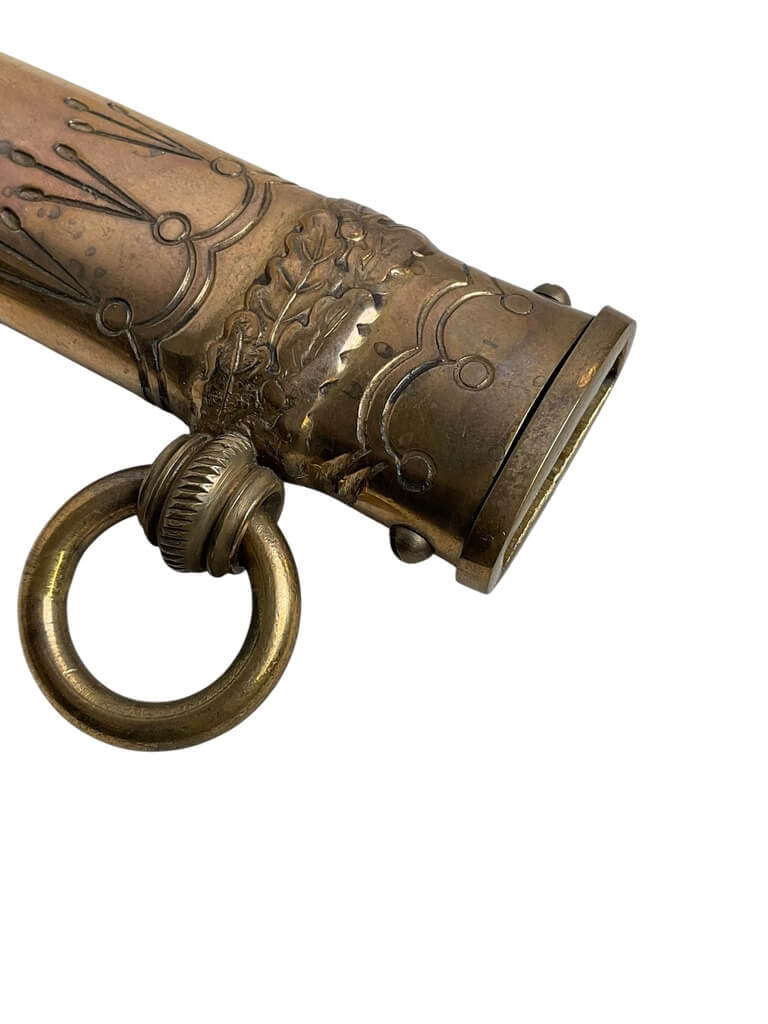 This exquisite German Kriegsmarine Dagger U-Boat Etched Blade is a fine example of historical craftsmanship by the renowned maker, Clemen and Jung. Produced during the World War II era, it embodies the strength and precision of the German navy. The dagger features a beautifully etched blade, showcasing intricate maritime designs that speak volumes of its naval association. The brass handguard and pommel are adorned with the emblematic German eagle and swastika, reflecting the era’s symbolism. The handle is crafted from ivory-coloured celluloid, wrapped in a tight cord for grip. With its original scabbard, this dagger is a true collector’s piece, offering a glimpse into the past. Please note, this is an original piece and not a reproduction. It’s an excellent addition to any military memorabilia collection, offering an authentic taste of German naval history.