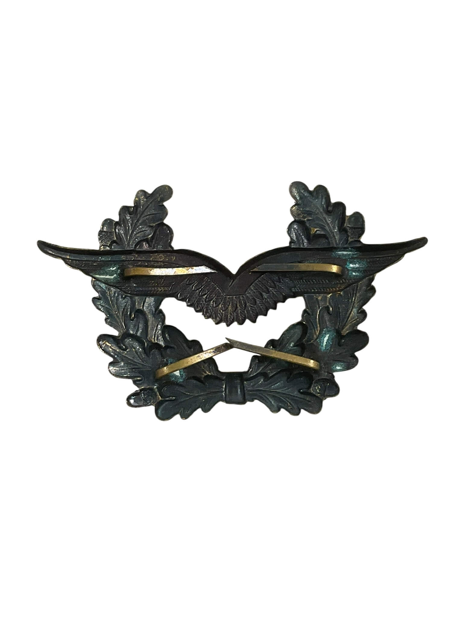 The German Luftwaffe Peak Cap Hat Badge was an insignia worn on the service caps of personnel in the Luftwaffe, the aerial warfare branch of Nazi Germany during the Second World War. This badge typically consists of a combination of an eagle clutching a swastika and an oak leaf wreath surrounding a cockade, produced in metal and designed to be affixed to the front of the peaked cap. The detailing often includes distinct feather and leaf patterns, and variations exist depending on the manufacturer and the period of issue. The badge served both as an emblem of rank and affiliation, aligning with broader Wehrmacht uniform regulations of the era. Its design reflects official military symbolism of the time, adhering to standardized insignia protocols. Luftwaffe cap badges were utilized across different ranks and branches within the air force, making them identifiable components of German military dress from 1935 to 1945.