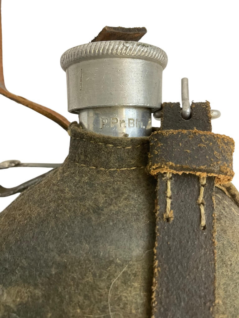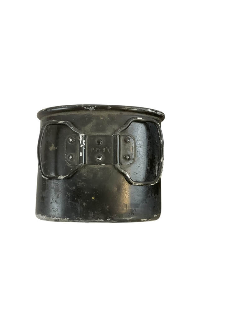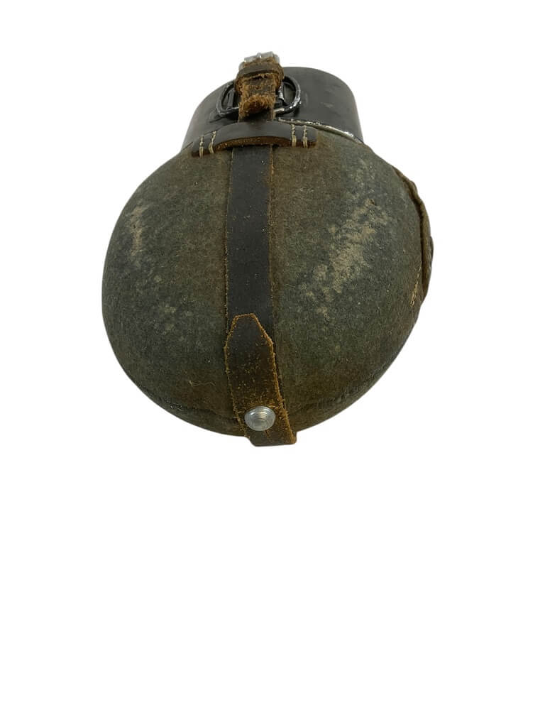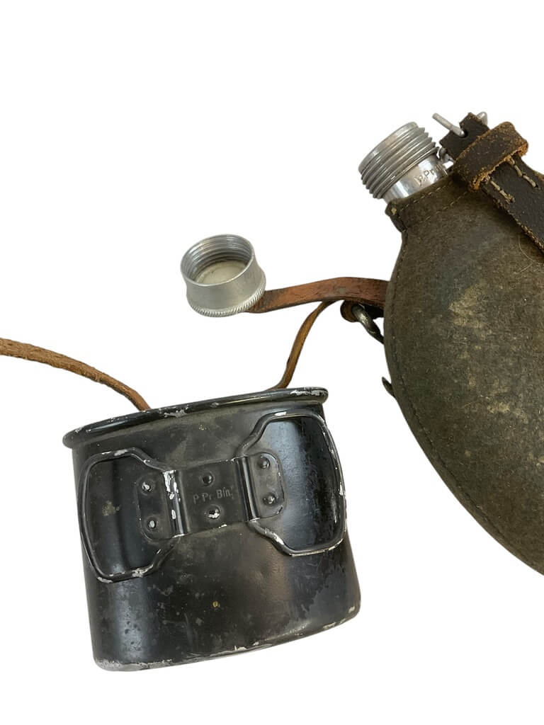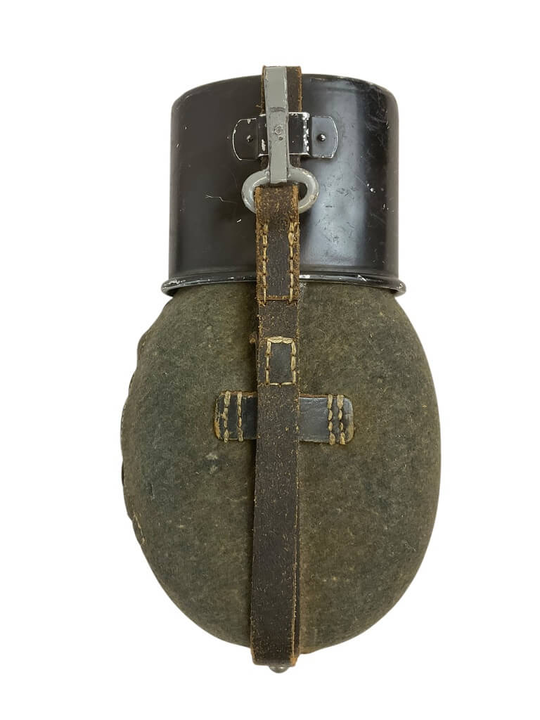 The ‘German Police Canteen and Cup’ set is a fascinating collection piece, aimed at military enthusiasts and history buffs alike. Originating from mid-20th century Germany, this set includes a sturdy, metal canteen and a matching cup, both designed to withstand the rigors of field use. The canteen, featuring a screw-on cap and a chain link to prevent loss, is wrapped in a felt cover to provide insulation and comfort. The cup fits snugly at the bottom of the canteen, making the set compact and easy to carry. The items bear the distinctive markings of the German police force of the period, adding to their historical authenticity. This set not only embodies practical design but also carries an intriguing historical narrative, making it a unique addition to any collection of military memorabilia.