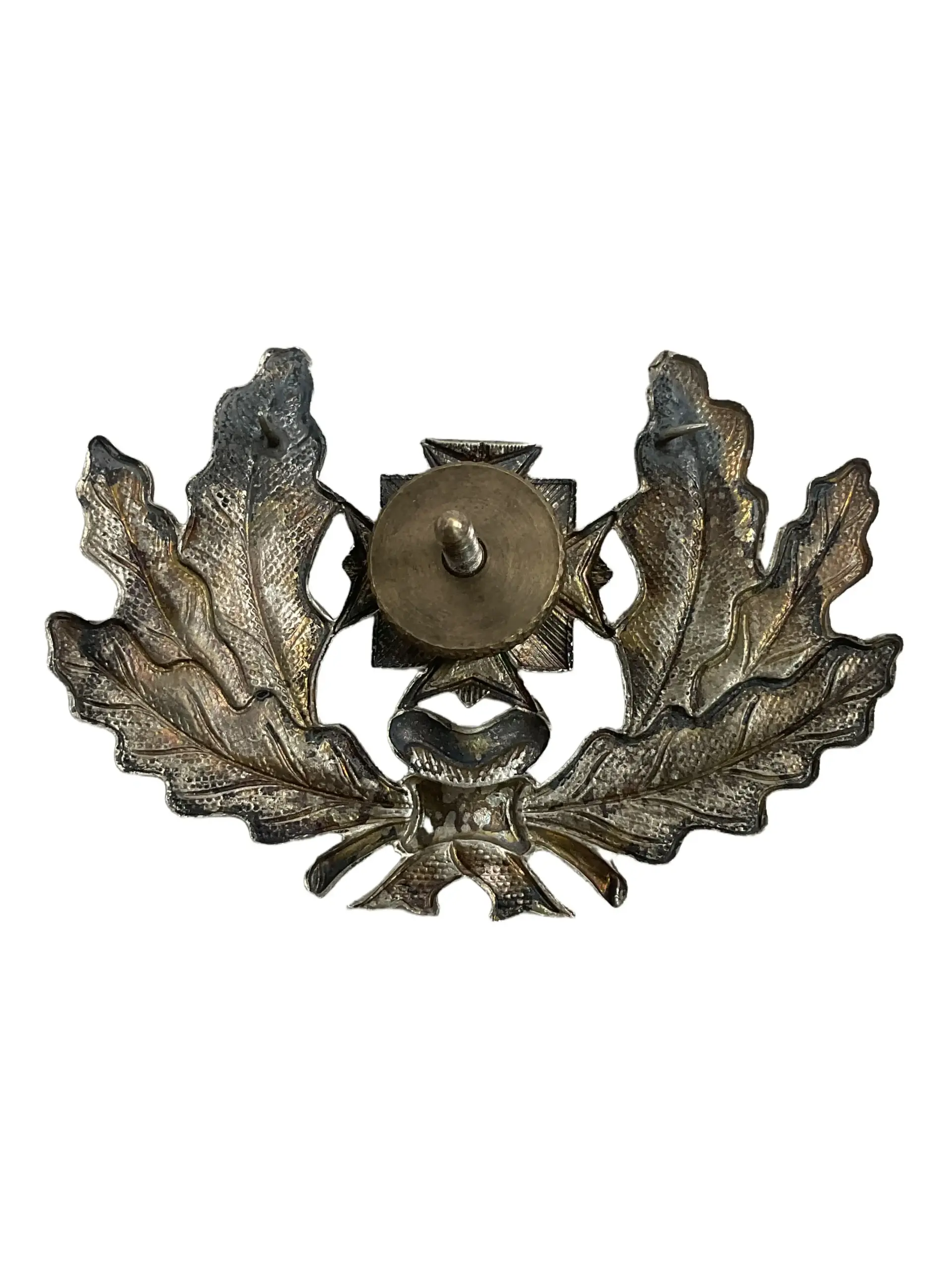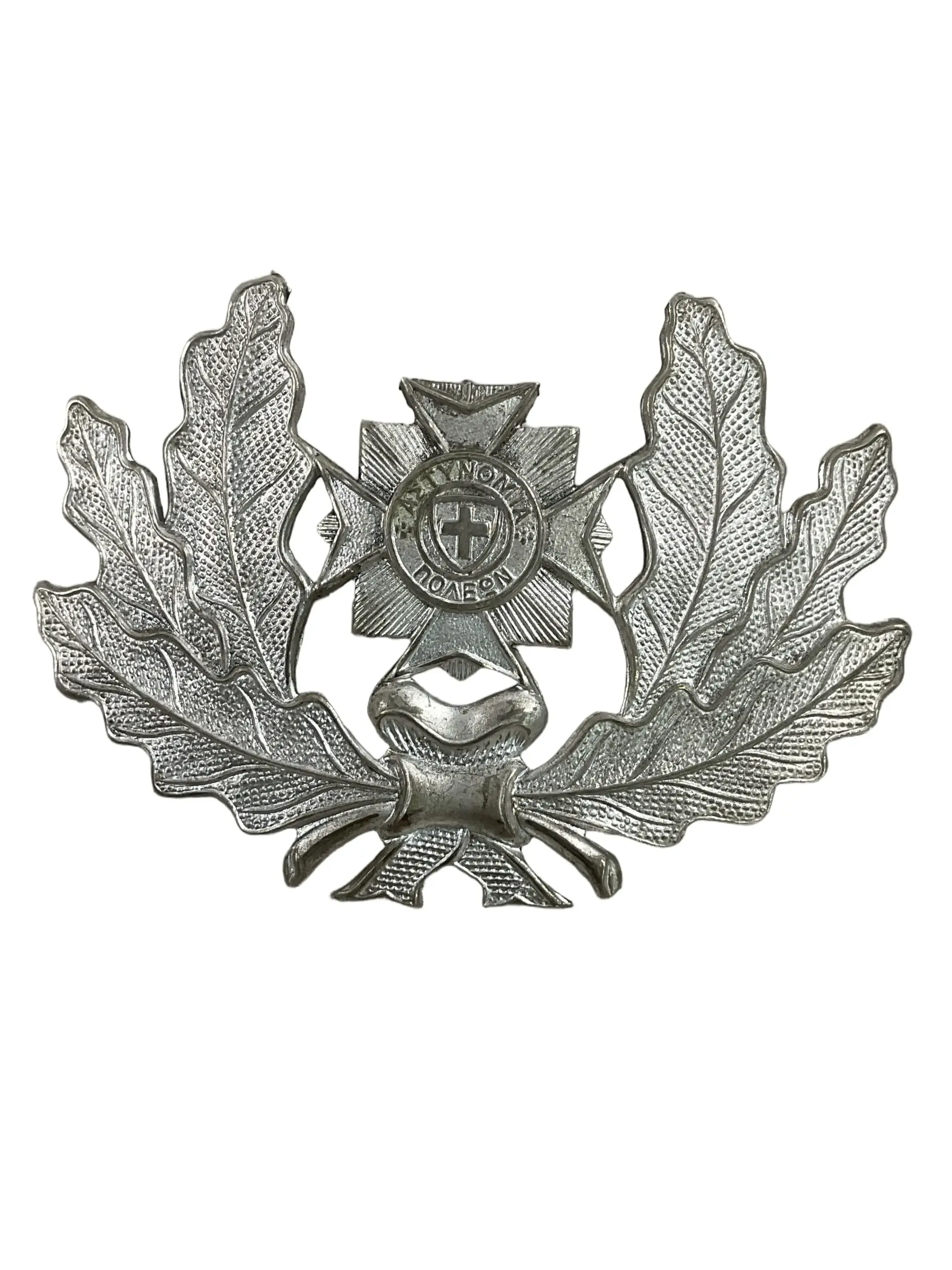 The Greek Police Cap Badge is a distinctive insignia used by law enforcement personnel in Greece. Typically crafted from metal, this badge features the national emblem, which commonly includes an image of a crossed laurel branch and sword, a central shield, and the words “Ελληνική Αστυνομία” (Hellenic Police) in Greek lettering. The cap badge is worn on the uniform cap, denoting official status and affiliation with the Greek police force. These badges may vary slightly in design depending on the era of issuance, specific branch, or rank. Historically, such items have been utilized by officers as part of their standard dress uniform, representing their official capacity and responsibility within the Greek state. The badge provides valuable insight for collectors and researchers interested in police insignia, Hellenic law enforcement history, or broader themes in European military and state paraphernalia. This item is suitable for study and display.