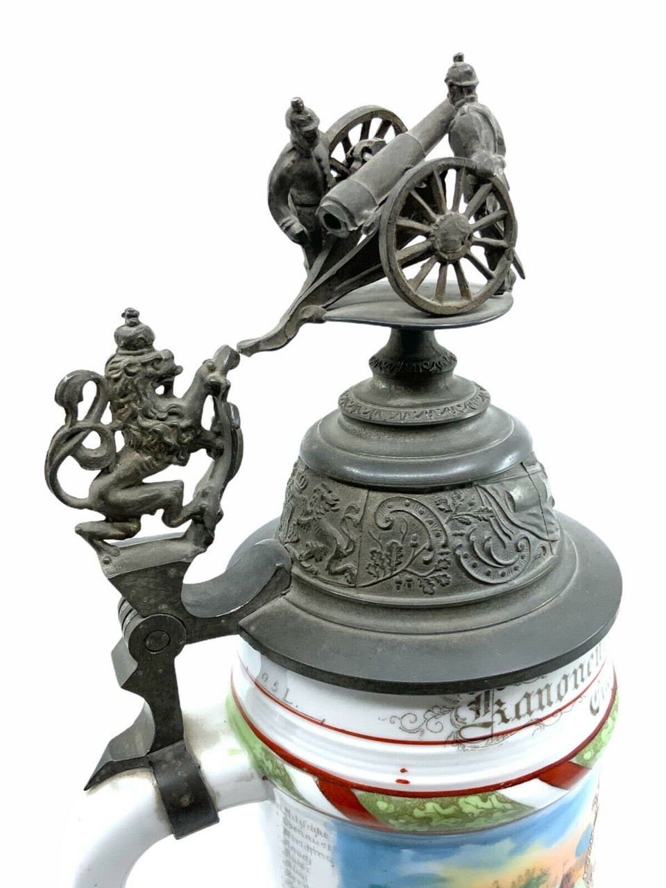 The Imperial German Field Artillery Regiment 25 1/2 Litre Beer Stein is a remarkable collector’s item that encapsulates a rich piece of military history. Crafted with intricate detail, this stein boasts traditional German artistry, featuring vivid hand-painted scenes and emblems that pay homage to the esteemed Field Artillery Regiment No. 25. The stein, capable of holding 1/2 litre of beer, is not only a functional piece but also a historical artifact, often adorned with regimental crests, dates of service, and names of soldiers who served. Its ornate pewter lid, often crowned with a finial or figurine representative of artillery motifs, adds a touch of elegance and authenticity. Perfect for history enthusiasts and collectors, this beer stein offers a tangible connection to the past, making it an exquisite addition to any collection of military memorabilia or German heritage items.