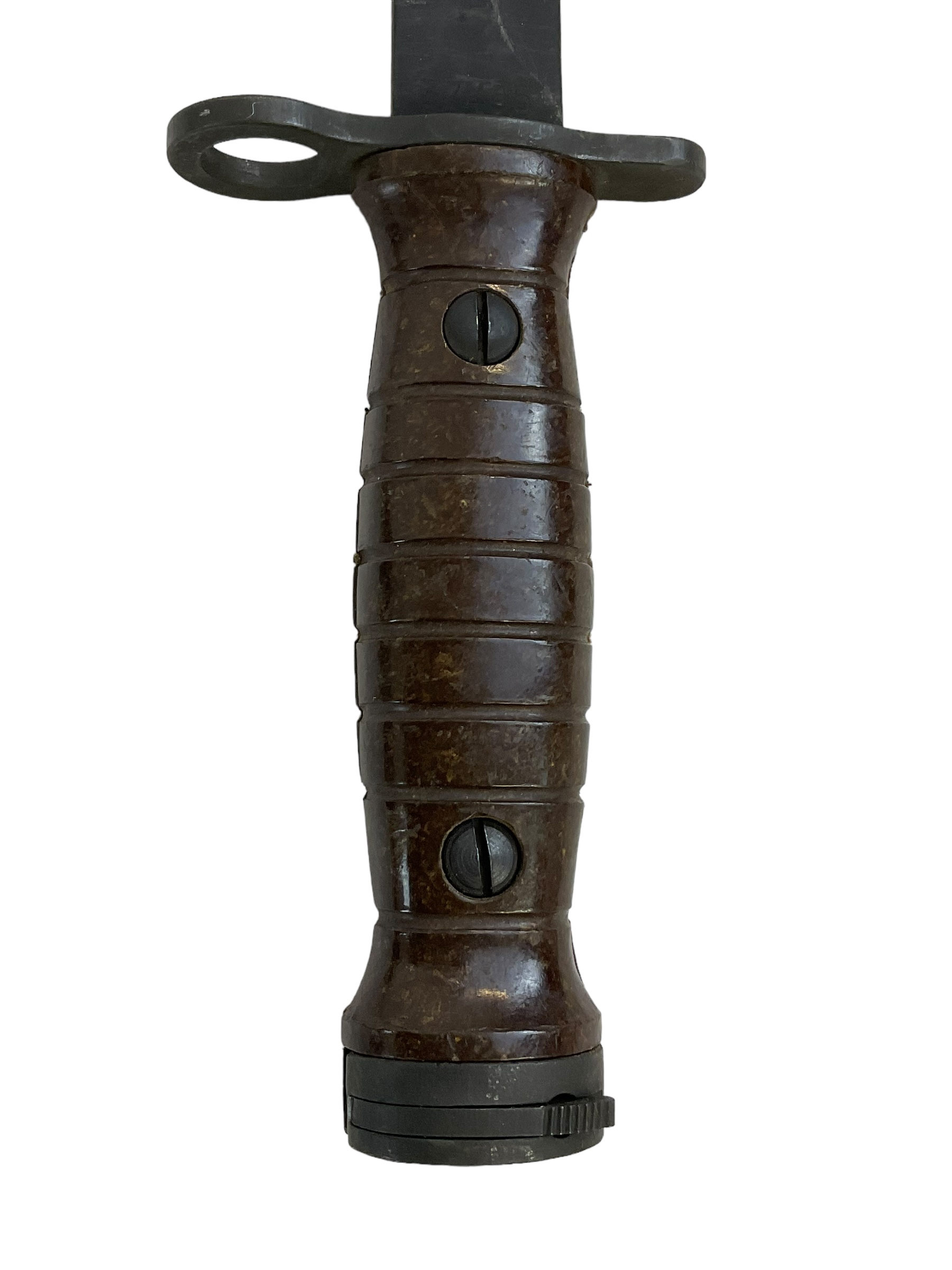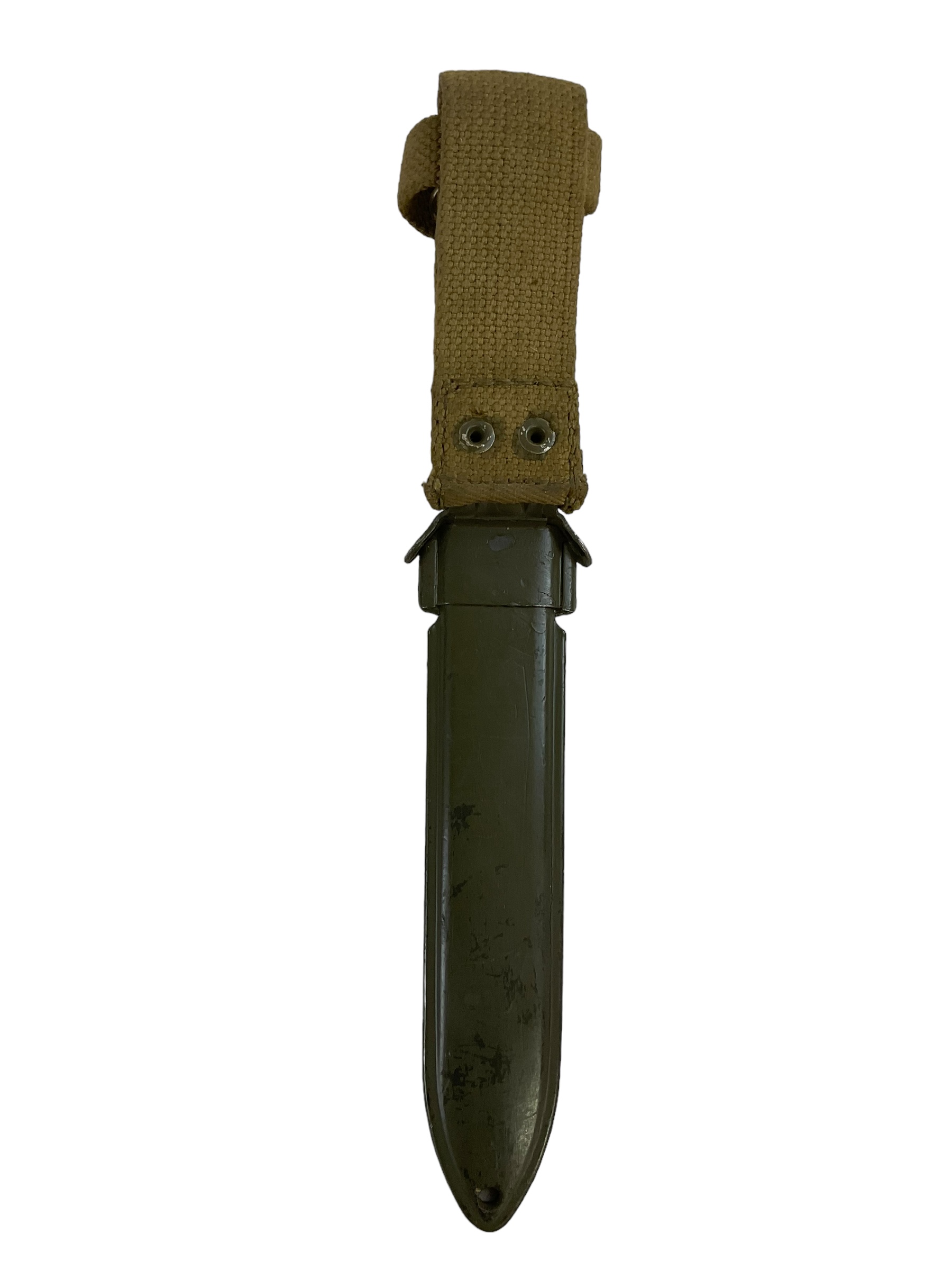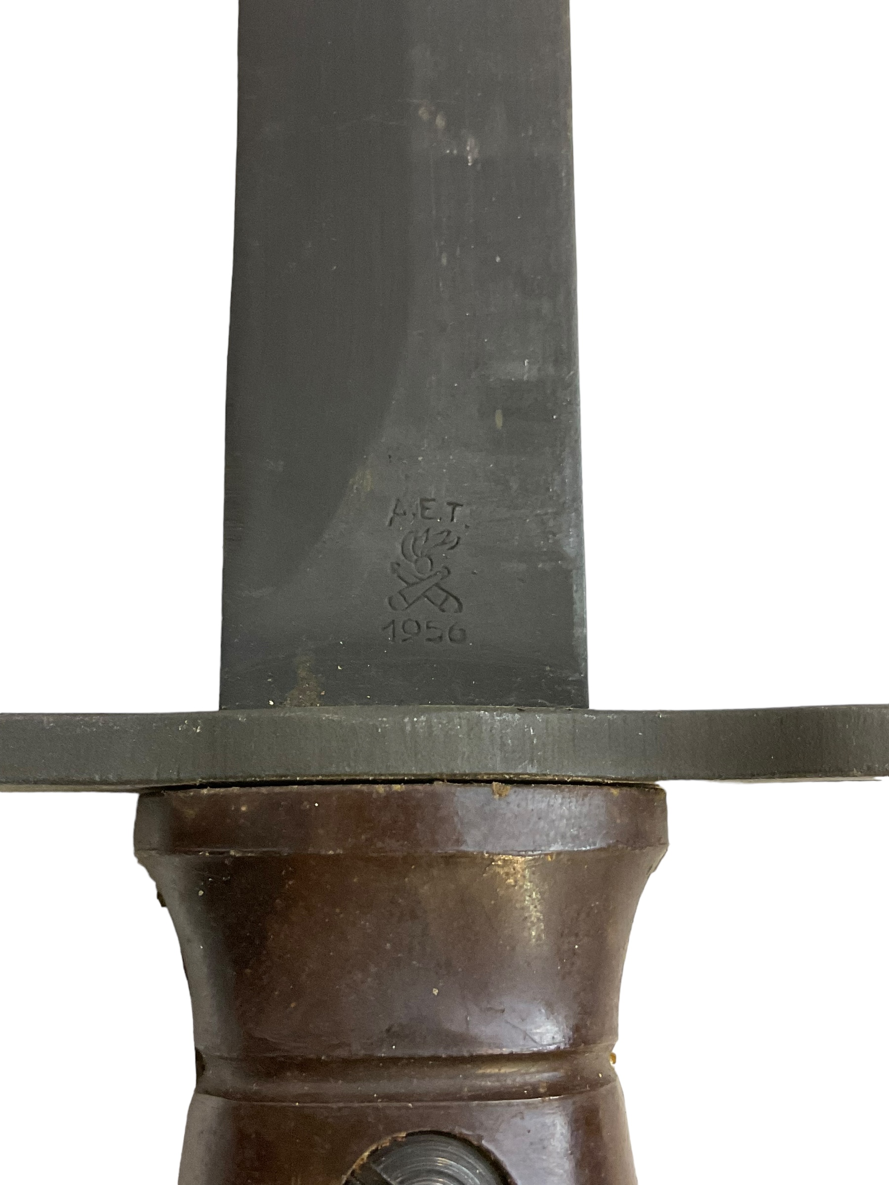 This collectible item is an Italian-made M1 Carbine bayonet, carefully dated from 1956, reflecting rich historical significance. The bayonet is a classic example of post-World War II military gear, originally designed to be mounted on the M1 Carbine rifle, a staple in military arsenals. Crafted in Italy, it showcases a robust and utilitarian design, indicative of the period’s manufacturing standards. The blade is well-preserved and retains much of its original sharpness and integrity. Included with the bayonet is its original scabbard, which has endured the years with minimal signs of wear, offering excellent protection and adding to the bayonet’s authentic appeal. This piece is ideal for collectors or enthusiasts of military history, providing a tangible connection to the mid-20th century era of Italian armament craftsmanship. Whether displayed as a part of a collection or studied for its historical value, this bayonet with scabbard stands as a testament to an important period in military tooling.