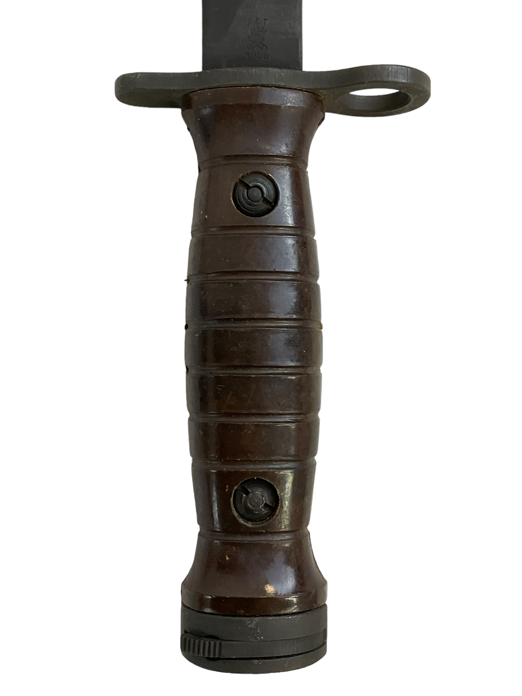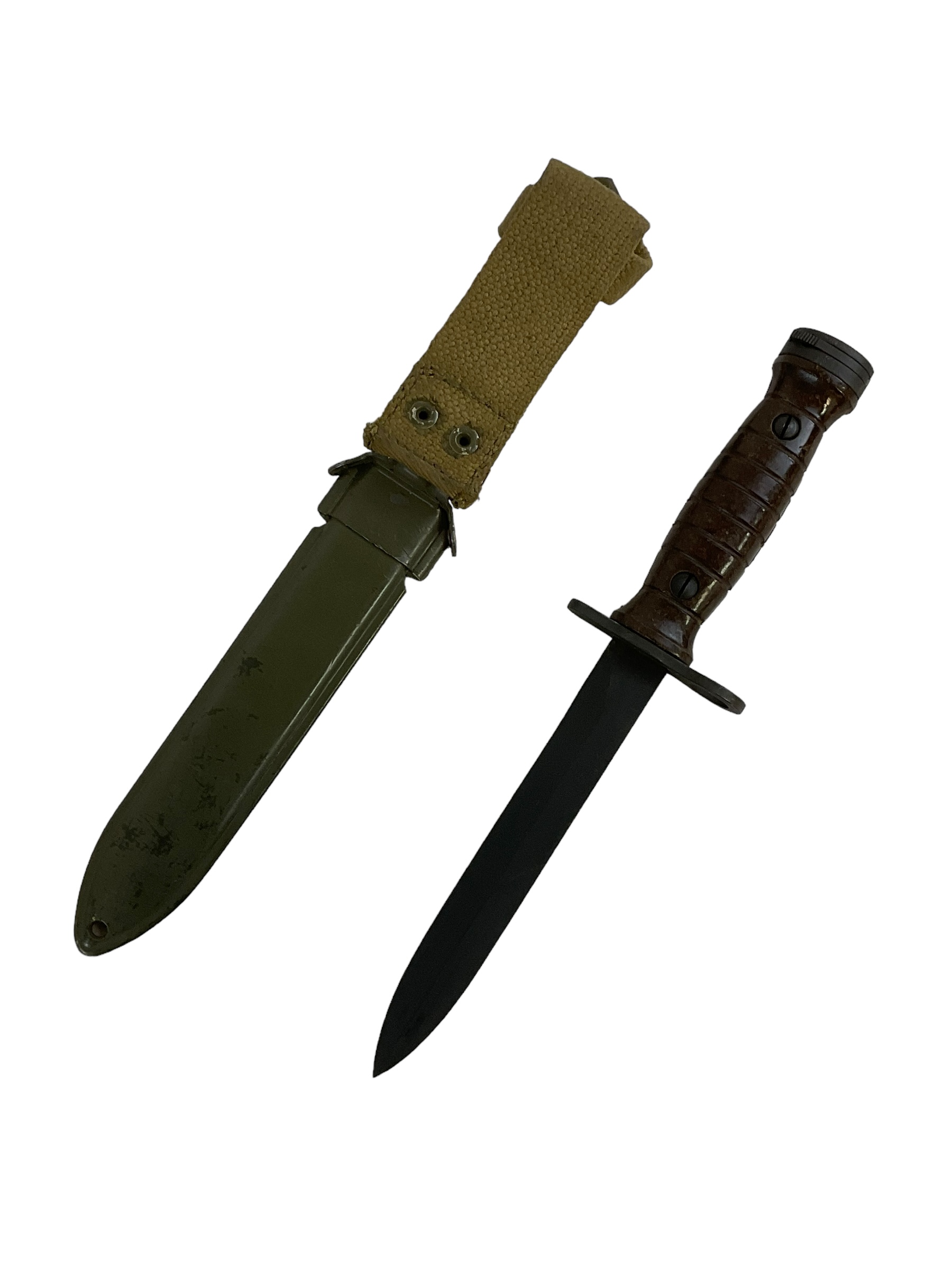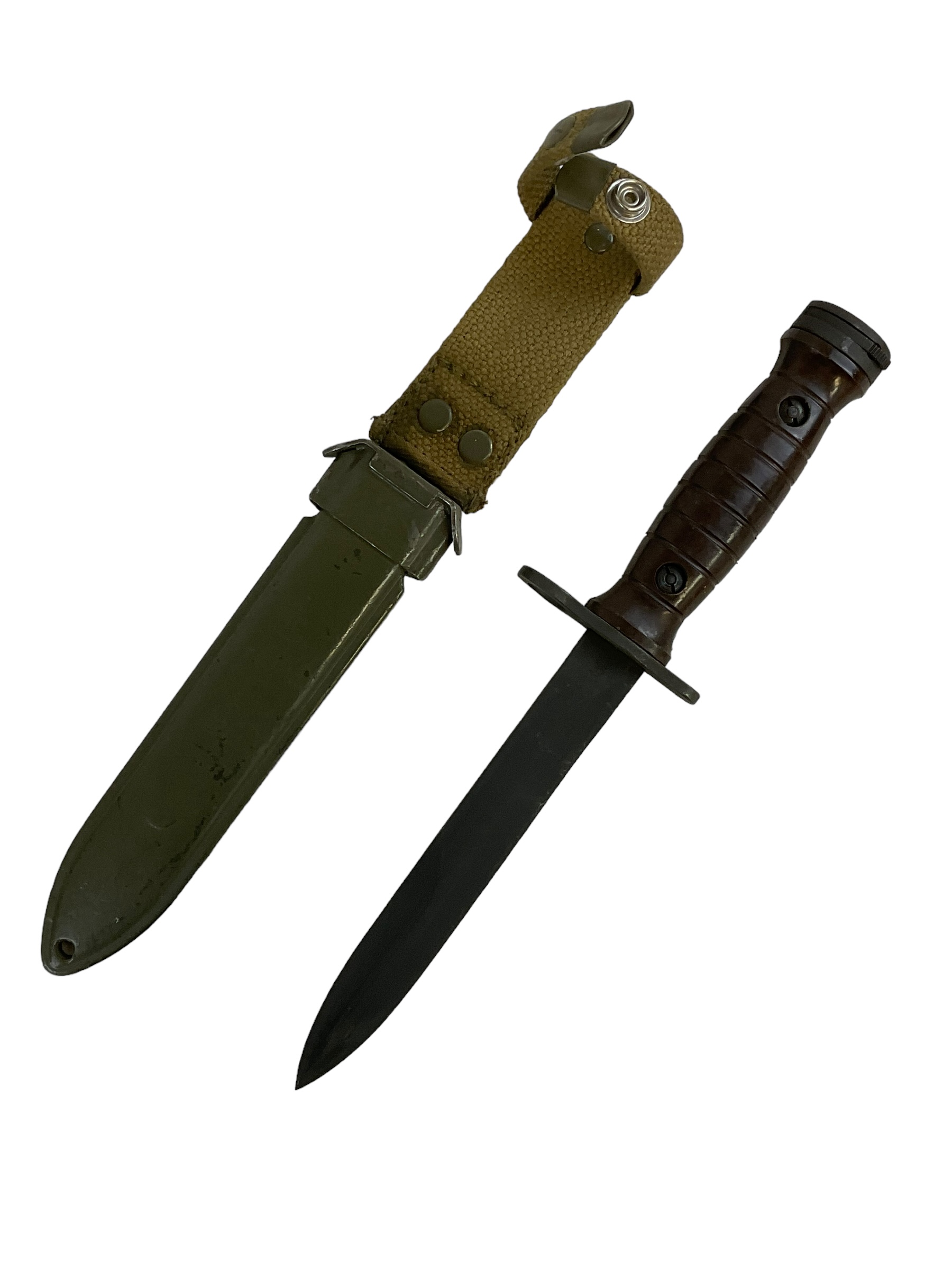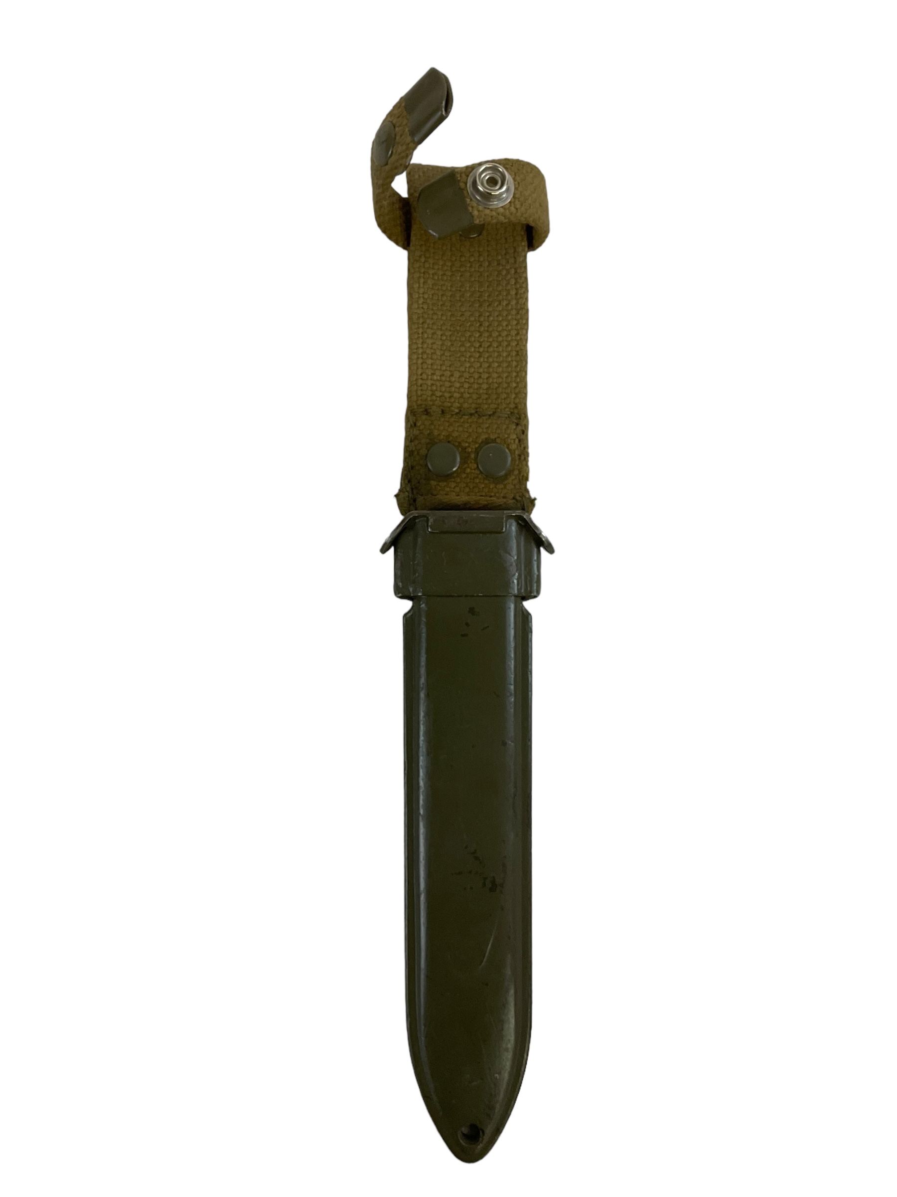 This collectible item is an Italian-made M1 Carbine bayonet, carefully dated from 1956, reflecting rich historical significance. The bayonet is a classic example of post-World War II military gear, originally designed to be mounted on the M1 Carbine rifle, a staple in military arsenals. Crafted in Italy, it showcases a robust and utilitarian design, indicative of the period’s manufacturing standards. The blade is well-preserved and retains much of its original sharpness and integrity. Included with the bayonet is its original scabbard, which has endured the years with minimal signs of wear, offering excellent protection and adding to the bayonet’s authentic appeal. This piece is ideal for collectors or enthusiasts of military history, providing a tangible connection to the mid-20th century era of Italian armament craftsmanship. Whether displayed as a part of a collection or studied for its historical value, this bayonet with scabbard stands as a testament to an important period in military tooling.