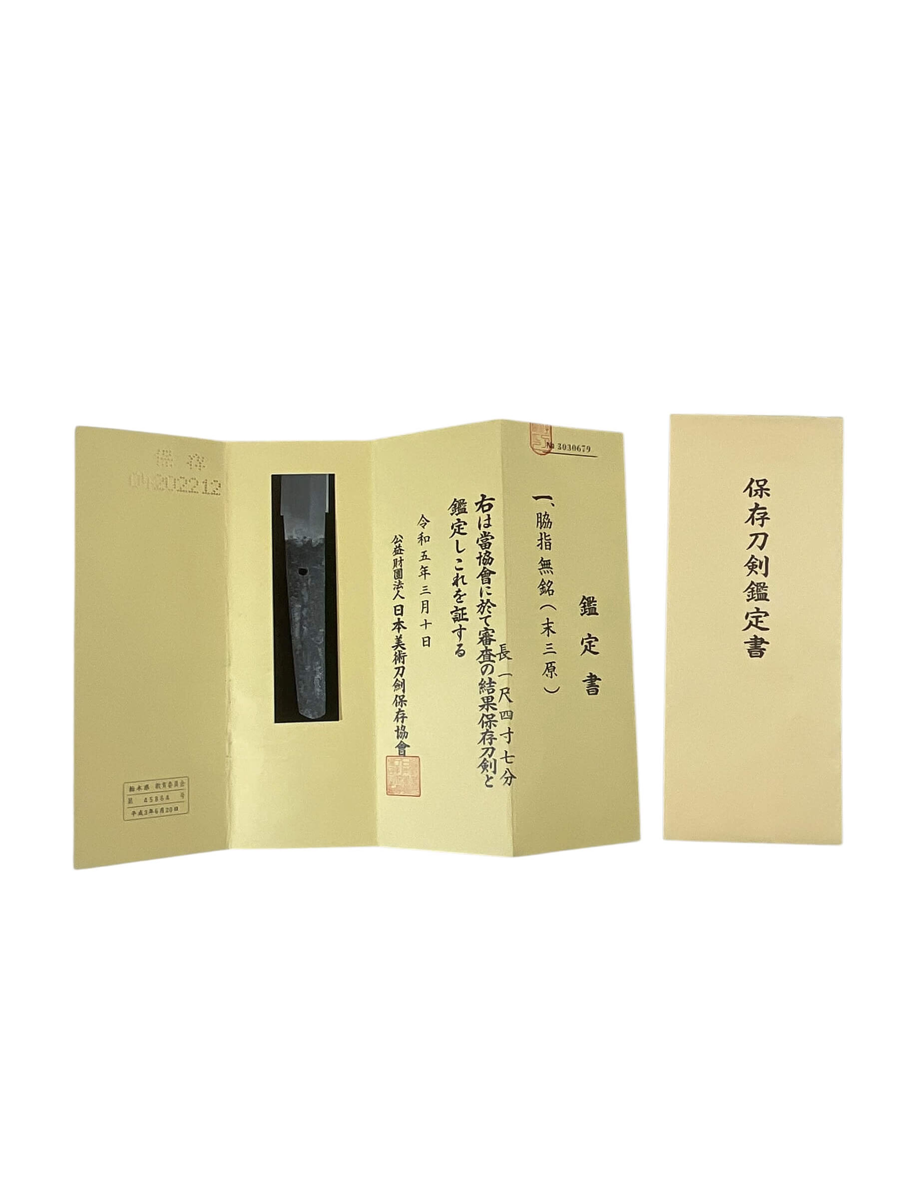 The Japanese Wakizashi is a traditional short sword that was commonly worn by samurai alongside the longer katana. This example dates to the Muromachi Period (1336–1573), a significant era in Japanese history marked by frequent conflict and widespread sword production. The blade measures typically between 30 to 60 centimeters in length and is characterized by its curved, single-edged design. This wakizashi comes with authentication papers, indicating official appraisal and verification of its historical period and origin. Features may include a hamon (temper line), tang signature (mei), and fittings such as the tsuba (guard) and tsuka (handle), which reflect Muromachi craftsmanship. Wakizashi were traditionally used for close-quarters combat or as a backup weapon and often served as a symbol of the samurai’s social status. This piece represents a functional and ceremonial artifact from a formative period in Japanese sword history.