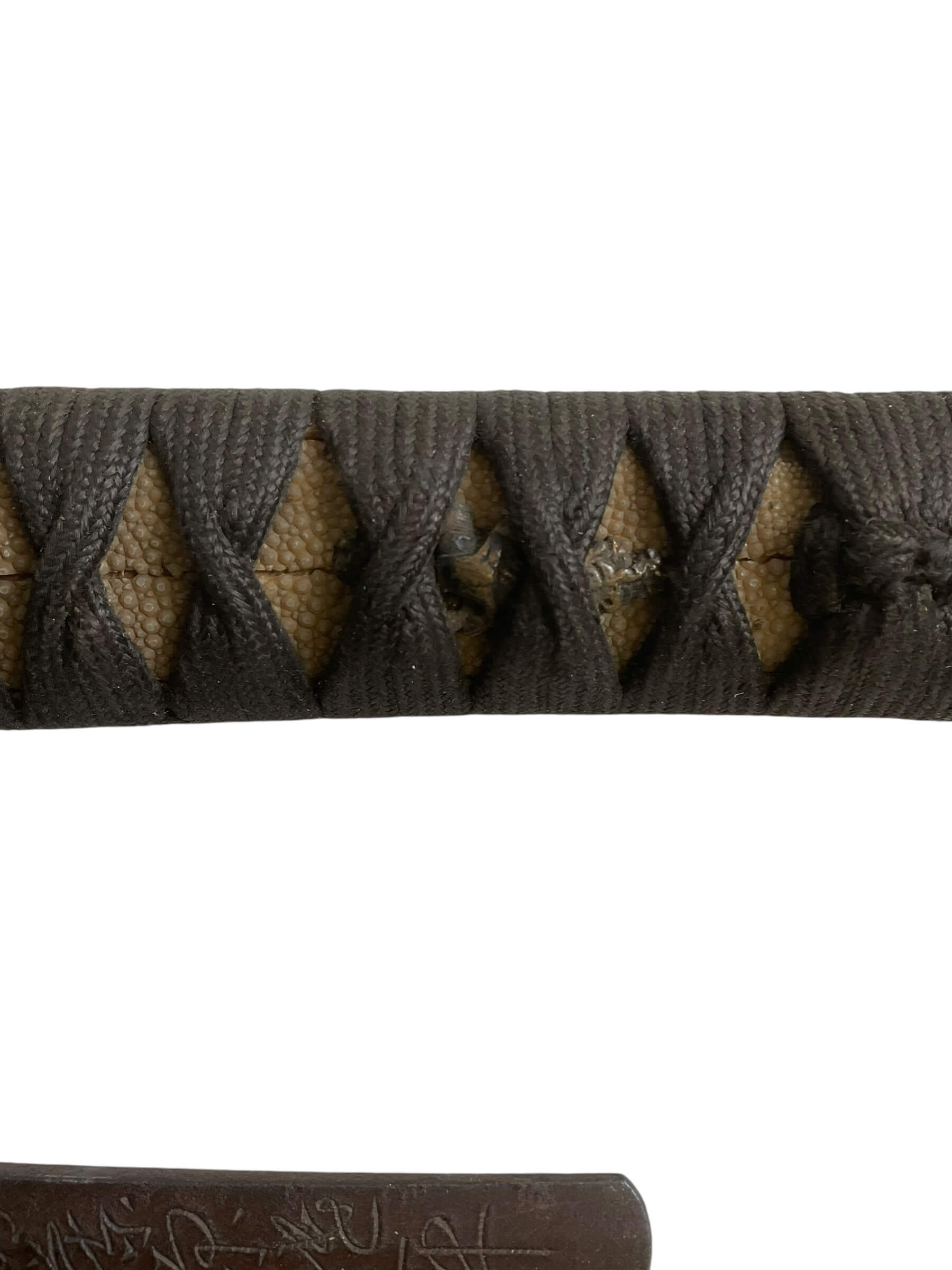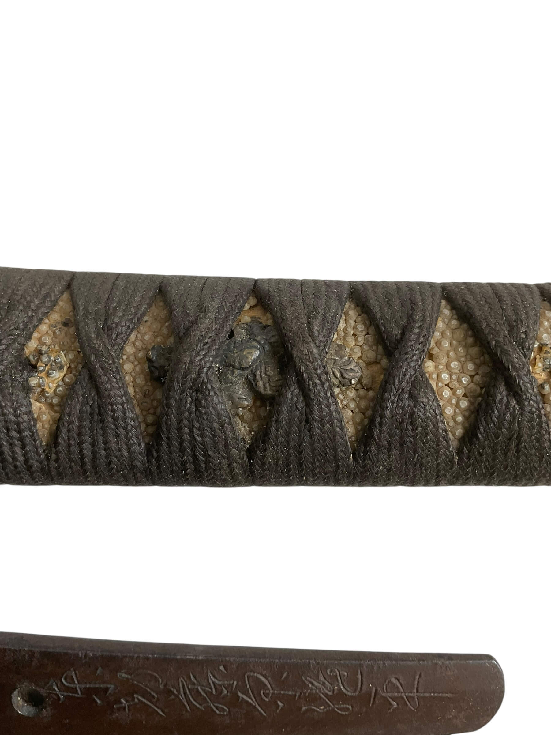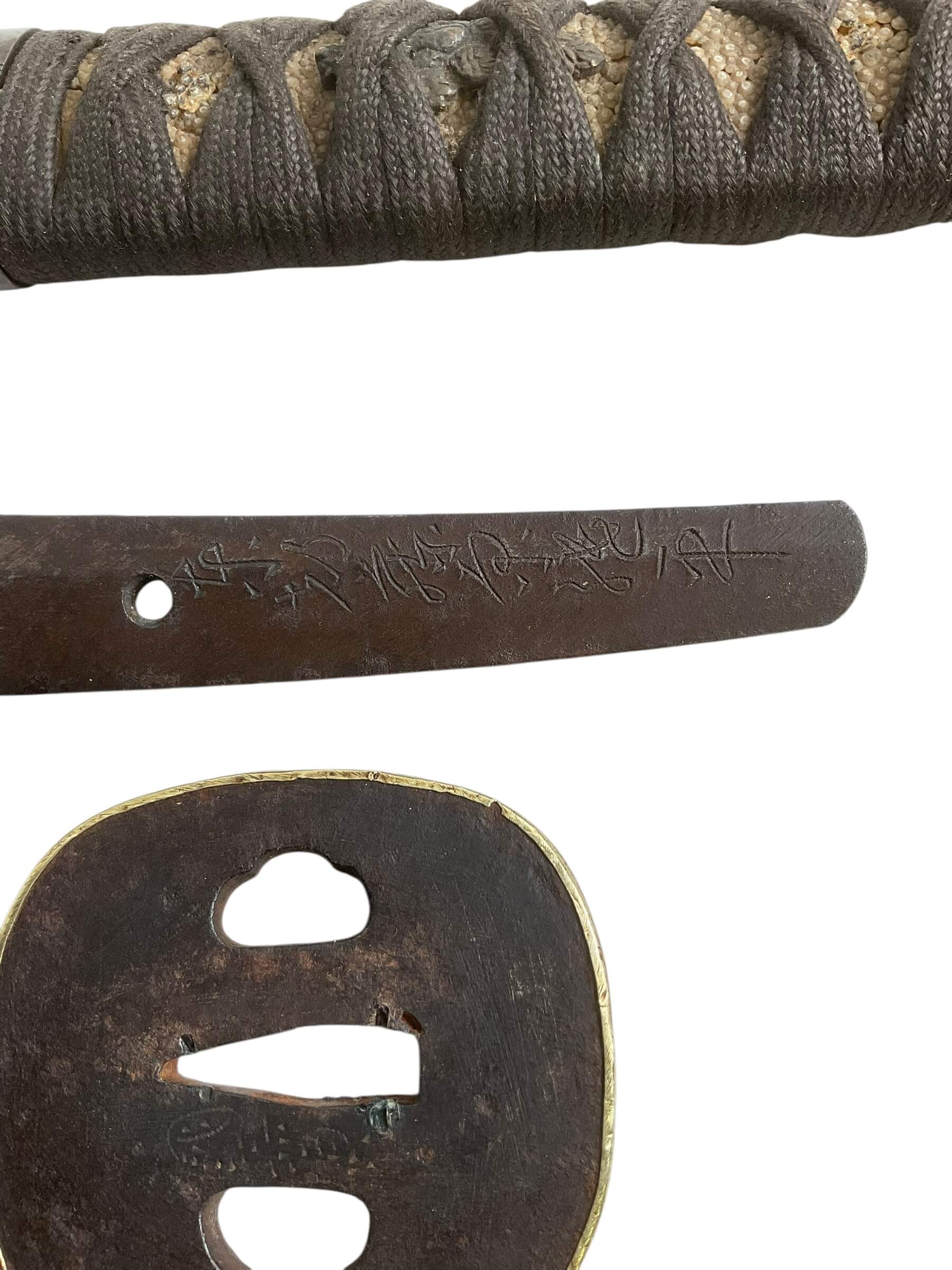 This Japanese Wakizashi Short Sword is a beautiful artifact of historical significance. It comes with a scabbard and is double signed, denoting the work of the swordsmith and the polisher. However, it lacks official documentation or papers. The sword’s elegant design and intricate detailing are a testament to the masterful craftsmanship of the period. The Wakizashi is traditionally used as a companion sword for the Samurai, often paired with a Katana. The blade is shorter, allowing for more convenient indoor use. The scabbard, or saya, is equally remarkable, crafted to protect and complement the sword. This double-signed Wakizashi is an authentic piece of Japanese history, perfect for collectors and enthusiasts alike. Please note the lack of papers does not devalue its historical relevance or craftsmanship, but rather adds a layer of intrigue and mystery to this splendid artifact.