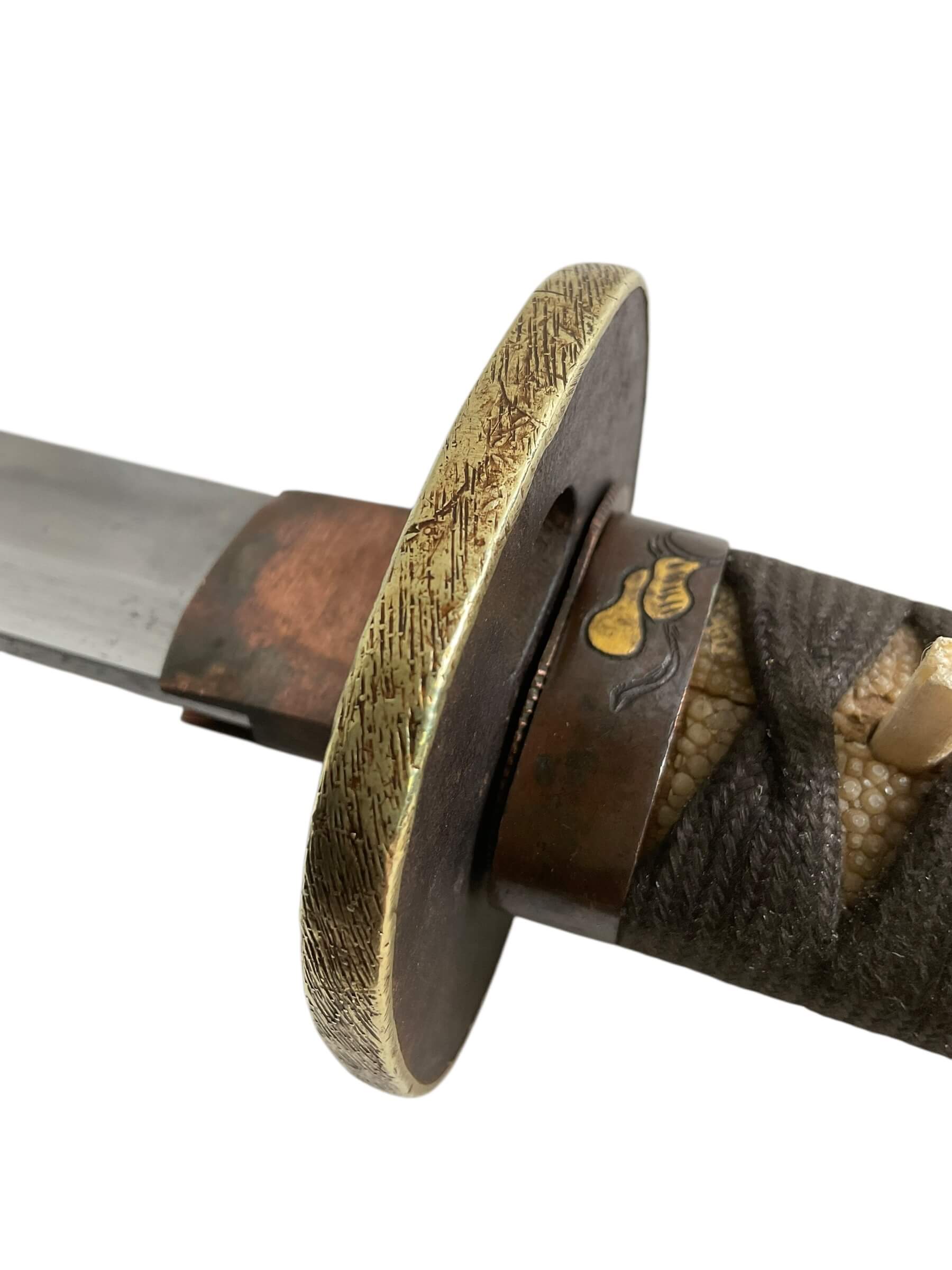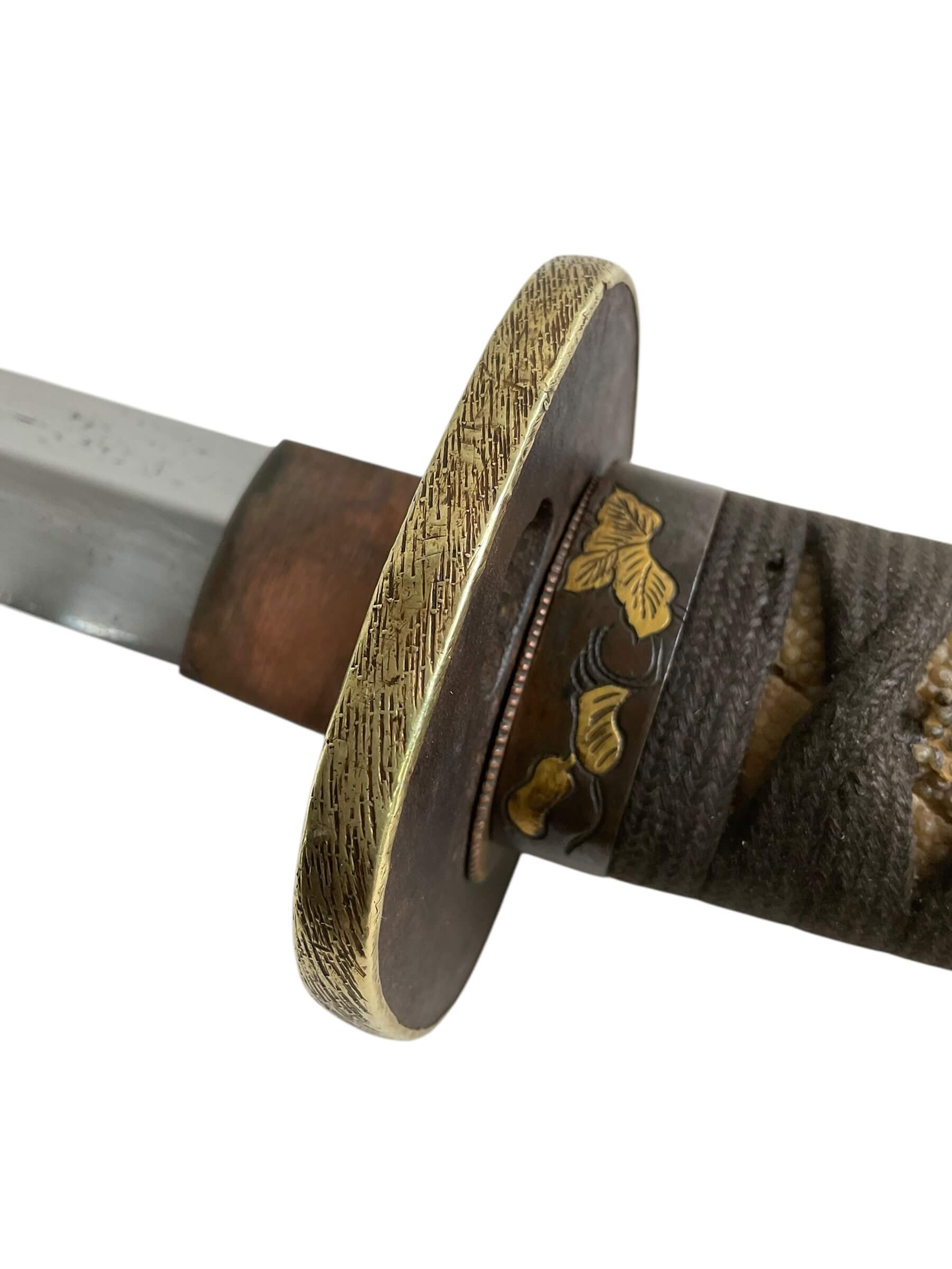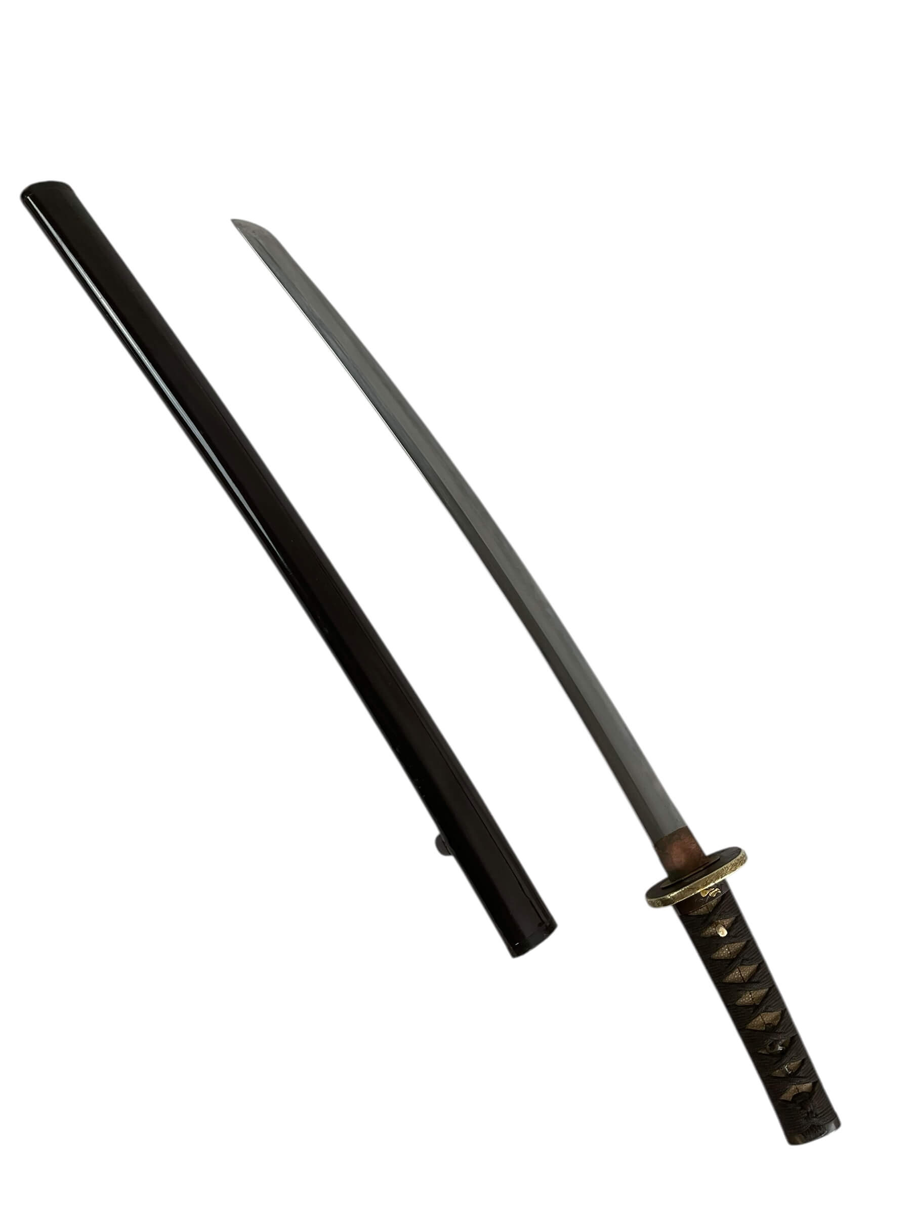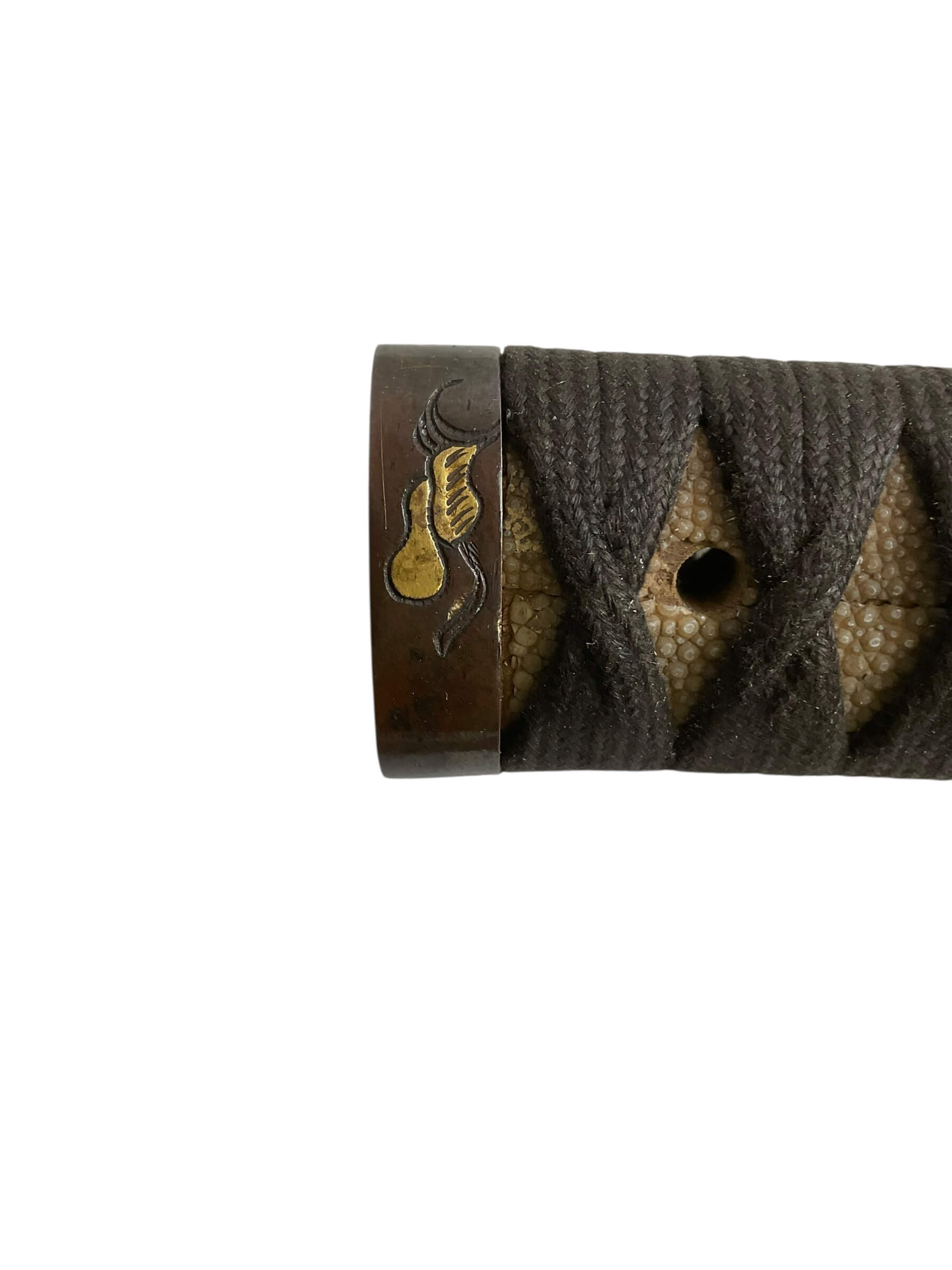 This Japanese Wakizashi Short Sword is a beautiful artifact of historical significance. It comes with a scabbard and is double signed, denoting the work of the swordsmith and the polisher. However, it lacks official documentation or papers. The sword’s elegant design and intricate detailing are a testament to the masterful craftsmanship of the period. The Wakizashi is traditionally used as a companion sword for the Samurai, often paired with a Katana. The blade is shorter, allowing for more convenient indoor use. The scabbard, or saya, is equally remarkable, crafted to protect and complement the sword. This double-signed Wakizashi is an authentic piece of Japanese history, perfect for collectors and enthusiasts alike. Please note the lack of papers does not devalue its historical relevance or craftsmanship, but rather adds a layer of intrigue and mystery to this splendid artifact.