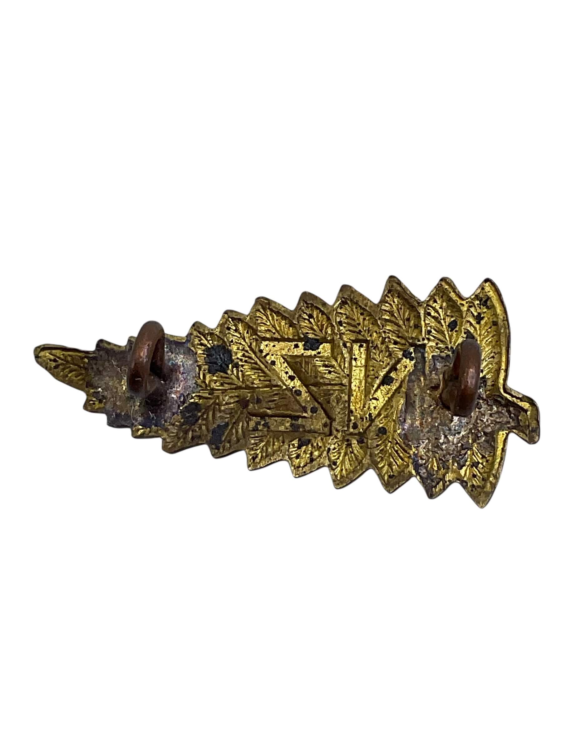 The Kings Colonel New Zealand Squadron Collar Insignia Single is a historical military uniform accessory associated with New Zealand forces, dating from the period of the British monarchy’s reign prior to the coronation of Queen Elizabeth II. This insignia was typically worn on the collar of the service uniform to denote rank or unit affiliation within a New Zealand Squadron. It is crafted from metal, often featuring period-specific designs such as the King’s Crown, which signifies its use before 1953. The detailing usually includes the squadron’s identifying motifs and may exhibit enamel or raised lettering, depending on the specific issue. The insignia’s construction reflects the military standards and insignia design conventions of the era. Such pieces are commonly collected as part of military history, uniform studies, or for the restoration of authentic period uniforms. This listing is for a single collar insignia; it is not a pair. Buttons, lugs, or other fastenings are present as issued.