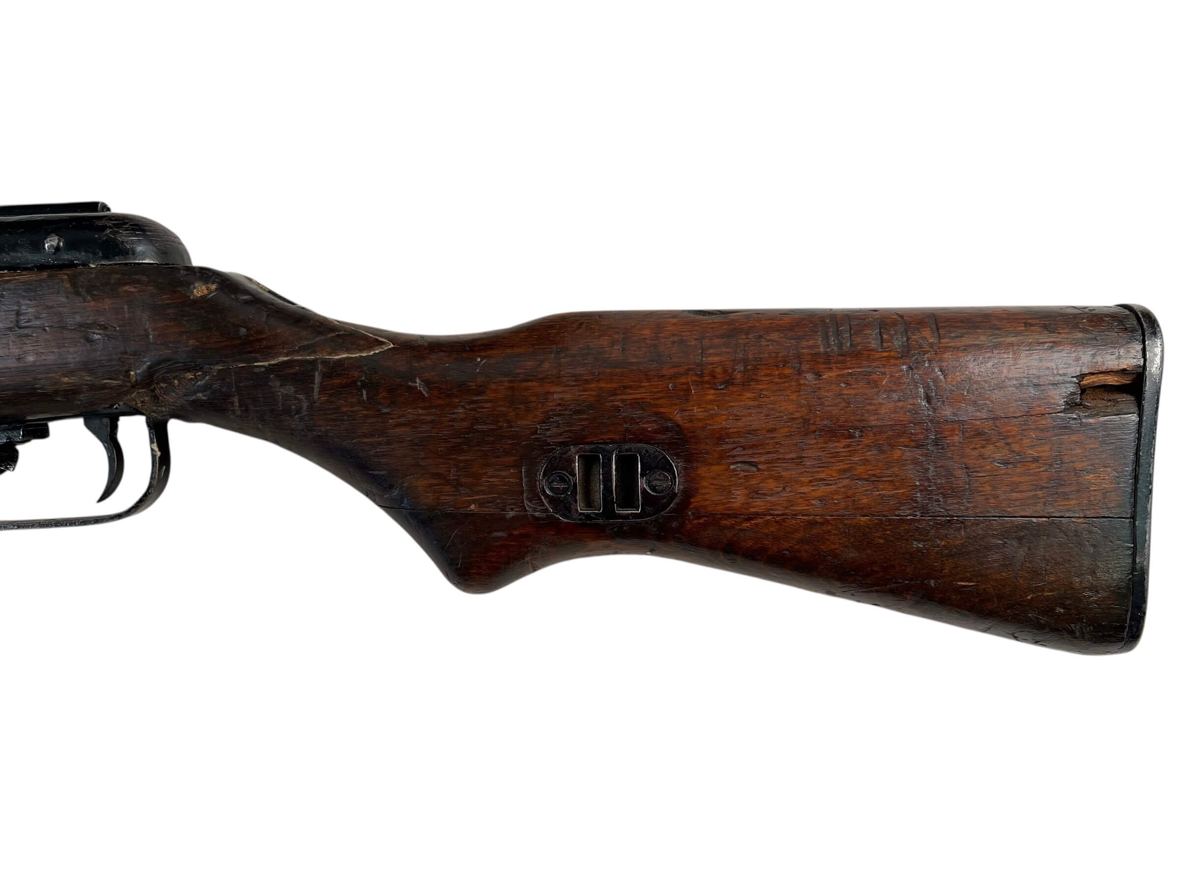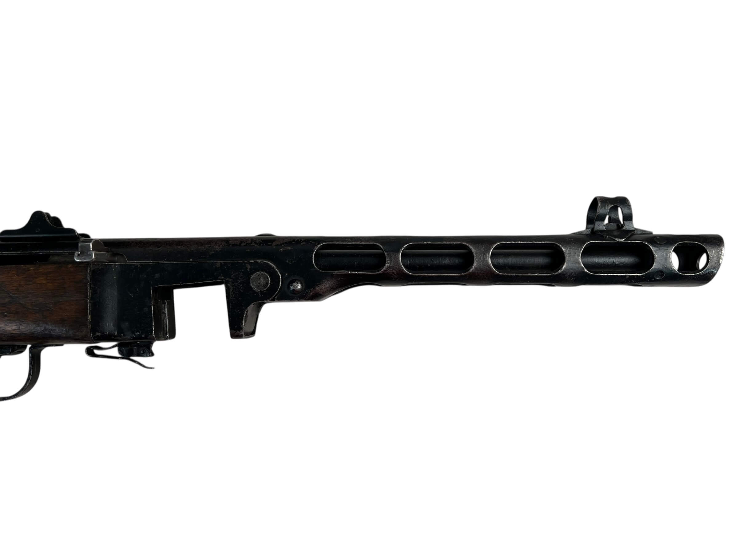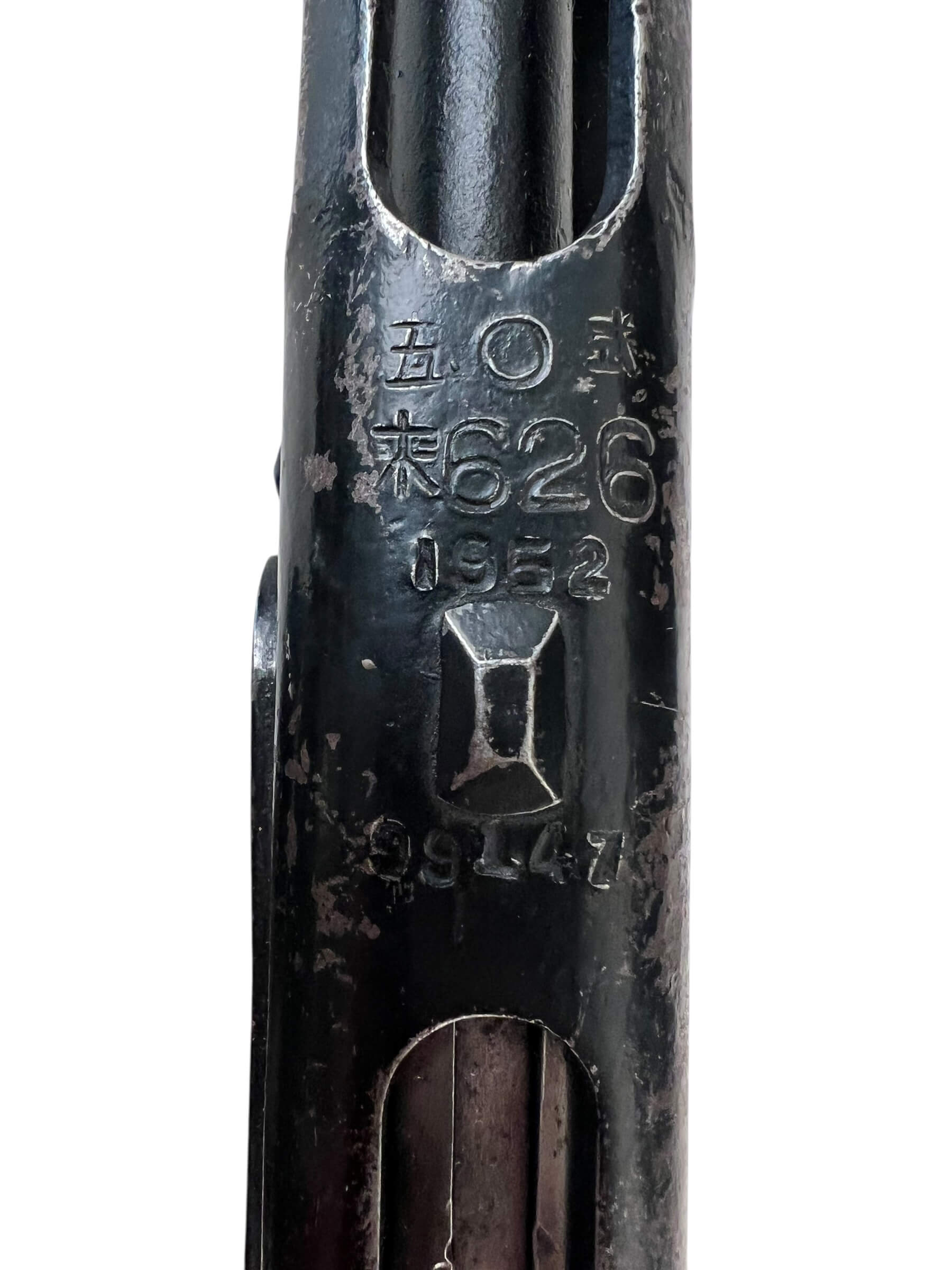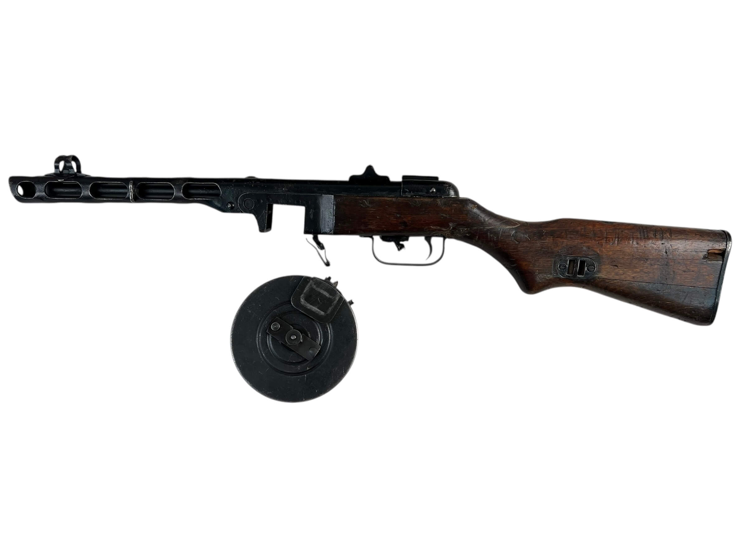 The Korean War Chinese PPSH Machine Gun dated 1952 is a deactivated (“DEWAT”) example of the Soviet-designed submachine gun produced by Chinese arsenals. The PPSH-41 was widely used by Chinese and North Korean forces during the Korean War, becoming a recognizable firearm of the conflict. This particular specimen, manufactured in 1952, features the typical design elements of the PPSH, including its wood stock, metal receiver, and characteristic ventilated barrel shroud. The firearm was originally chambered for the 7.62×25mm Tokarev cartridge and utilized a drum or stick magazine. As a DEWAT (Deactivated War Trophy), it has been rendered permanently non-functional in compliance with relevant legal standards, and is suitable for display purposes only. This item reflects the history of mid-20th-century small arms manufacturing in China, and provides a physical connection to the military matériel used during the Korean War era.