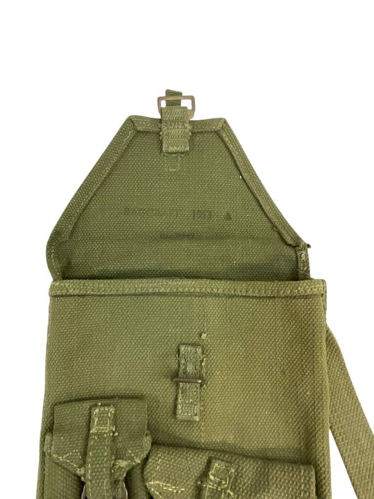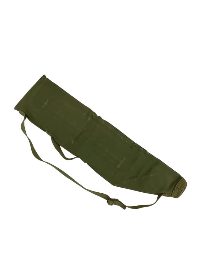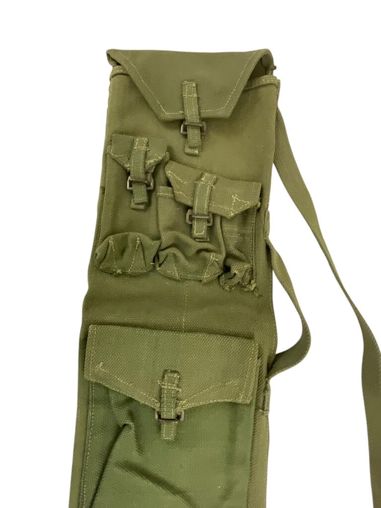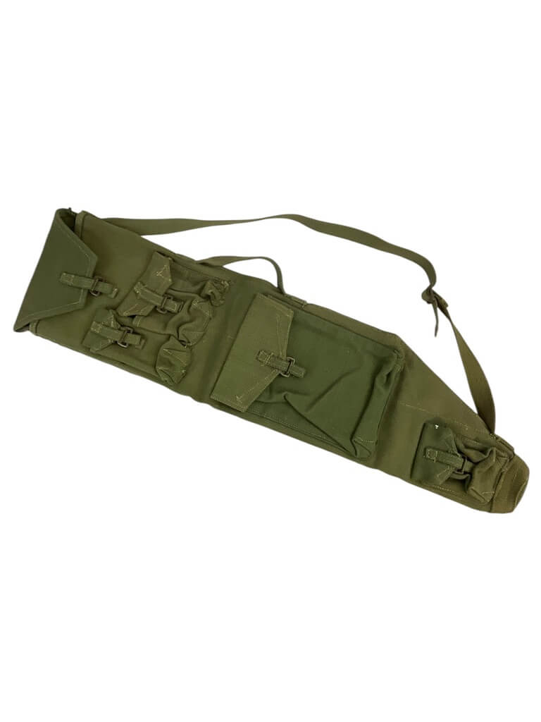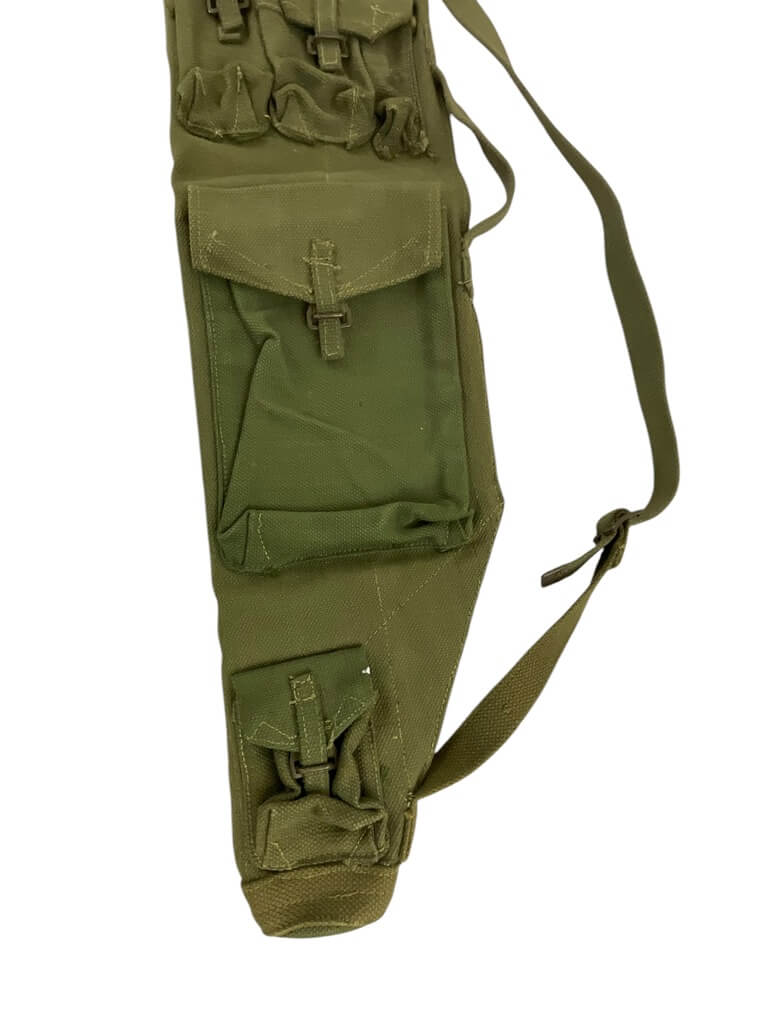 This product is a Korean War Era British Bren Gun Spare Barrel Carrier Bag, a crucial piece of military equipment used during the Korean War. The item served as a portable storage solution for spare barrels of the renowned British Bren Gun. Constructed with sturdy, durable materials, these bags were designed to withstand harsh field conditions, ensuring the safe transport and swift accessibility of vital weapon components. This particular model showcases the classic British military aesthetics, featuring a khaki-green exterior and robust straps for easy carrying. The bag is spacious, offering ample room for a Bren Gun barrel and additional necessities. As a vintage military collectable, it holds historical significance, making it a valuable addition to any collection or display. Despite its age, it remains in good condition, a testament to its quality craftsmanship. This authentic item provides a tangible link to the past, specifically to the tumultuous days of the Korean War.