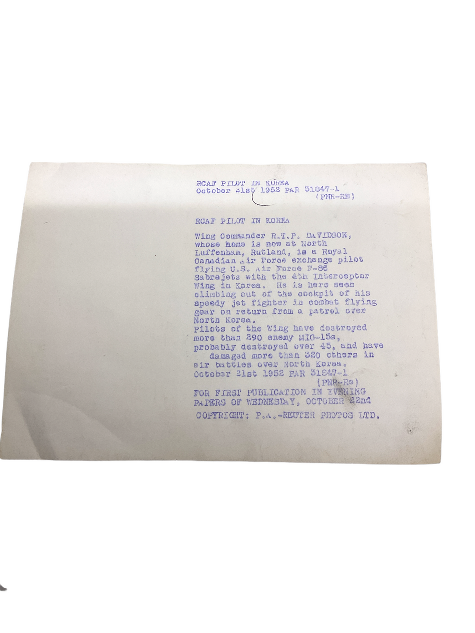 This captivating 8 x 6 portrait photograph captures a distinguished moment from the Korean War, featuring a Royal Canadian Air Force (RCAF) pilot from the reputable 4th Interceptor Wing. Posed confidently in front of the iconic F-86 Sabre, the pilot’s uniform and the aircraft’s detailing are rendered with striking clarity, reflecting the valor and prowess of the Canadian forces during this significant historical conflict. The image not only serves as a tribute to the bravery and skill of the RCAF pilots but also offers a rich visual reference for aviation enthusiasts and historians alike. Whether displayed as a piece of military heritage or studied for its historical significance, this photograph provides an evocative glimpse into the wartime experiences and contributions of the 4th Interceptor Wing during the Korean War.