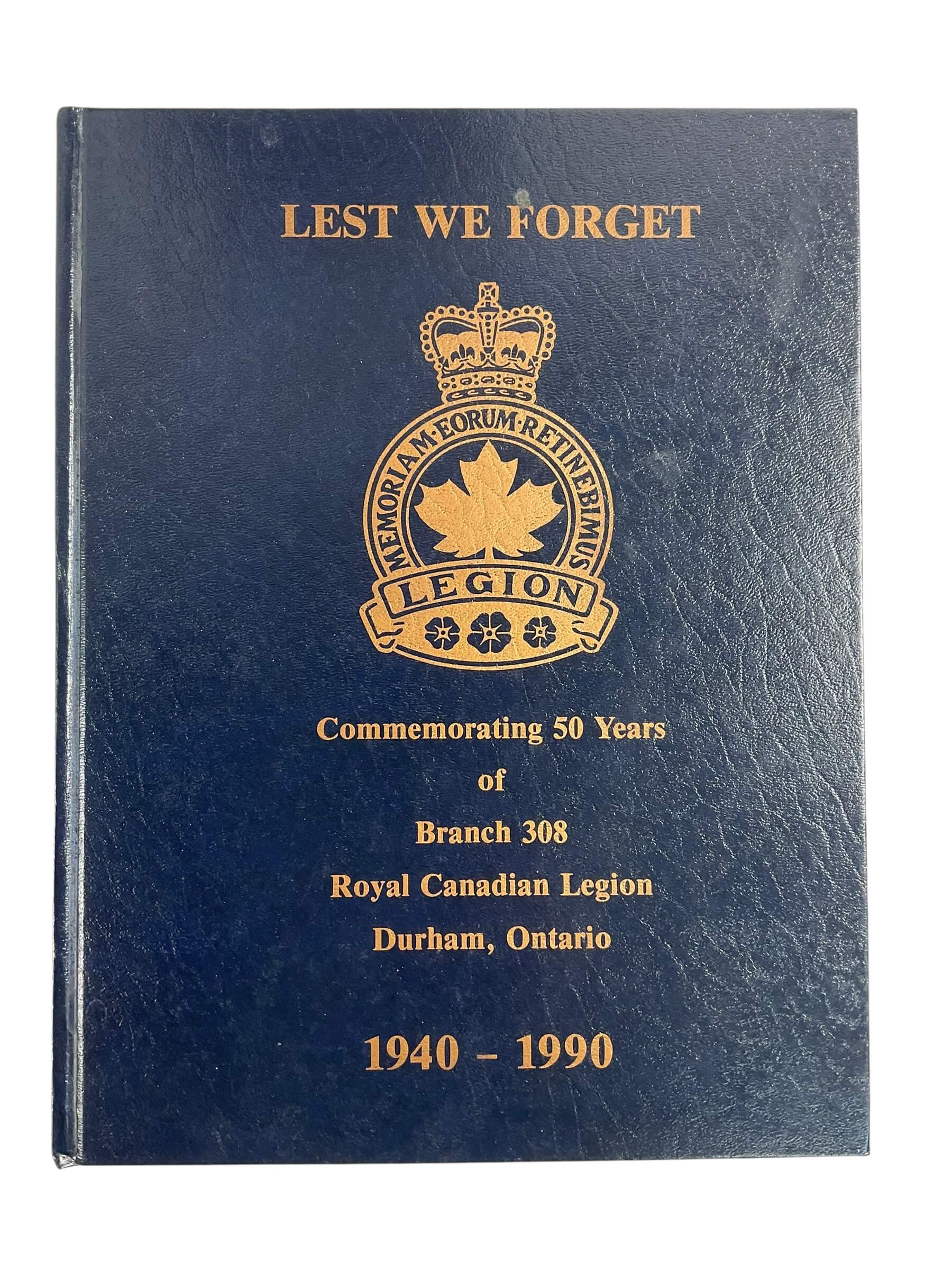 The “Lest We Forget 50 Year Commemorating Branch 308 Royal Canadian Legion Durham Ontario” is a used hardcover reference book. Published for the commemoration of the 50th year of Branch 308 of the Royal Canadian Legion in Durham, Ontario, the book provides a detailed historical account of the branch’s activities and milestones. Featuring numerous photographs and narratives, it is an invaluable