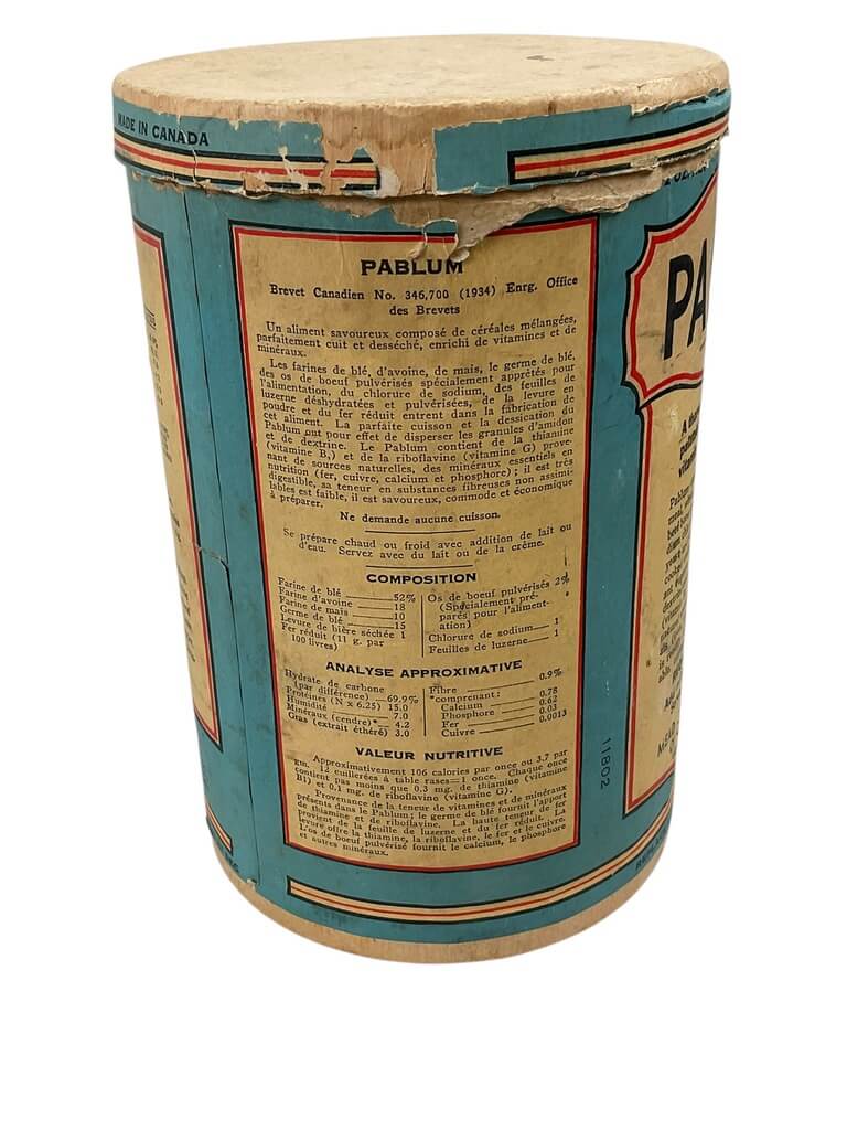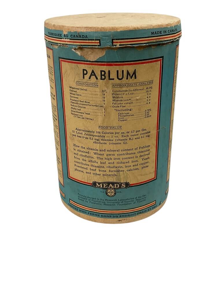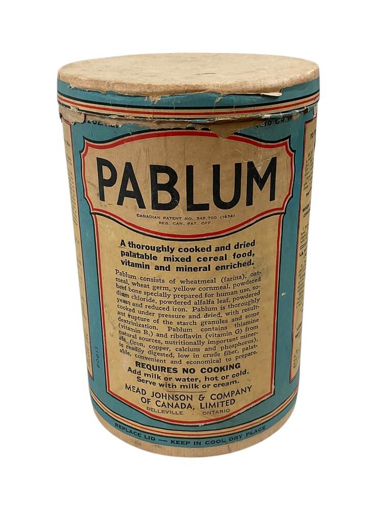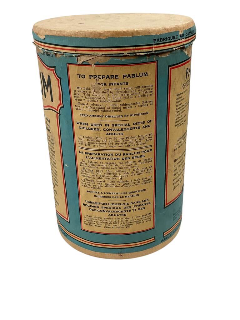 This item is an original Mead Johnson and Co. Pablum Oats Cardboard Box Canister from the 1930s. Although now empty, this vintage container once held Pablum oats, a popular baby food product in Canada in the early 20th century. This cylindrical cardboard canister, with its charmingly antiquated design, boasts a rich history. It features the original blue and white color scheme with the Mead Johnson logo prominently displayed. The canister also includes nutritional information and preparation instructions, which provide a glimpse into the period’s dietary practices for infants. Despite its age, the canister is in relatively good condition, making it a valuable collector’s item. This piece is not just a container, but a slice of Canadian history, offering insight into the domestic life and consumer culture of the 1930s. It’s a must-have for antique enthusiasts and historians alike.