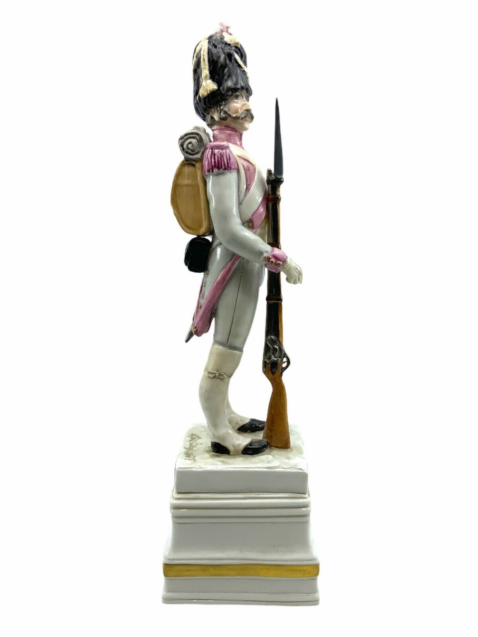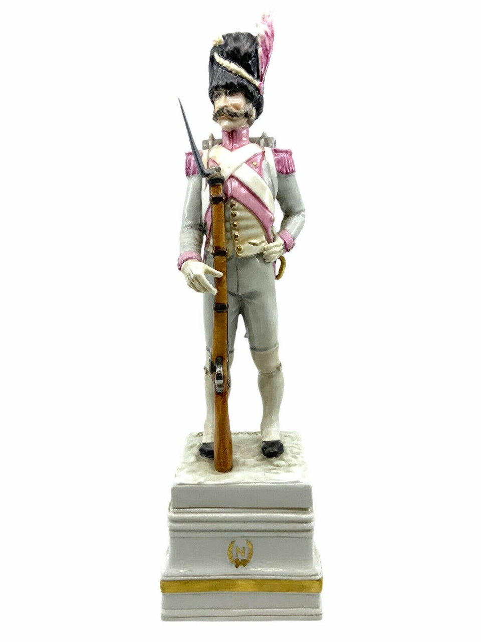 Introducing the exquisitely crafted ‘Napoleonic Netherlands Hollandais Grenadier Porcelain Figure’, standing at an impressive 12 inches tall. This finely detailed collector’s item captures the essence of the Napoleonic era, depicting a proud Dutch Grenadier in full regalia. Meticulously handcrafted from high-quality porcelain, the figure showcases the impeccable artistry and attention to detail synonymous with historical sculptures of this caliber. The Grenadier’s uniform is adorned with accurate period-specific elements, from the ornately designed shako to the intricately painted buttons and epaulets. An ideal addition for history enthusiasts, military collectors, or anyone with an appreciation for the rich heritage of the Napoleonic Netherlands. Display this striking porcelain figure in your home or office to evoke admiration and spark conversations about the gallant days of the past.