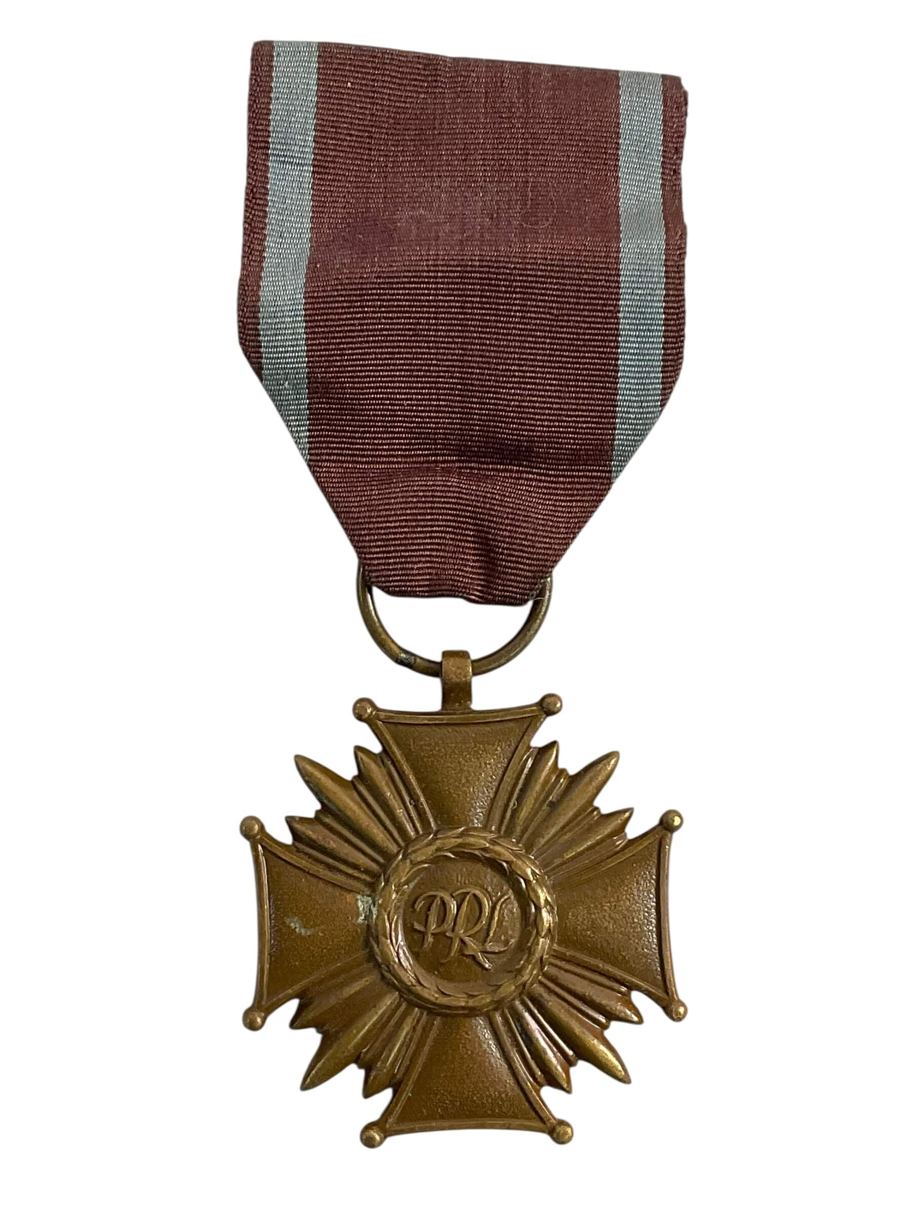 The Poland Polish Bronze Cross of Merit Full Size is an official Polish state decoration instituted in 1923. It is awarded to individuals for exemplary public service or acts that contribute significantly to society, particularly in the realms of charity, education, social work, or defense of the country. The decoration features a bronze Greek cross with smooth arms. At the center of the cross is a round medallion displaying the Polish eagle, surrounded by a laurel wreath symbolizing honor and achievement.  The cross is suspended from a ribbon of red with blue stripes along each edge. This full-size version is intended for formal wear on military or civil dress uniforms. The Bronze Cross of Merit is part of a three-grade order, which also includes Silver and Gold versions, reflecting varying levels of recognized contributions.