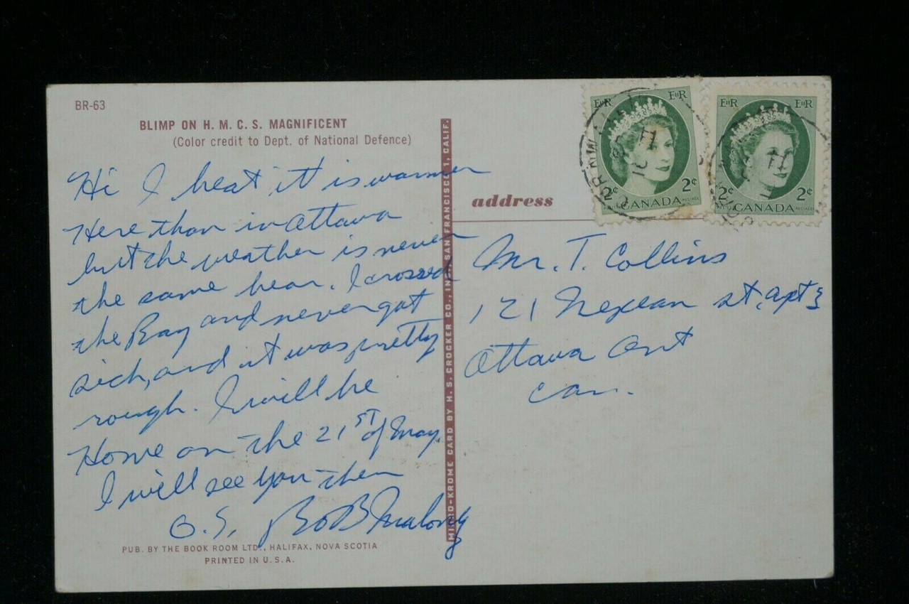 A used Post WW2 Canadian RCN Blimp On HMCS Magnificent Vintage Post Card. Approx size is 3.5 x 5.5.